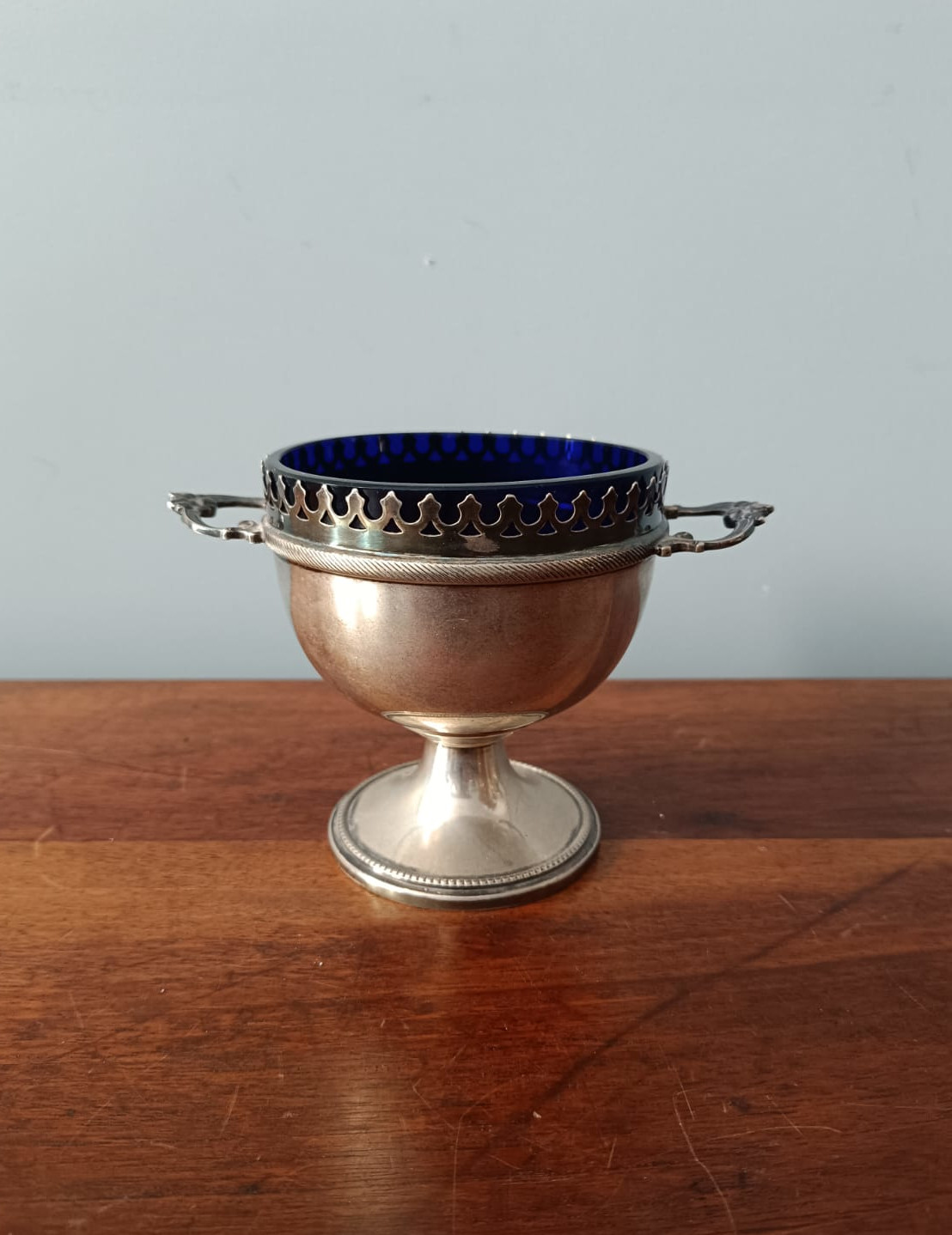 Antica saliera in argento con cristallo blu dei primi del Novecento in ottime condizioni.