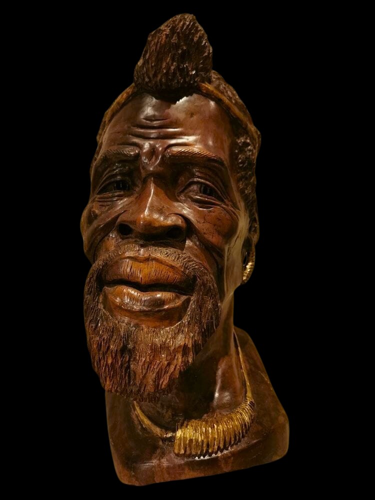Esploriamo la maestria e la bellezza di una grande scultura lignea risalente alla fine dell'800, raffigurante la testa di un africano con decori dorati. Questa scultura non è solo un pezzo d'arte; è un simbolo di un'epoca e di una cultura, un ponte tra passato e presente.