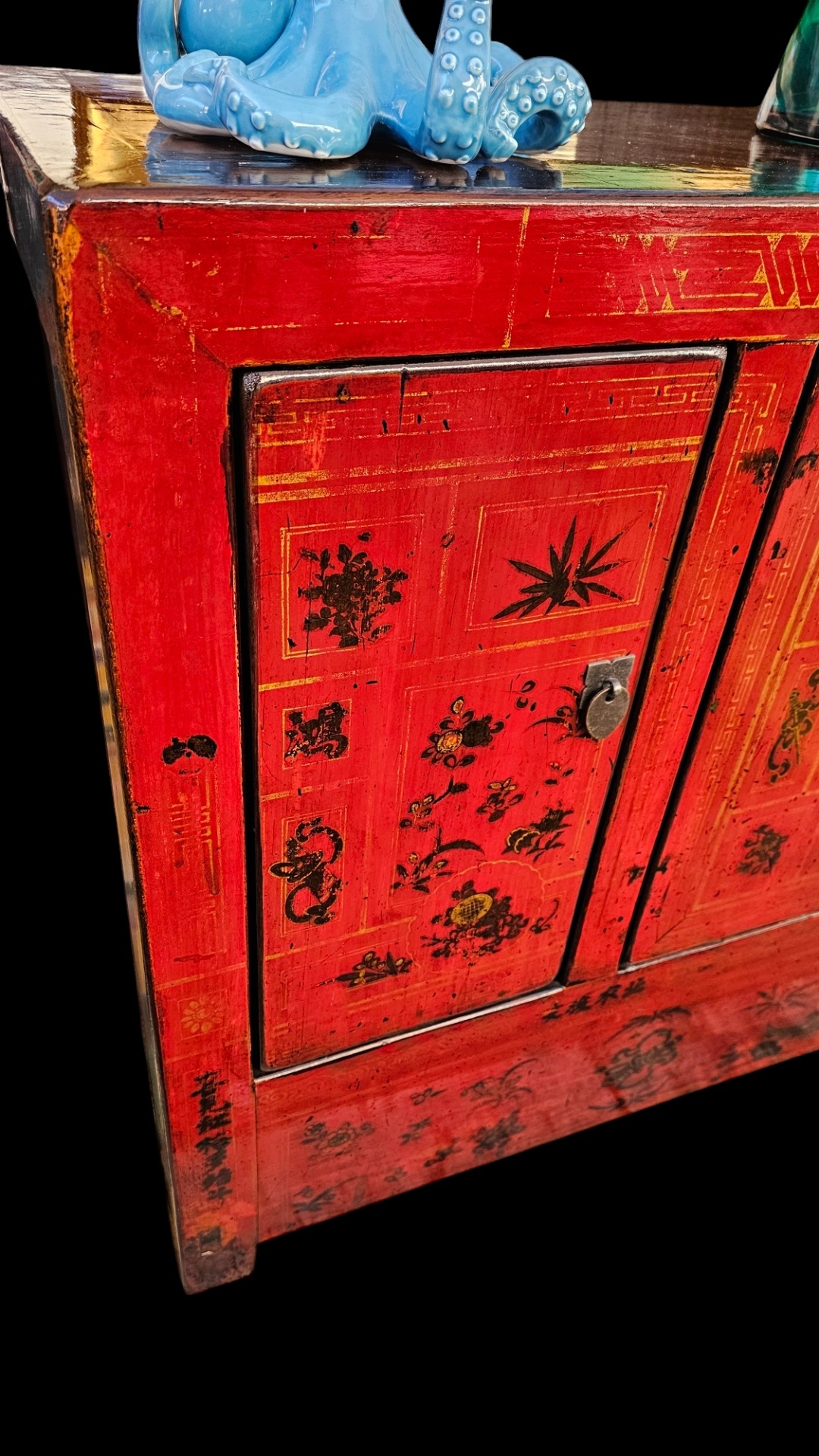 Bella credenza Tibetana in rossocina con decorazioni. Il nero misura larghezza centocinquanta profondità quaranta altezza ottantacinque I