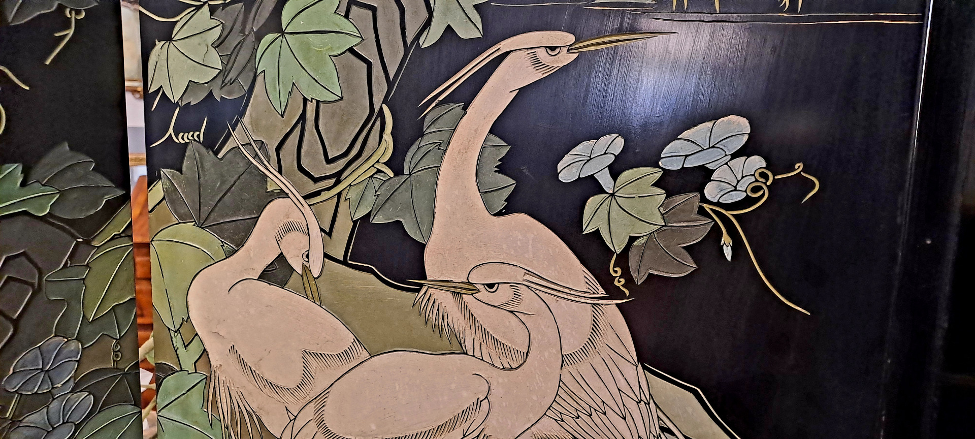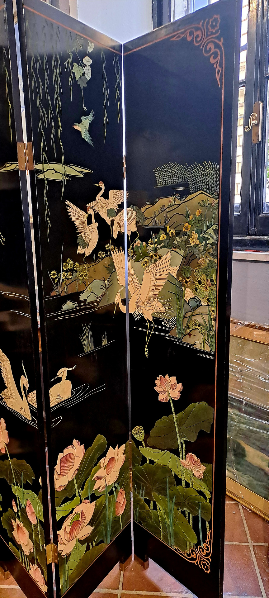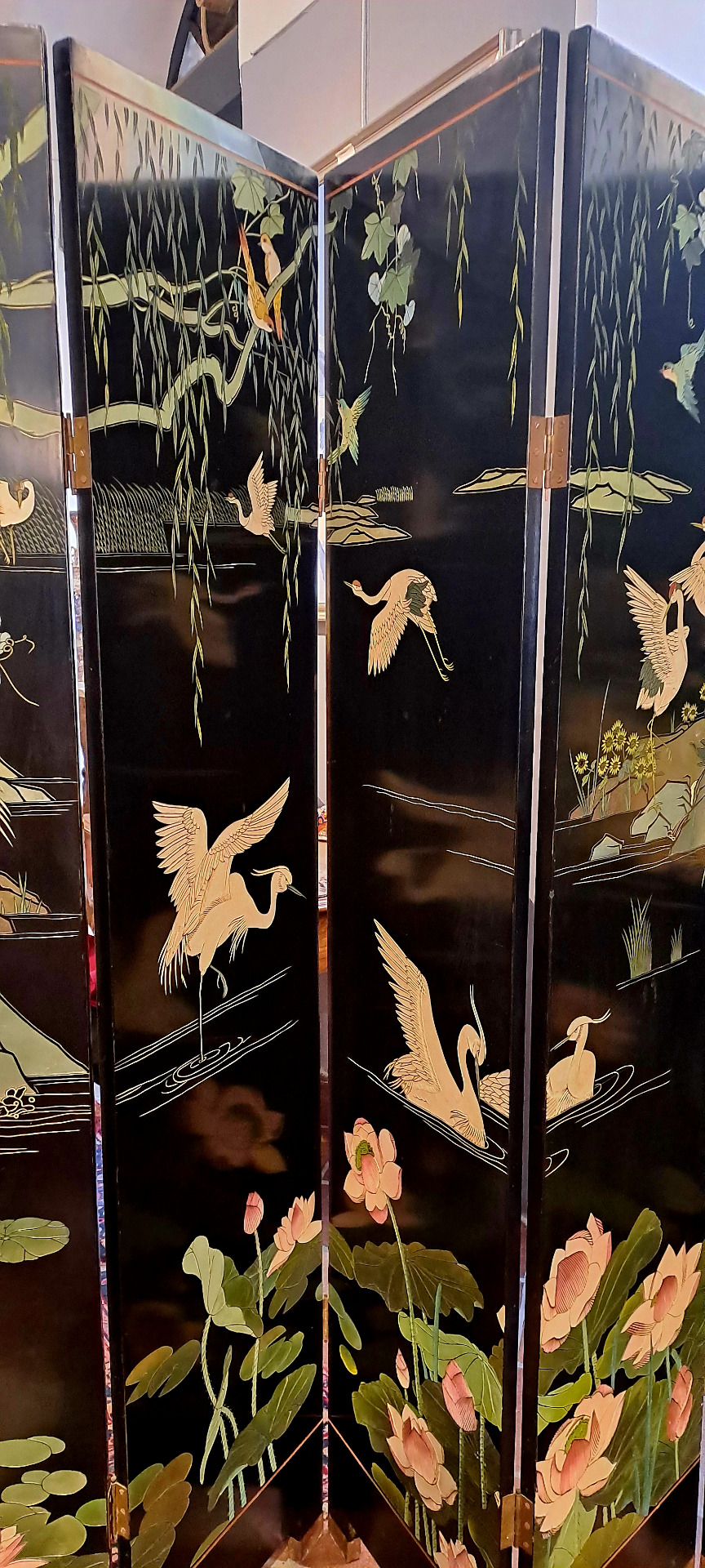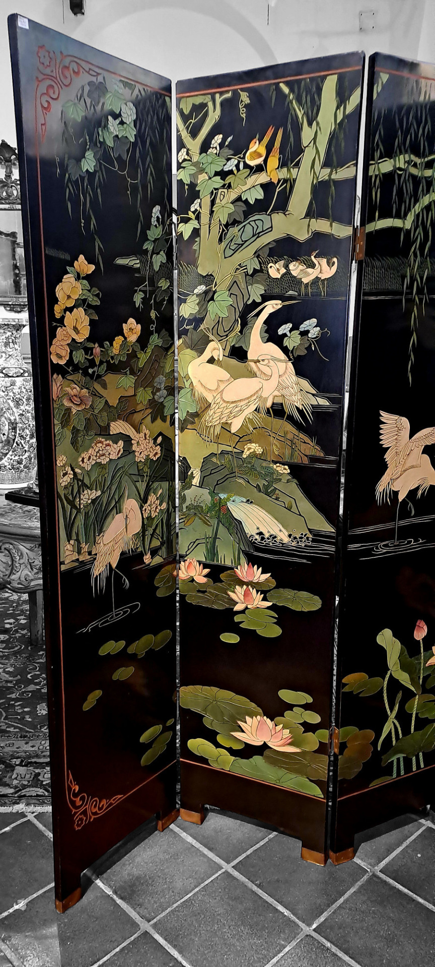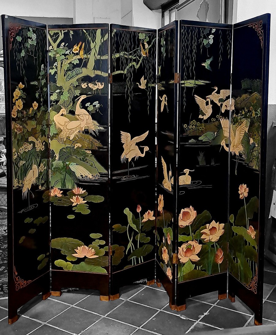 Grande paravento a sei pannelli in lacca nera.Su un fronte raffigurazioni naturalistiche con cicogne e fiori di loto realizzati con tecnica ad incisione.