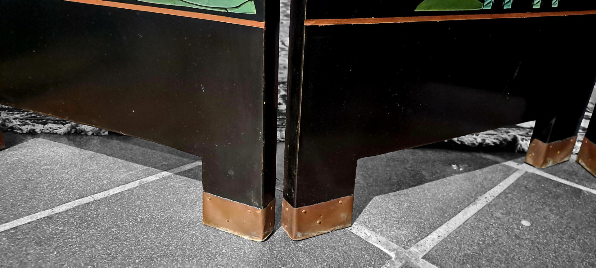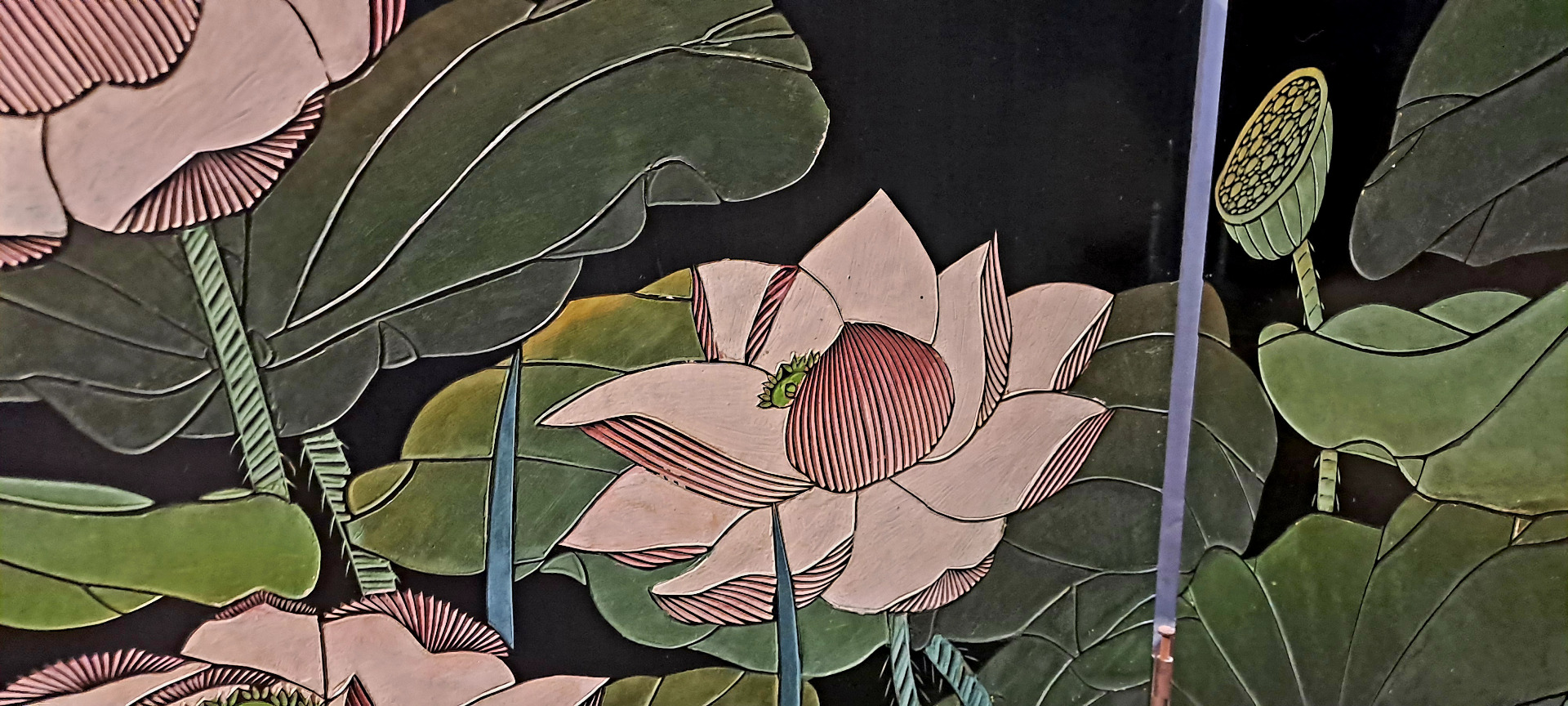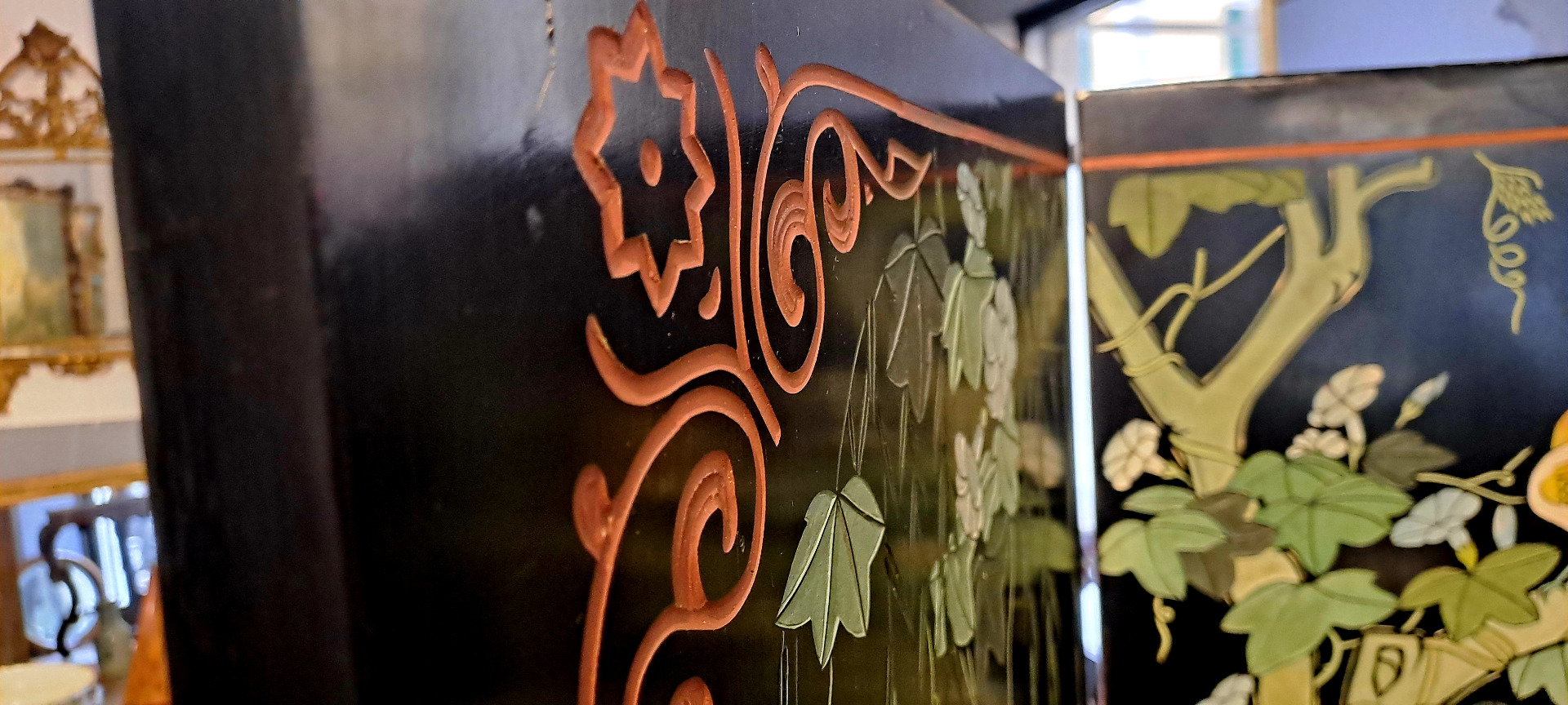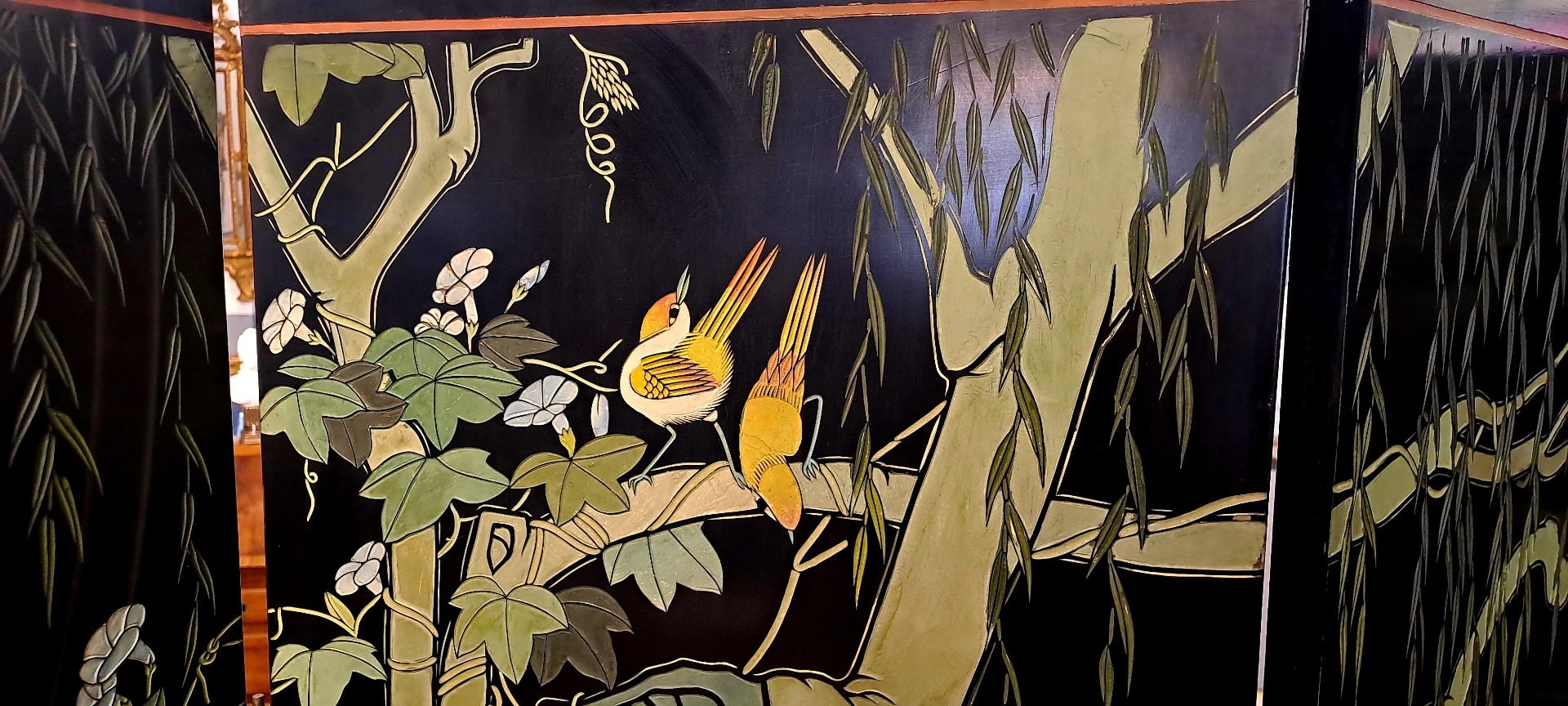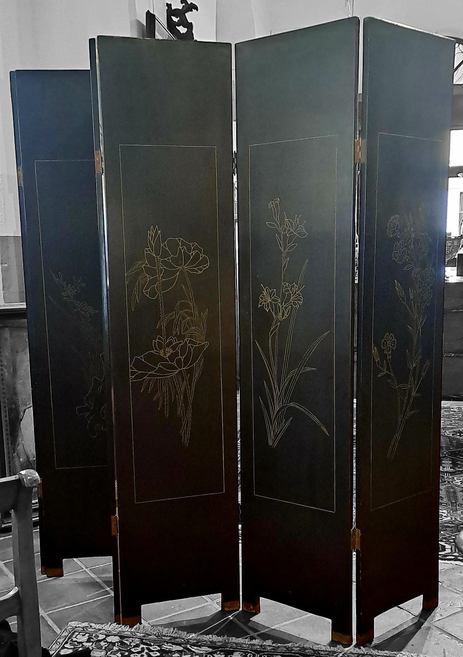 Grande paravento a sei pannelli in lacca nera.Su un fronte raffigurazioni naturalistiche con cicogne e fiori di loto realizzati con tecnica ad incisione.