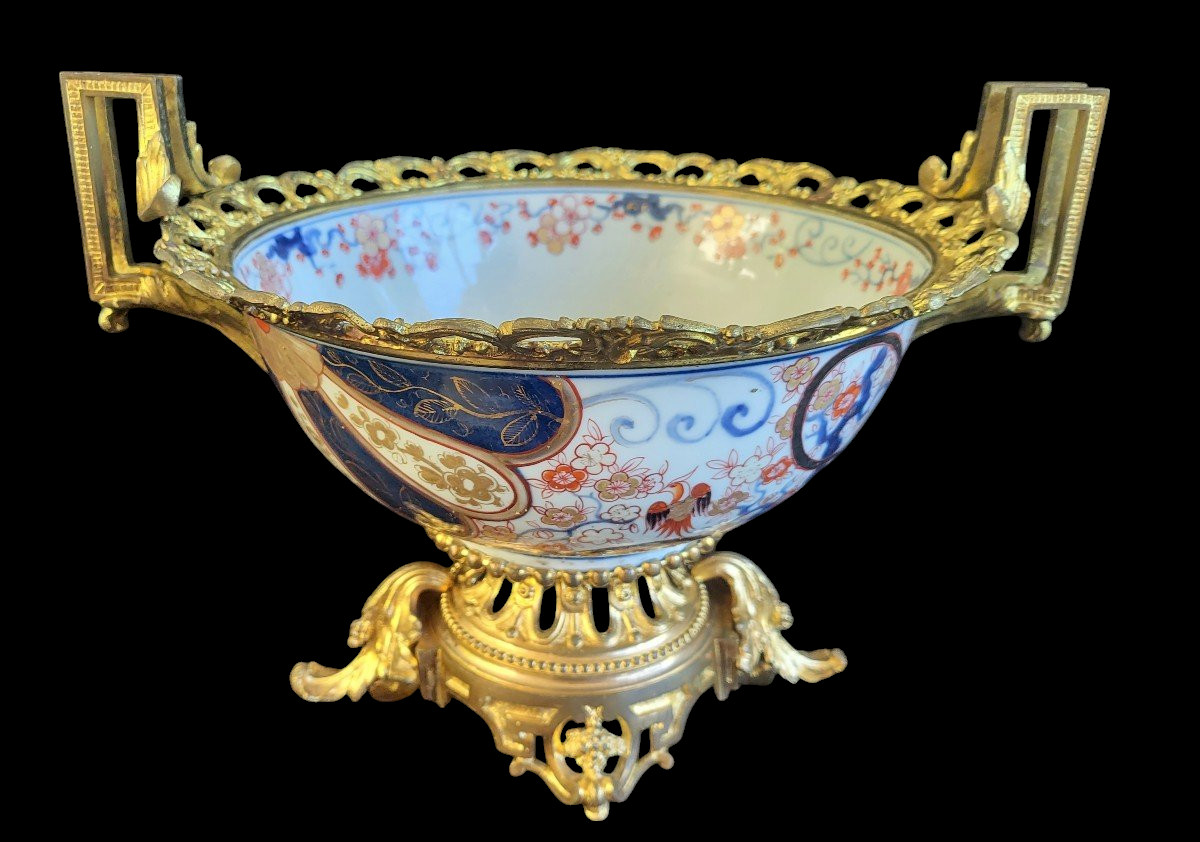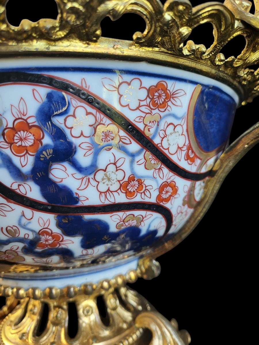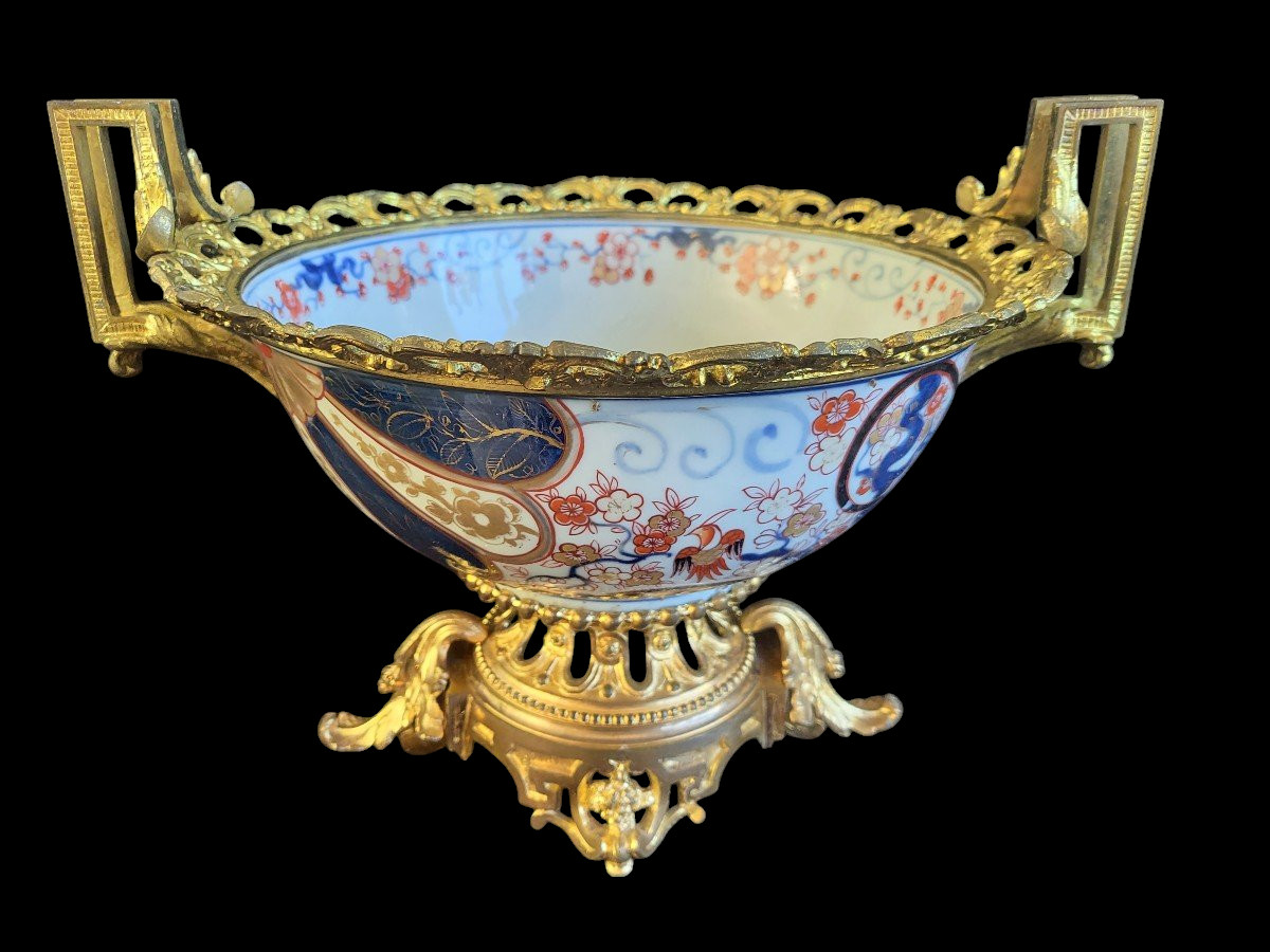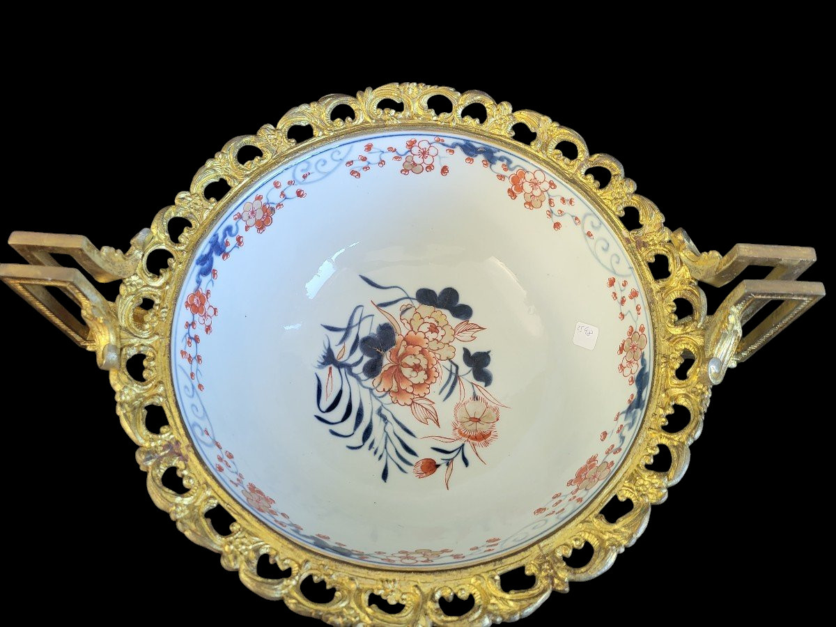Bowl in porcellana dipinta con montatura in bronzo cesellato e dorato.La ciotola è dipinta con motivi a soggetto florale e vegetale nei colori blu cobalto sottocoperta, mattone e oro sopracoperta.