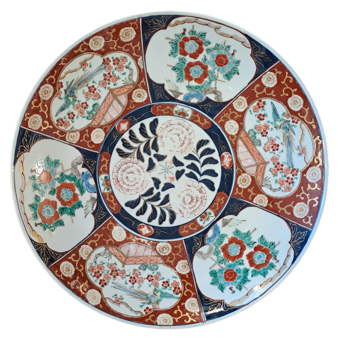 Grande coppia di piatti in porcellana decorati nei tipici colori della manifattura Imari nei colori blu cobalto sottocoperta, mattone e oro sopracoperta con soggetti di ispirazione floreale.Giappone, tardo periodo Meiji (1868 - 1912) , fine del XIX sec.Il diametro è di 45 cm