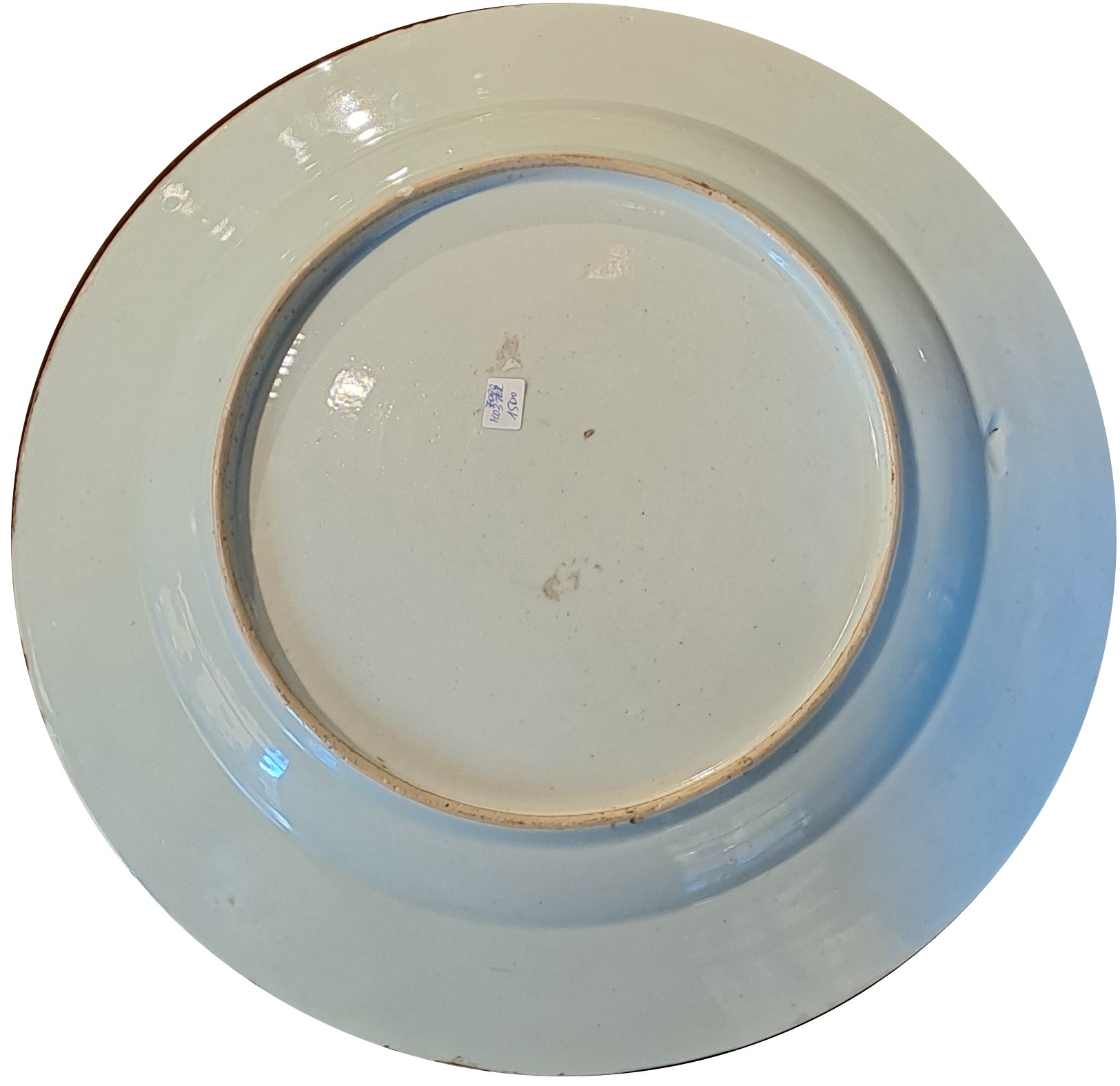Si propone un eccezionale e raro grande piatto in porcellana da esportazione cinese, risalente al periodo dell'imperatore Kangxi della dinastia Qing. Con un notevole diametro di 42 cm, questo pezzo si distingue non solo per le sue dimensioni, ma anche per la sua ricca e dettagliata decorazione.