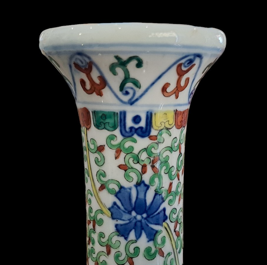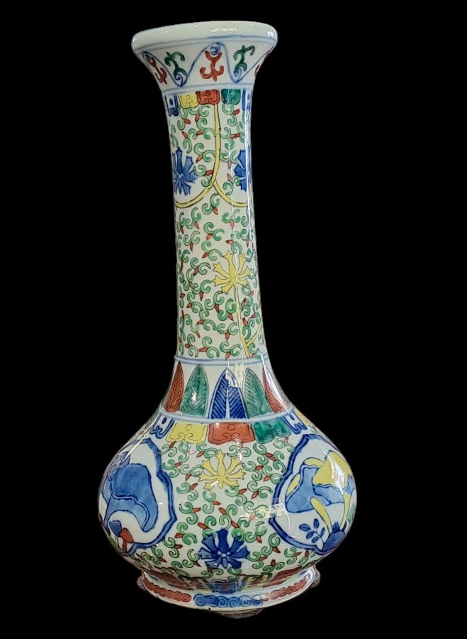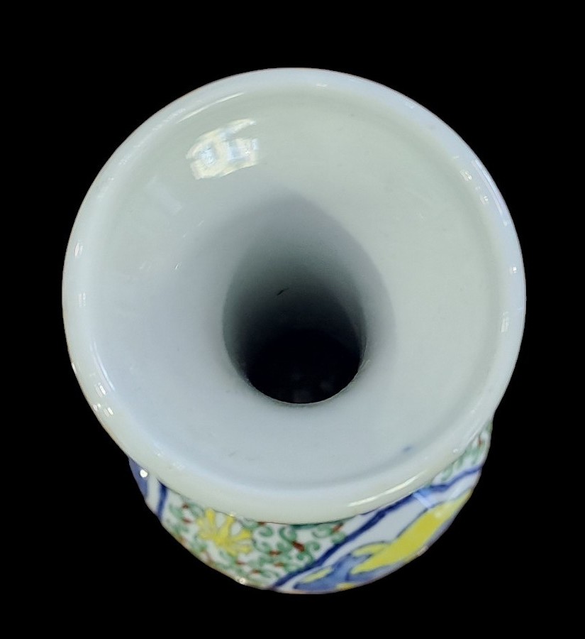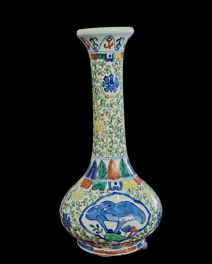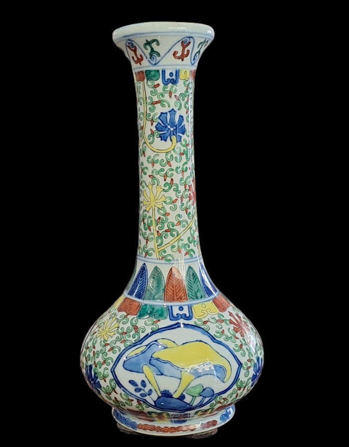 Vaso in porcellana dipinta con corpo a sezione circolare con alto collo stretto e bocca eversa.Sul fondo marchio apocrifi Wanli.
