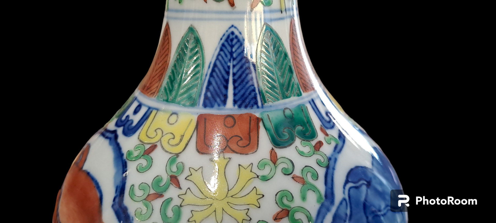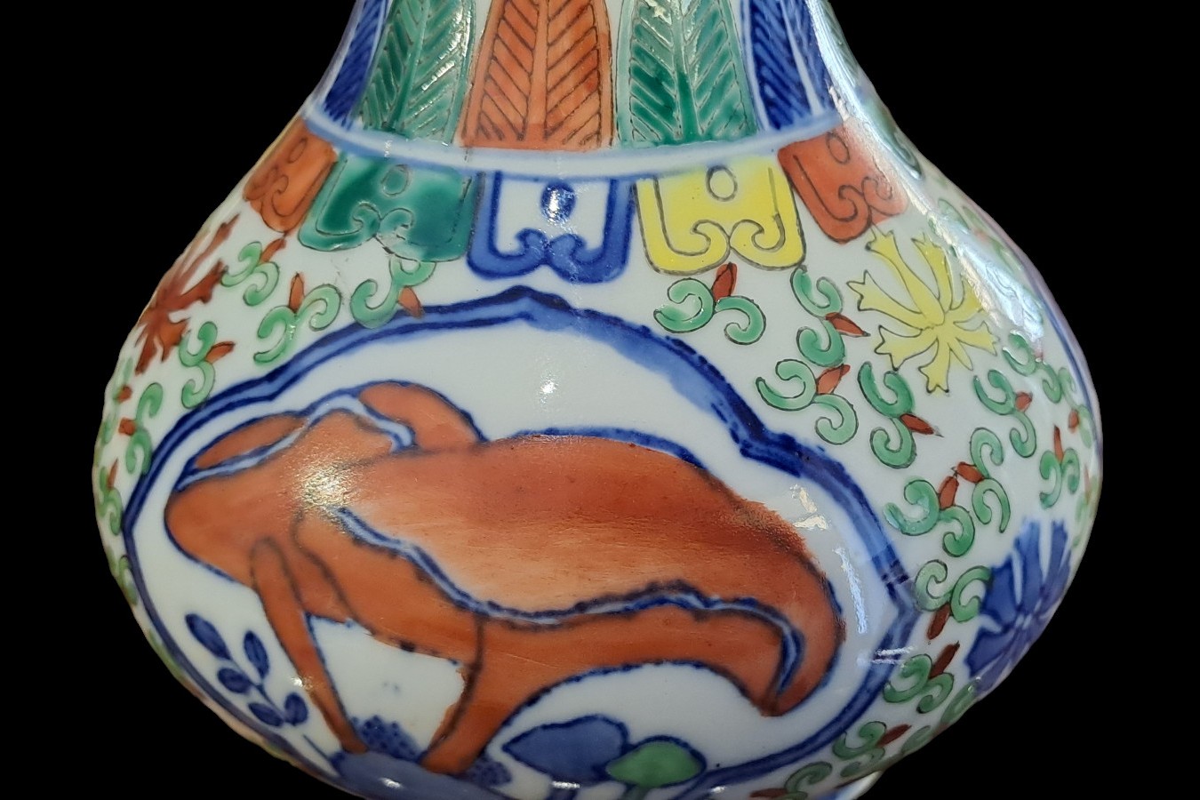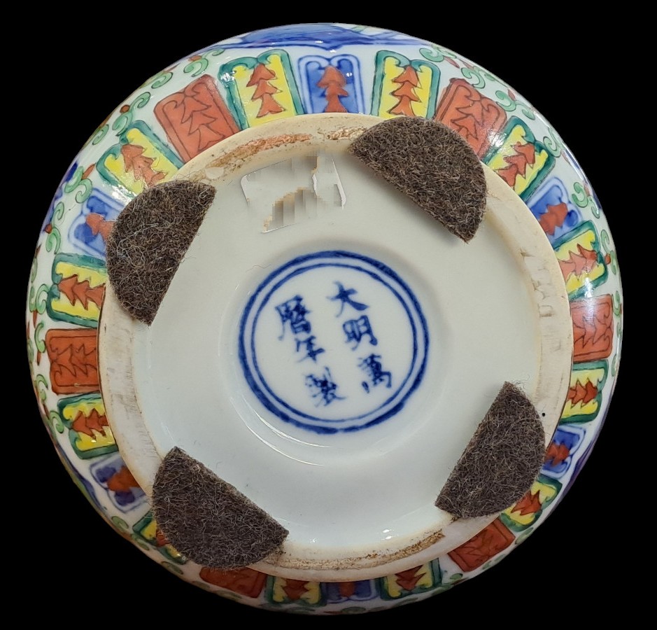 Vaso in porcellana dipinta con corpo a sezione circolare con alto collo stretto e bocca eversa.Sul fondo marchio apocrifi Wanli.