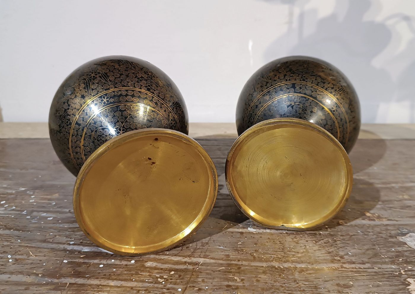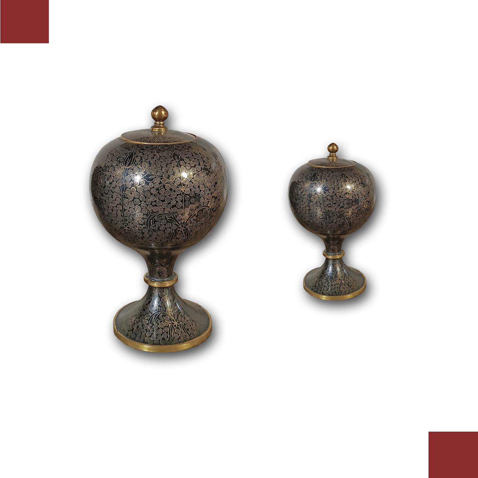 Raffinata coppia di vasi ad urna, lavorati con la tecnica del cloisonné e rifiniture in ottone lucidato. I vasi presentano una rara forma con corpo globulare, piede ad anello, e con tappo in metallo. Di colore grigio antracite, sono decorati con motivi dorati di tipo geometrico e fitomorfo, che conferiscono ulteriore eleganza agli oggetti. Si tratta di una coppia di vasi di grande gusto e antichità, in grado di arredare con un tocco di classe e raffinatezza qualsiasi ambiente. Manifattura cinese della prima metà del XIX secolo.
