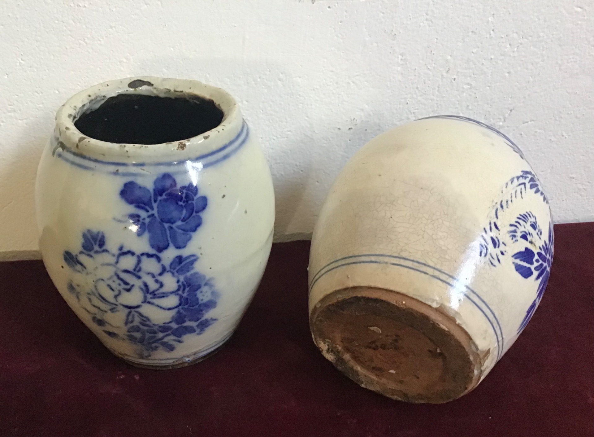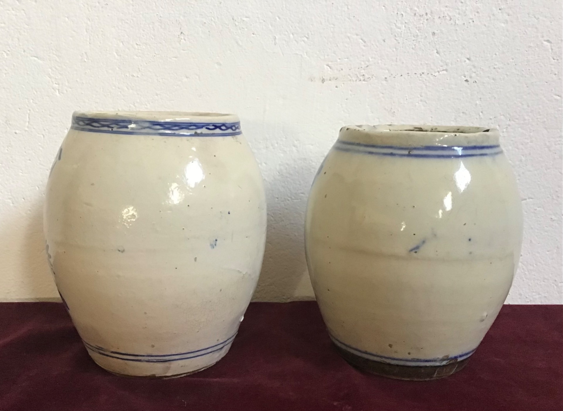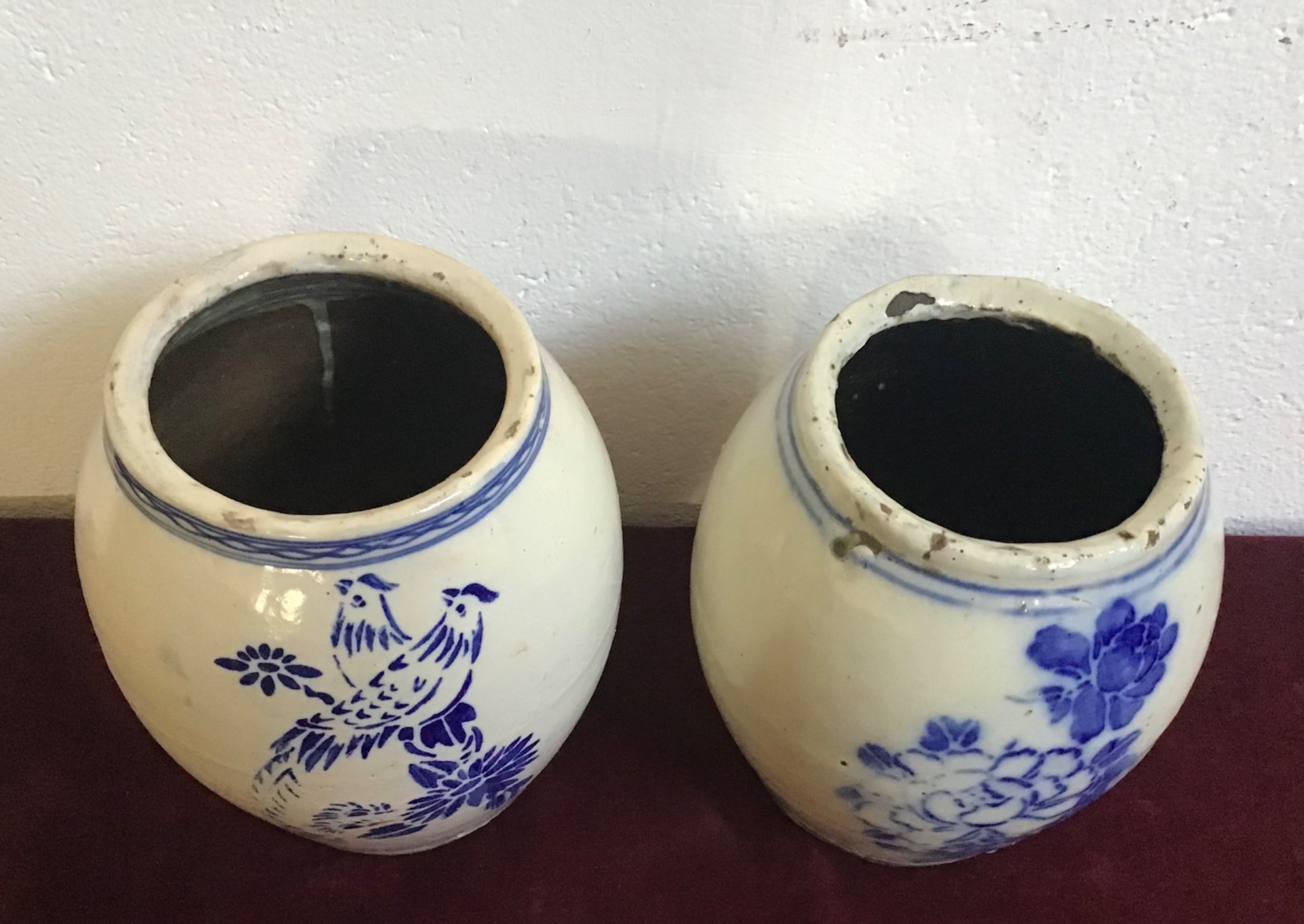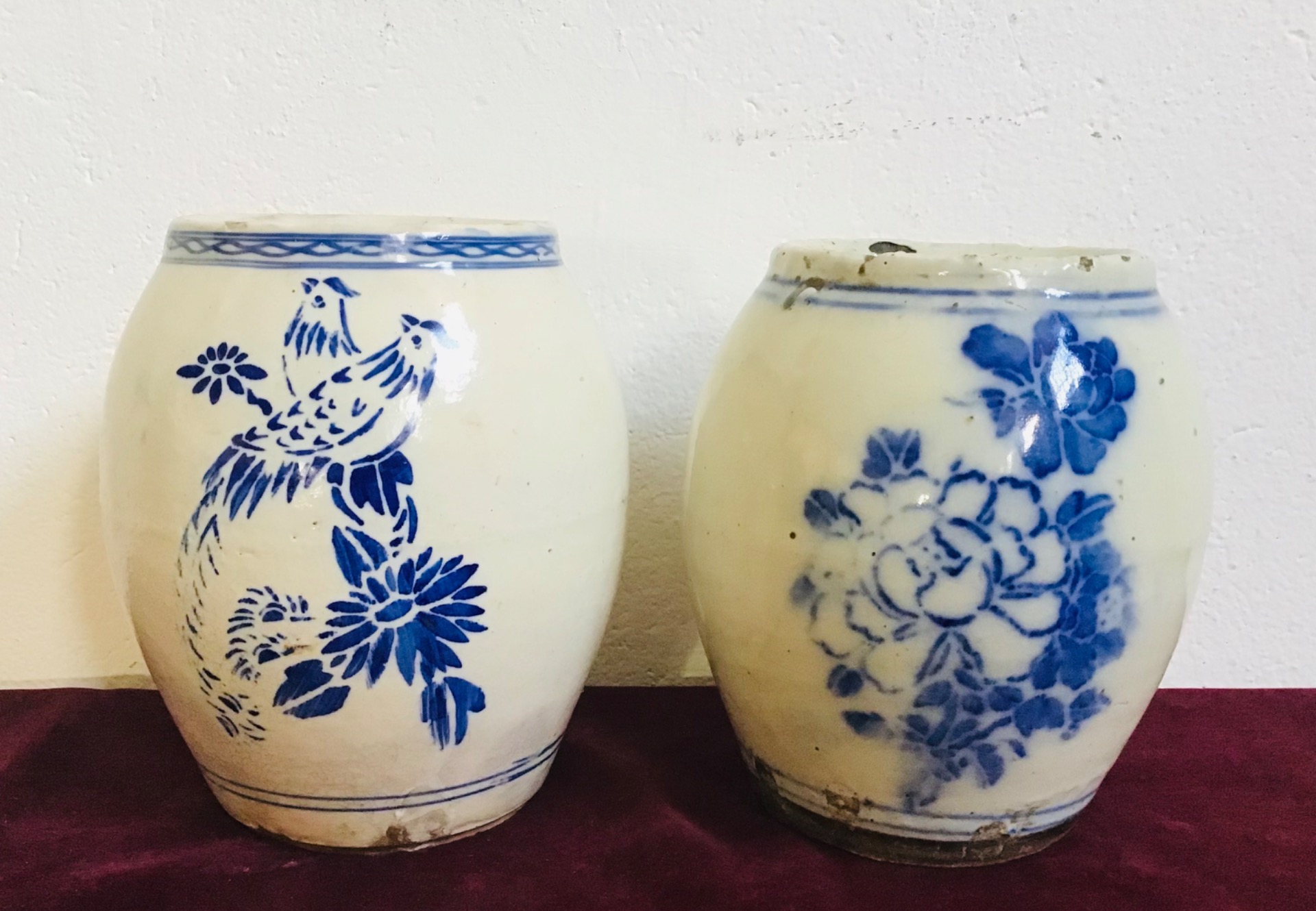 Coppia vasi cinesi bianco/blu con figure di uccelli e fiori. Addoperati come contenitori di erbe o radici,sono in ottime condizioni di conservazione,