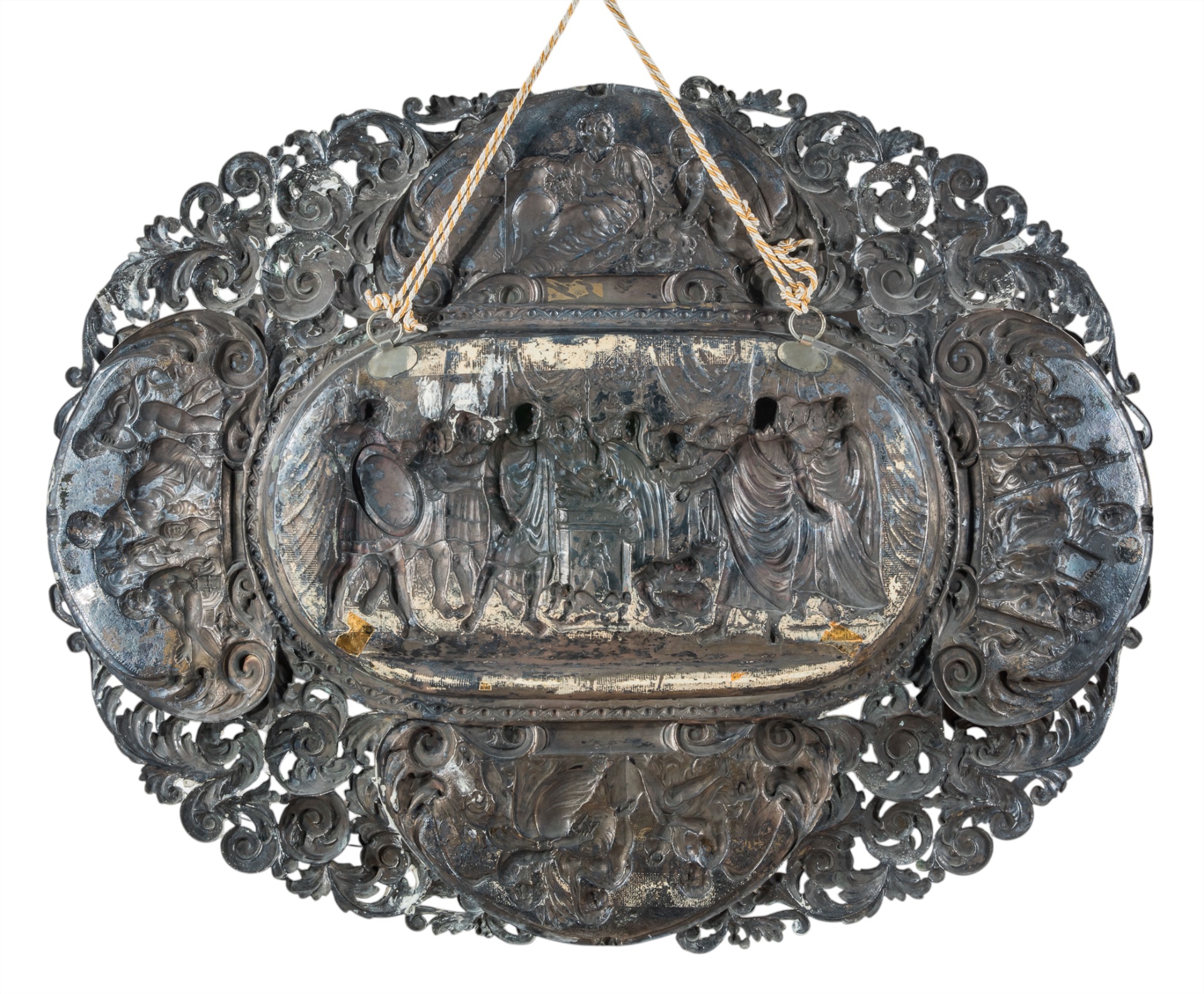 Grande piatto da parata, Milano, XX secolo, in argento sbalzato. Nel cavetto la scena principale raffigura "Il coraggio di Muzio Scevola" da Appiani, la tesa è ornata dalle allegorie delle quattro virtù cardinali, intervallate da volute di foglie d'acanto, cm 78x100; gr. 5250; punzone: Speronari 3 Milano e titolo 800 2025.178.1 Ad integrazione delle descrizioni, la galleria “Antichità Giglio” rende disponibili, a richiesta, condition report sullo stato di conservazione dei propri beni e preventivi di trasporto nazionali ed internazionali.