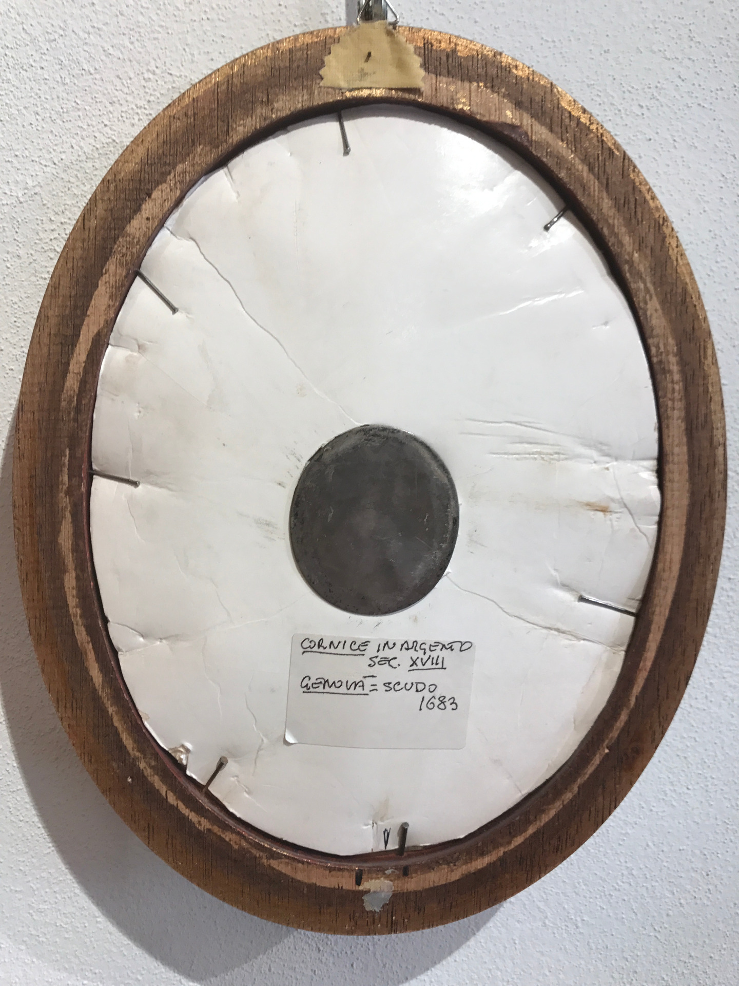 Cornice in argento cesellato e sbalzato del XVIII secolo contenente scudo genovese del 1683