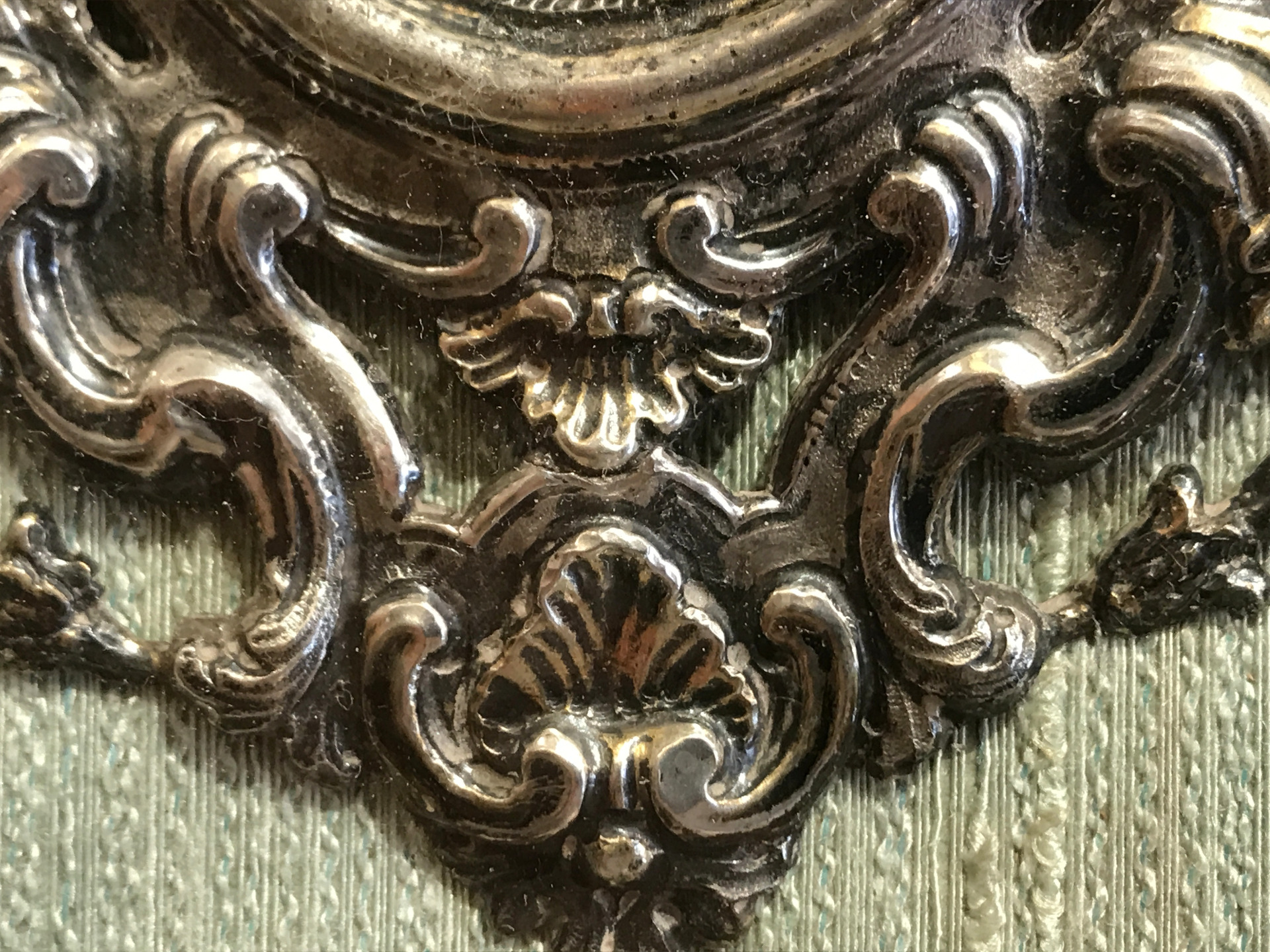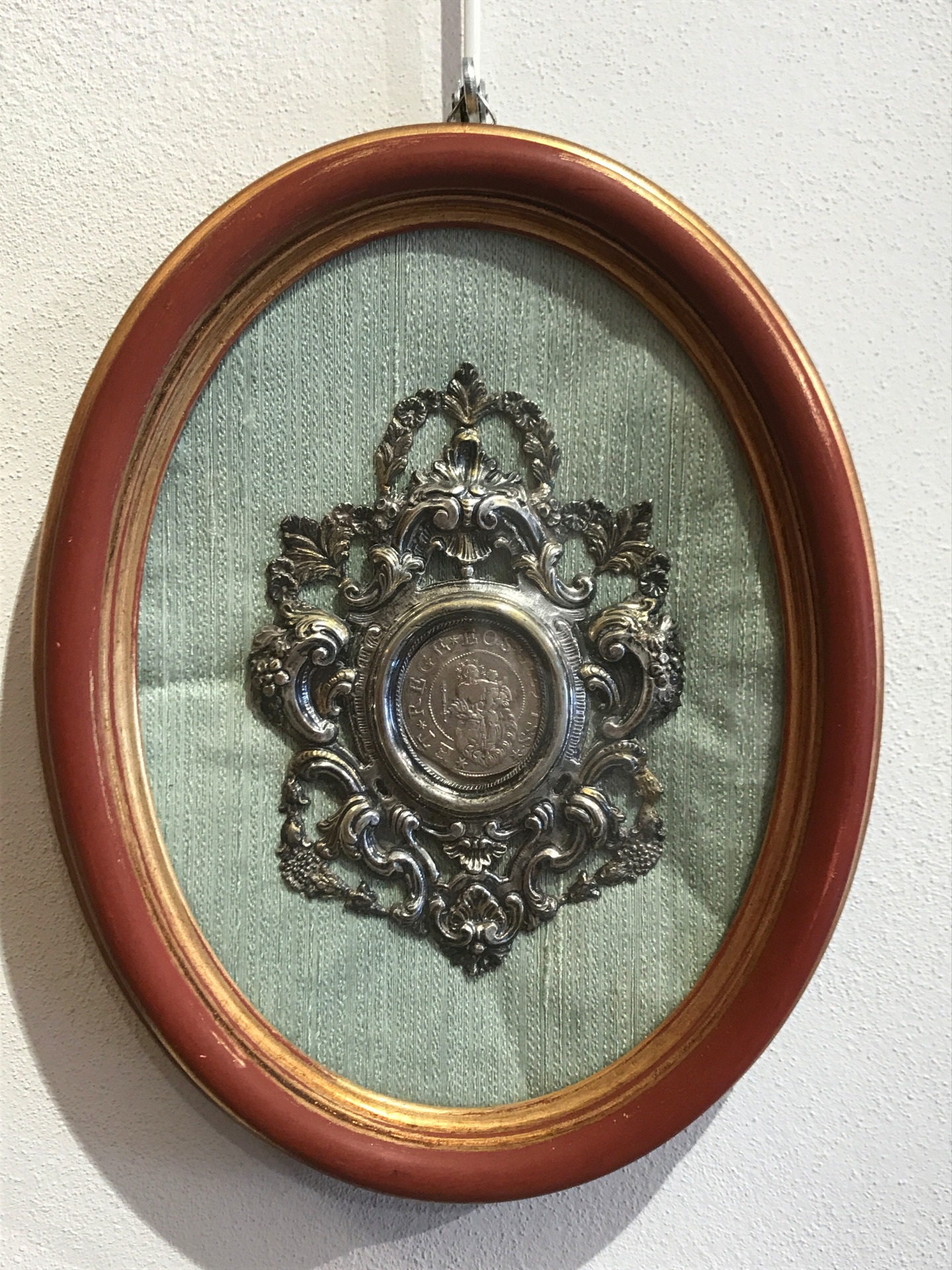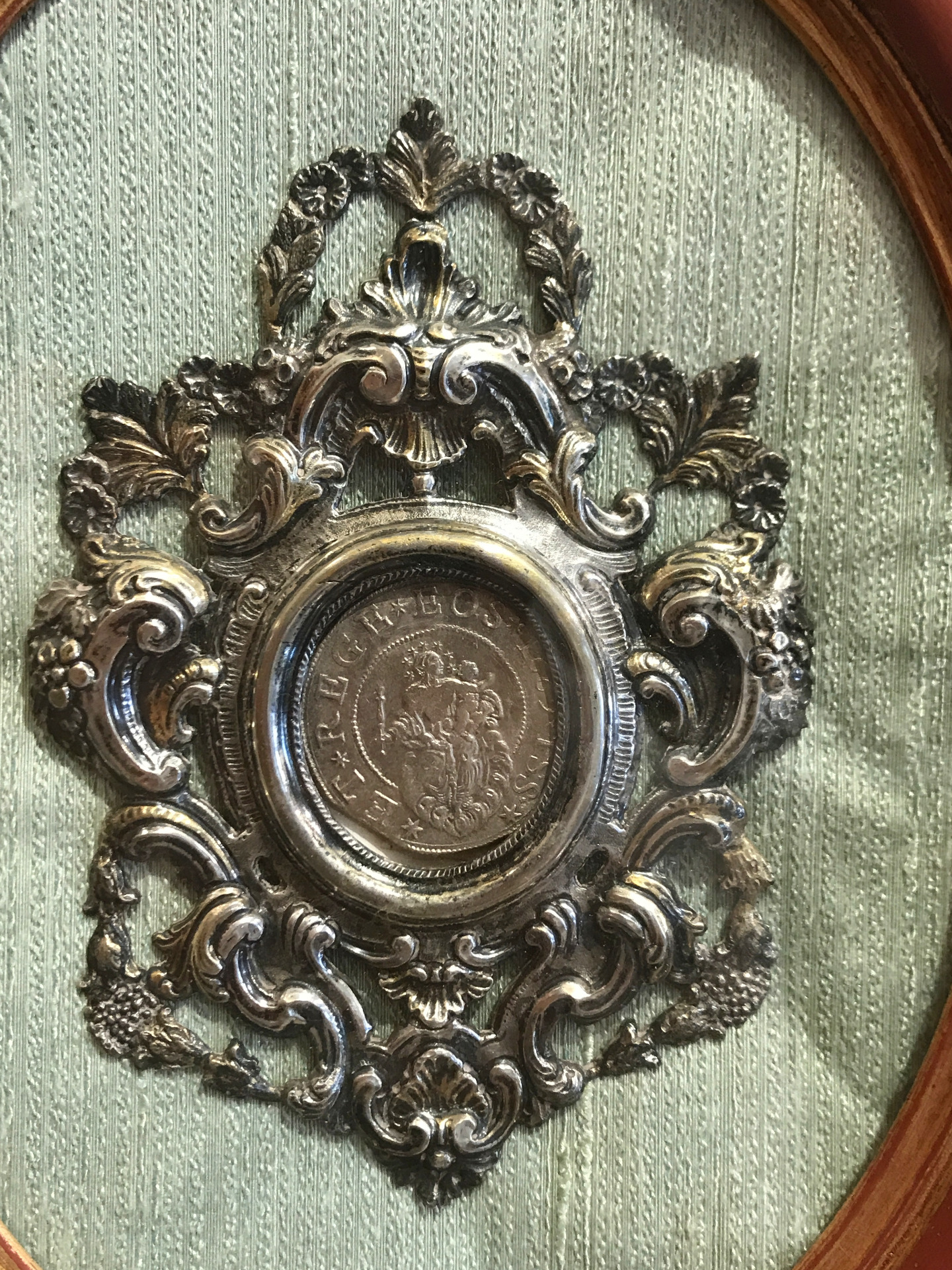 Questa piccola cornice è realizzata in argento finemente cesellato e sbalzato con motivi barocchi a volute e girali, decori vegetali e floreali. Al suo interno è conservata una rara moneta in argento. Si tratta di uno scudo genovese del 1683.