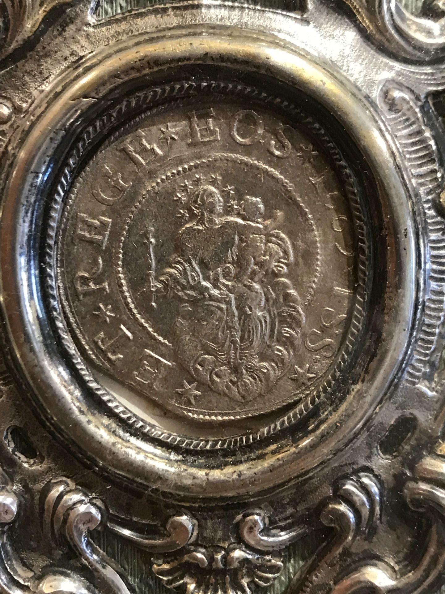 Piccola cornice in argento cesellato e sbalzato del XVIII secolo contenente scudo genovese del 1683