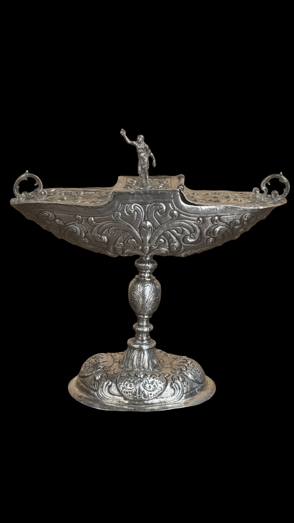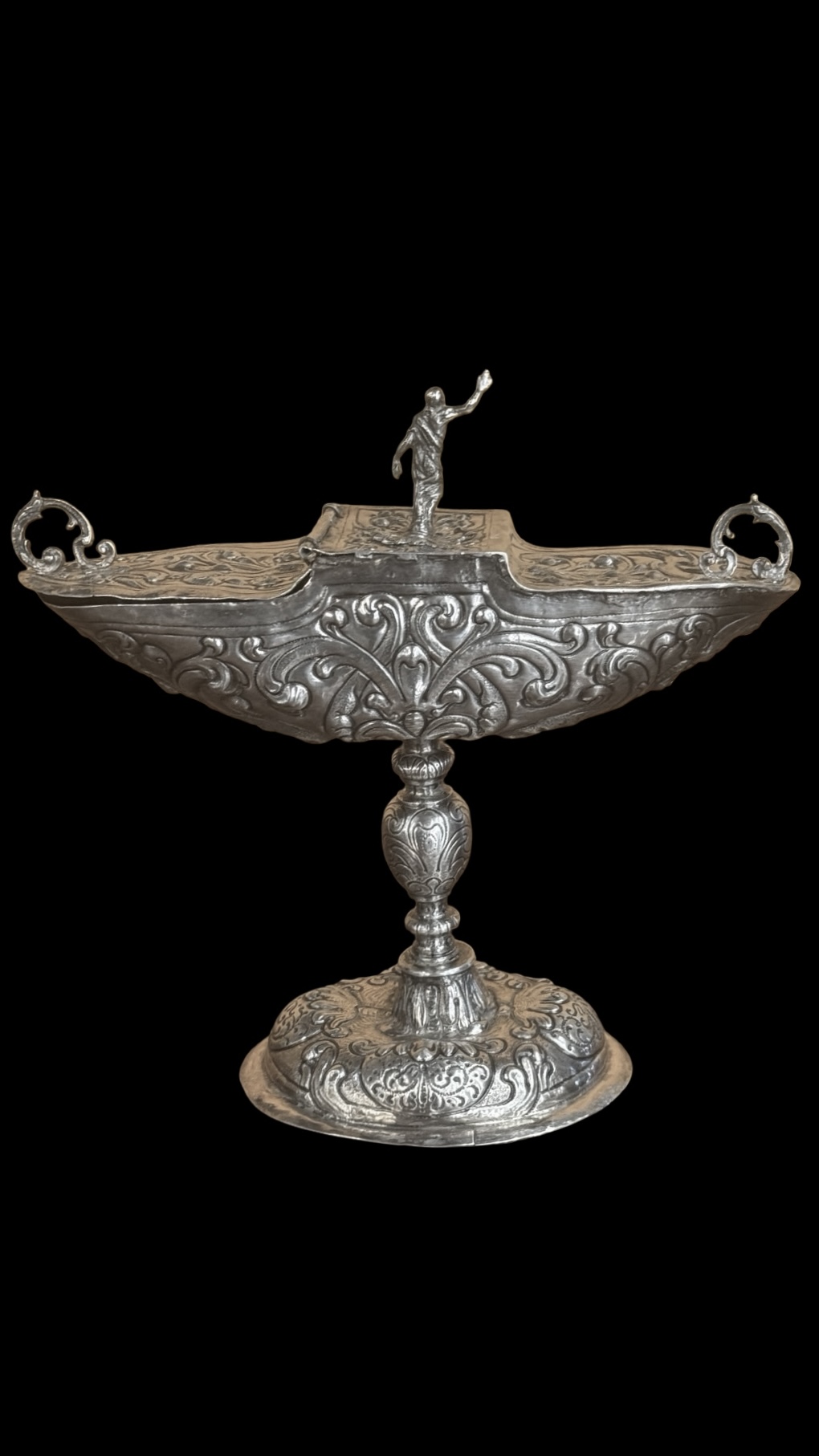 Navicella porta incenso in argento sbalzato a festoni di foglie e volute.Fusto a balaustro e figura a tutto tondo ( lievi danni alla cerniera ).Grammi 500. Cm 21x7. H:cm 20. Non punzonata.
