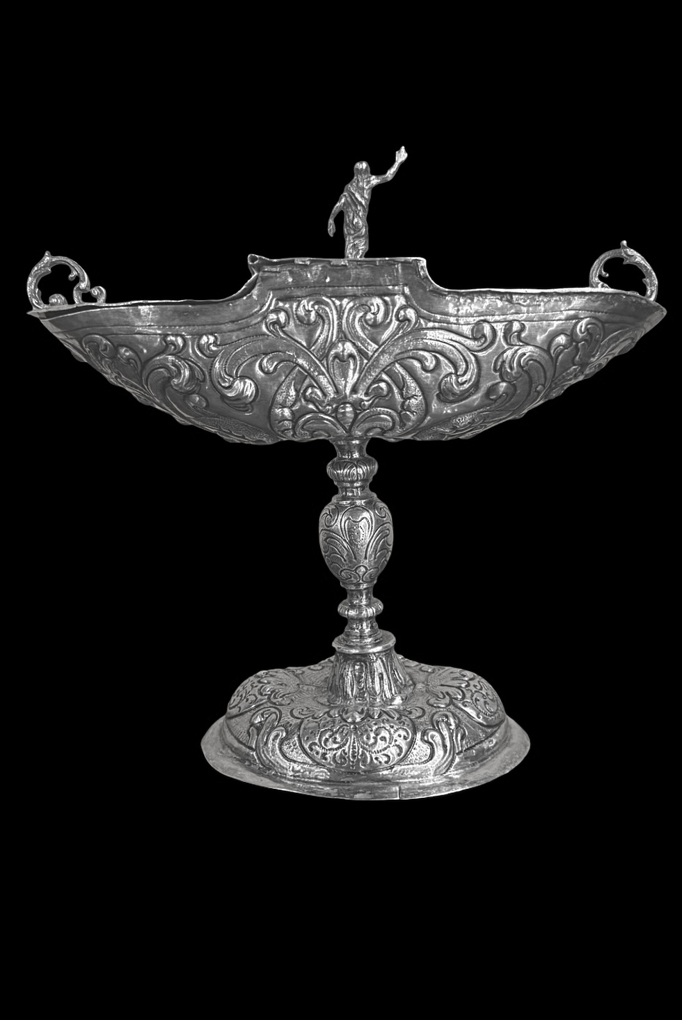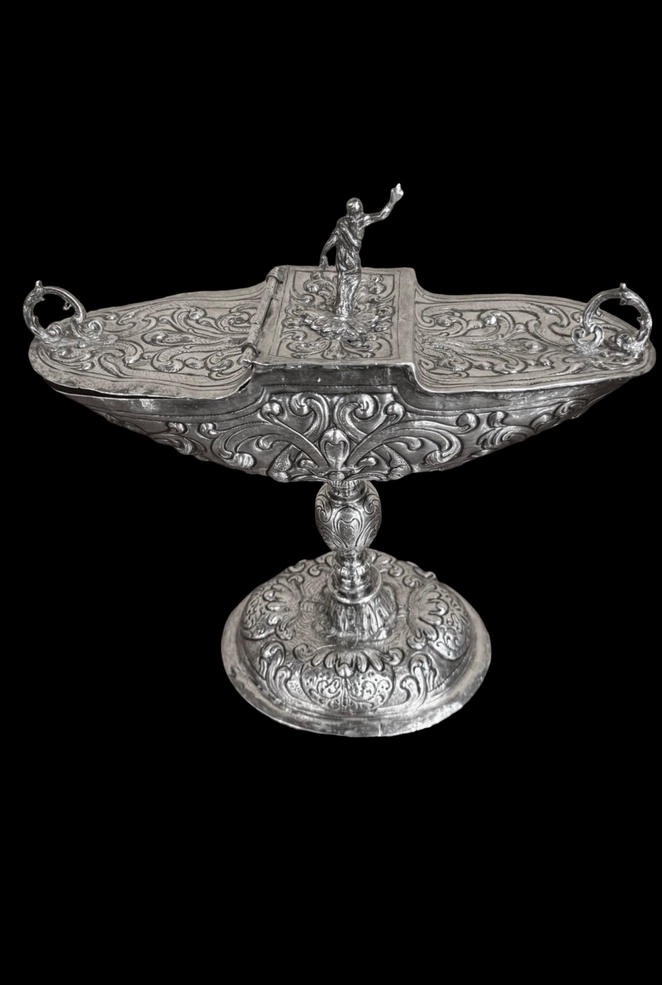 Navicella porta incenso in argento sbalzato a festoni di foglie e volute.Fusto a balaustro e figura a tutto tondo ( lievi danni alla cerniera ).Grammi 500. Cm 21x7. H:cm 20. Non punzonata.
