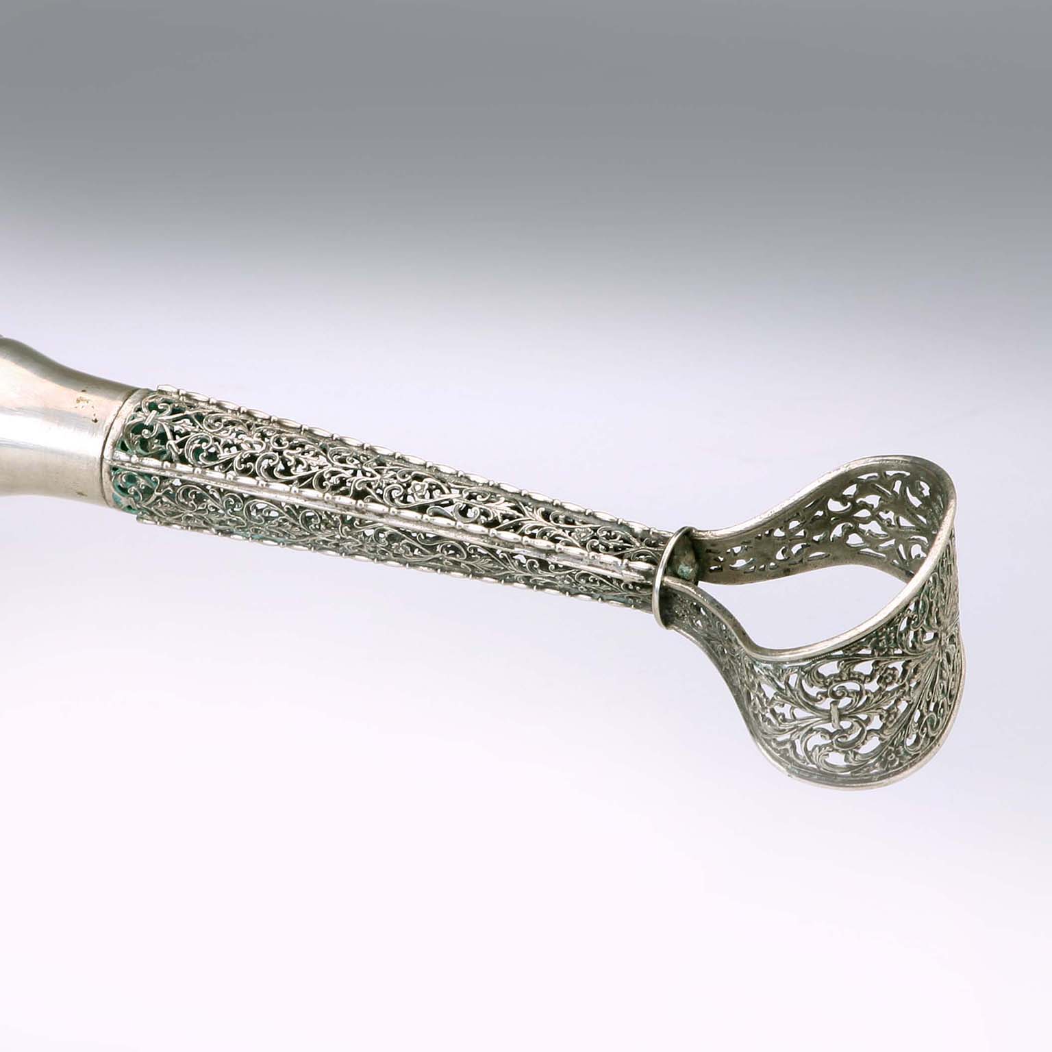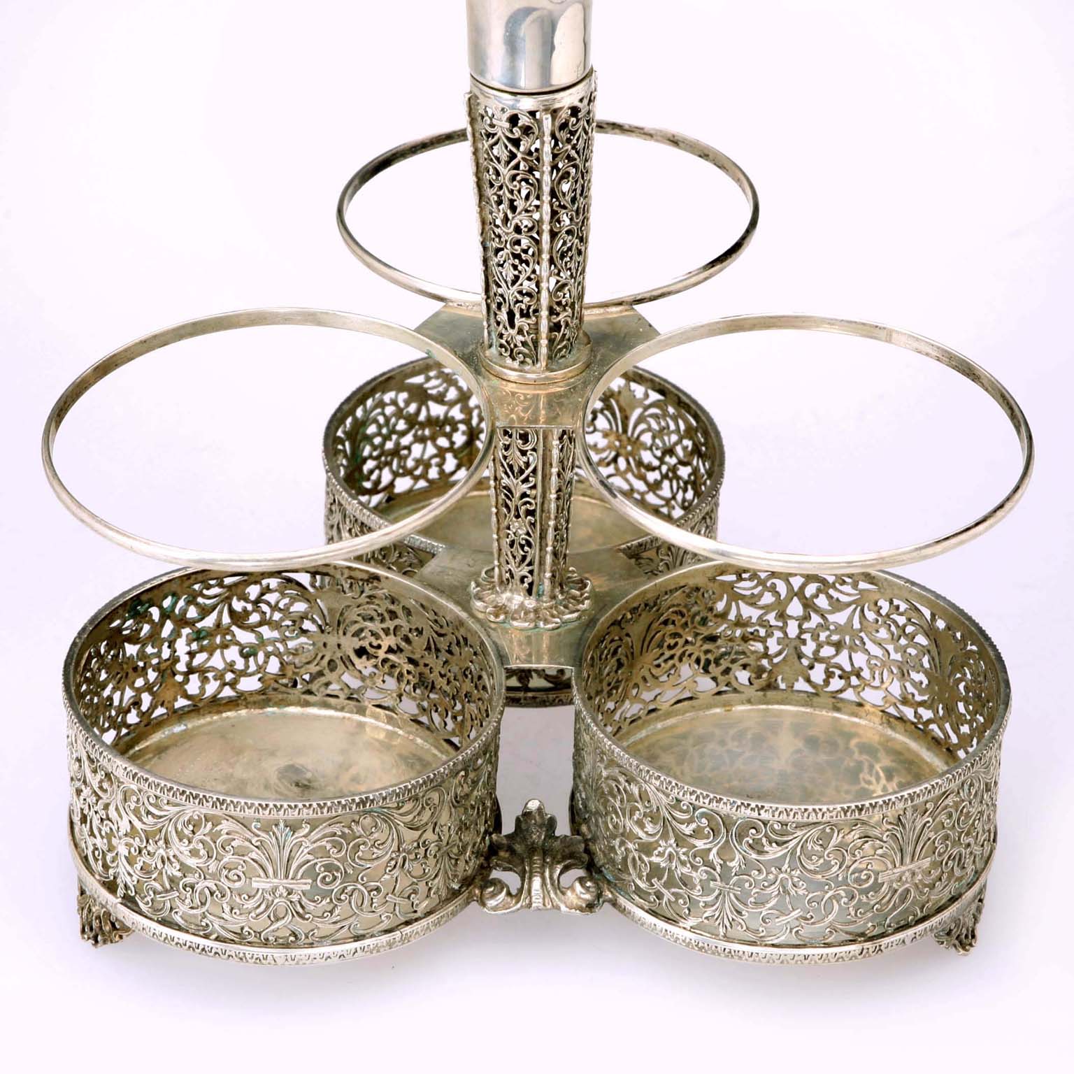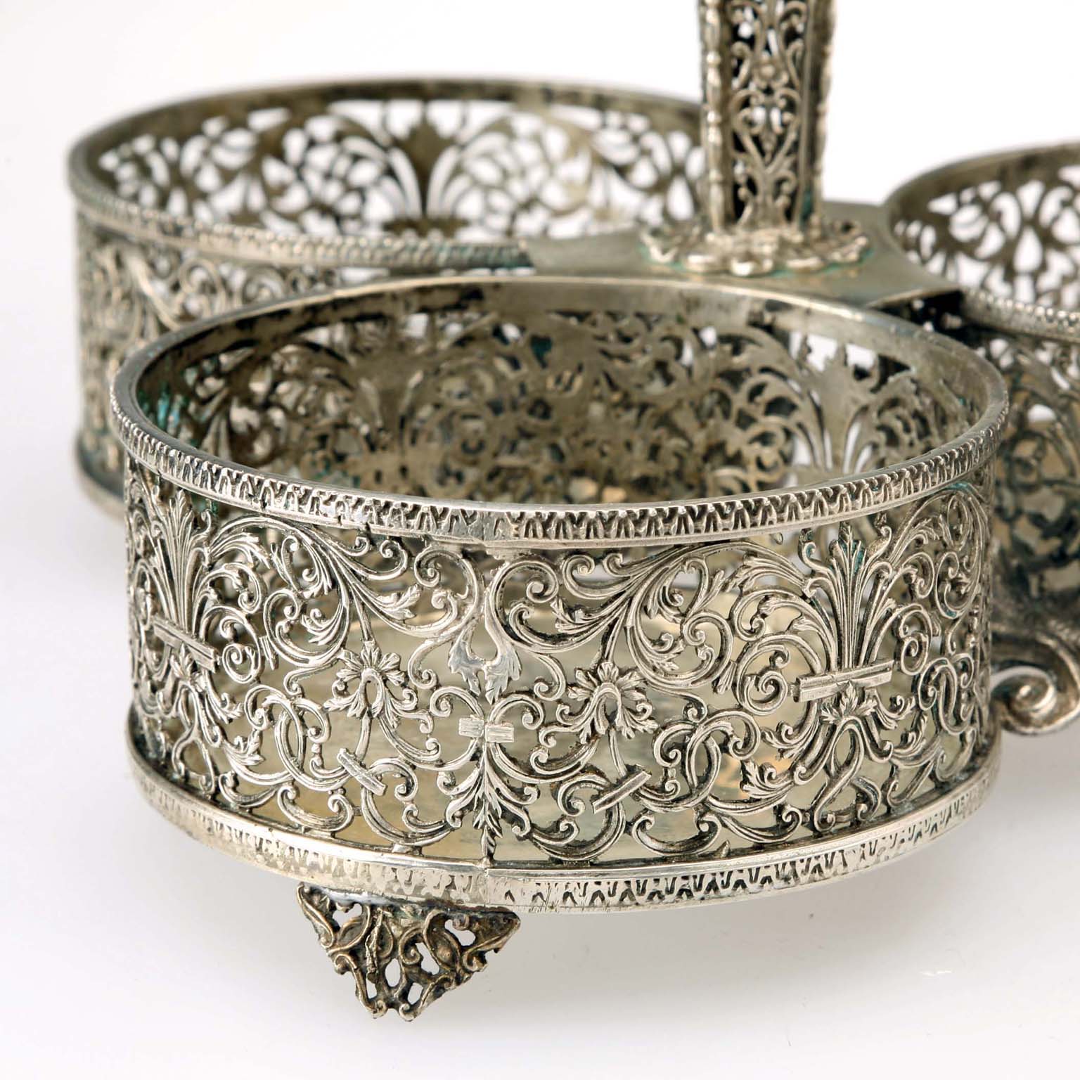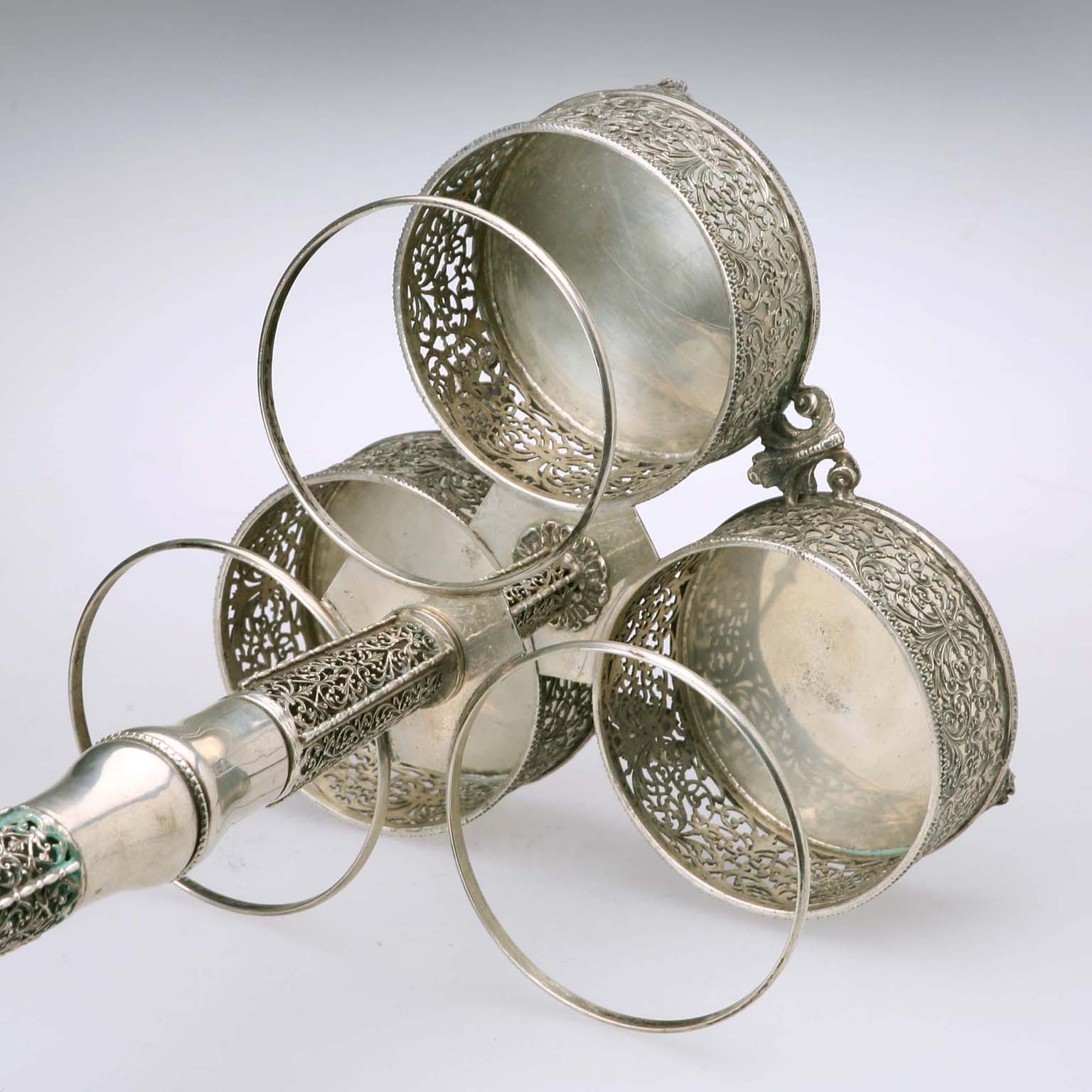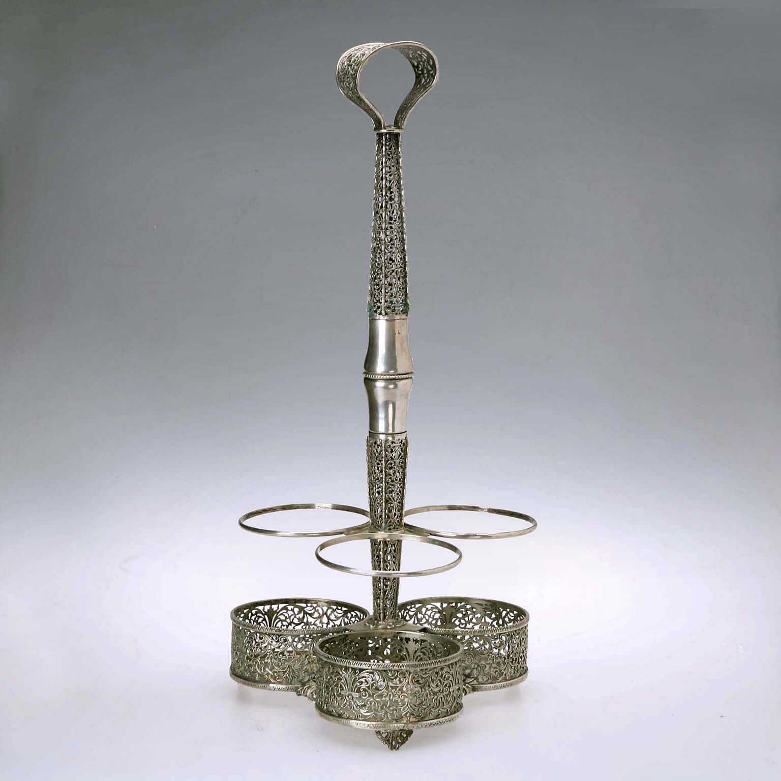 Portabottiglie in argento cesellato e traforato a volute fogliacee. Presa ad anello con decoro a rosone sulla sommità. Marchi dell'argento incussi sotto la base. Grammi 715.
