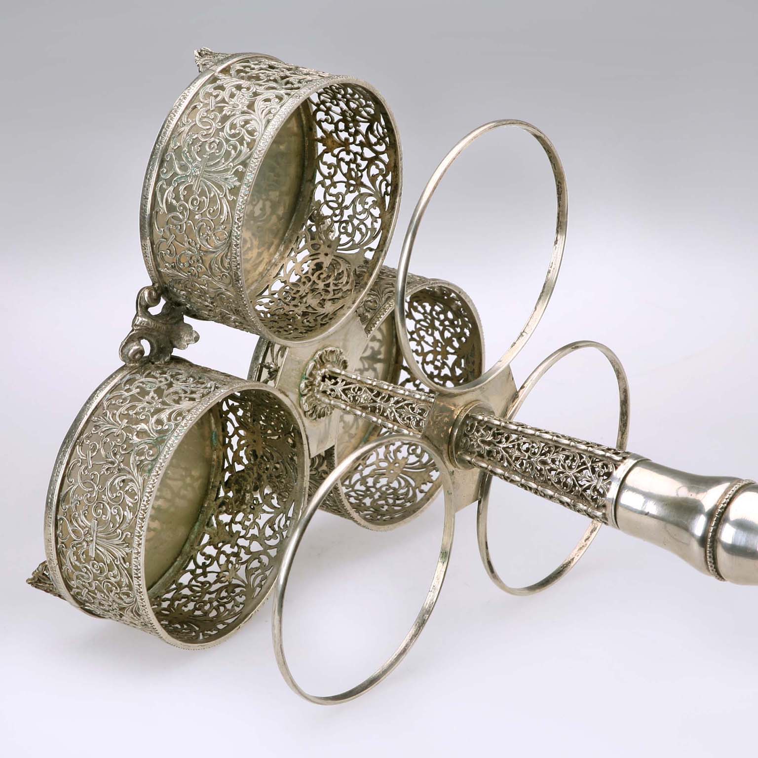 Portabottiglie in argento cesellato e traforato a volute fogliacee. Presa ad anello con decoro a rosone sulla sommità. Marchi dell'argento incussi sotto la base. Grammi 715.