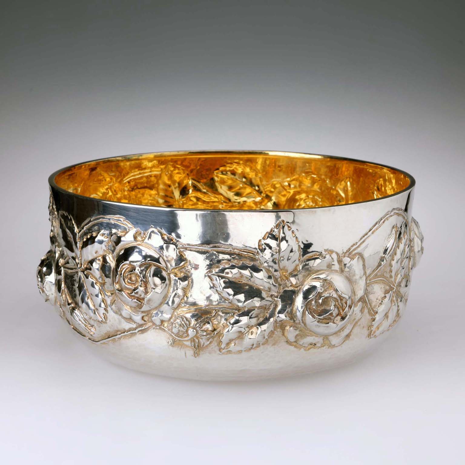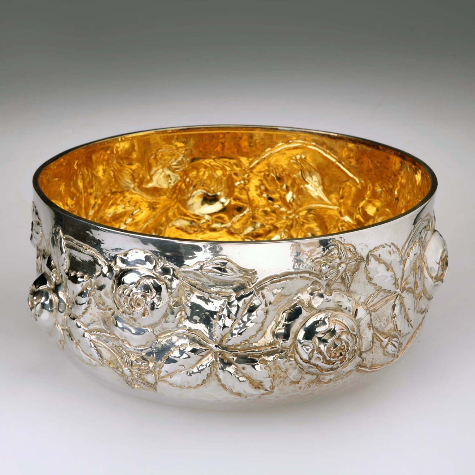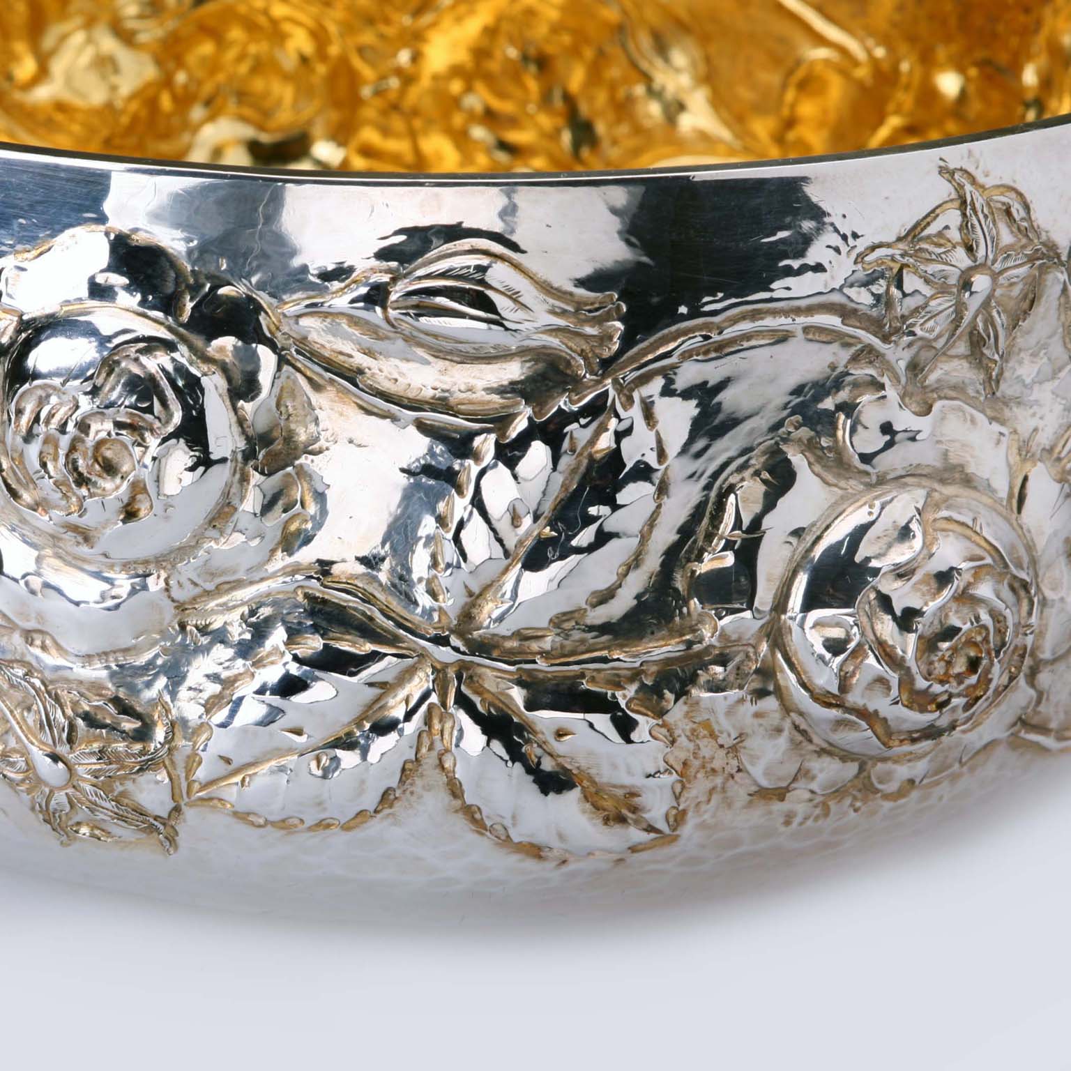 Portafrutta in argento sbalzato con decoro raffigurante tralci di rose. Interno in vermeil. Marchi dell'argento e dell'argentiere incussi sul bordo esterno. Grammi 814.