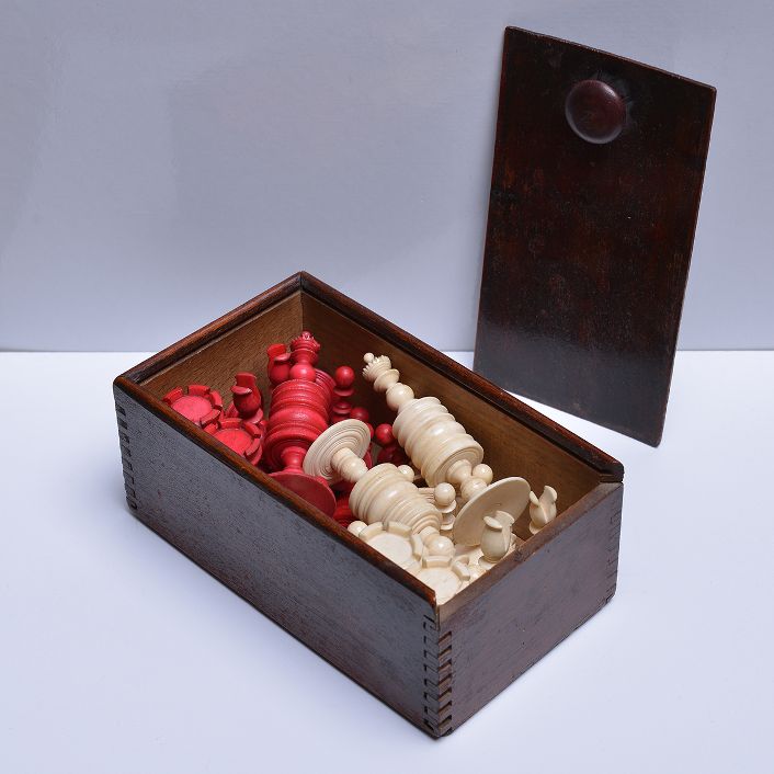 Scacchi antichi in avorio, rari e belli : un vero piacere per chi gioca a scacchi. Il re è alto 10 cm., la scatola in legno che li contiene è cm.19x11 x h.7/8. Risalgono all'inizio del Novecento (o più antichi?) e sono perfetti. Entrambi (scatola e scacchi) arrivano dall'Inghilterra: volendo, si può scegliere un'altra cassetta fra quelle pubblicate.