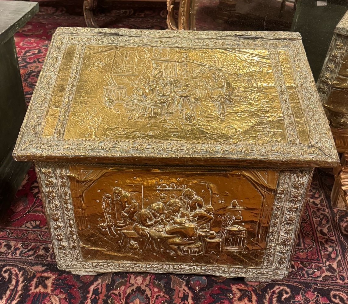 AL322 - Porta-legna rivestito in lamierino sbalzato, epoca '800, misure cm L 61 x P 44 x H 52