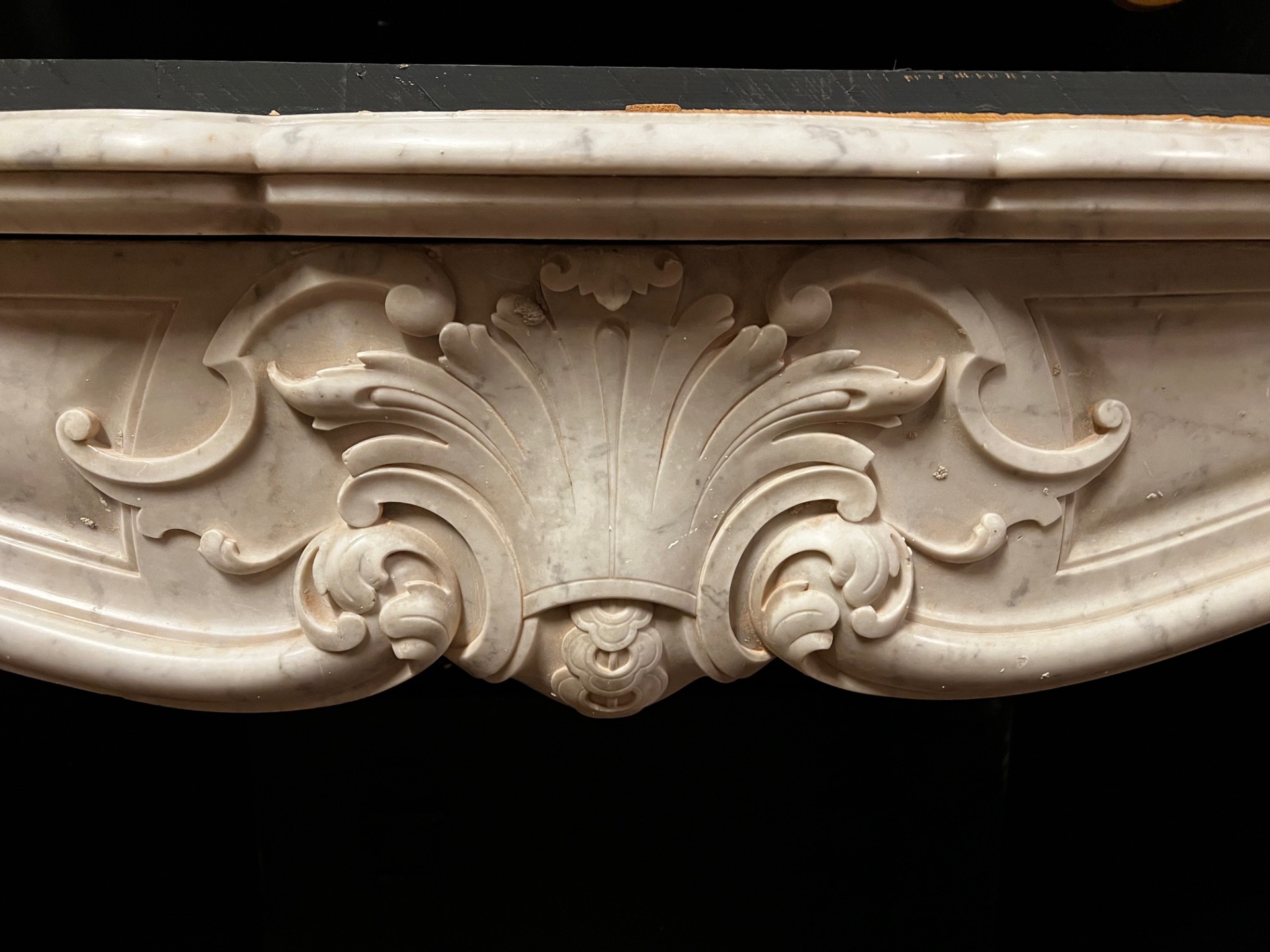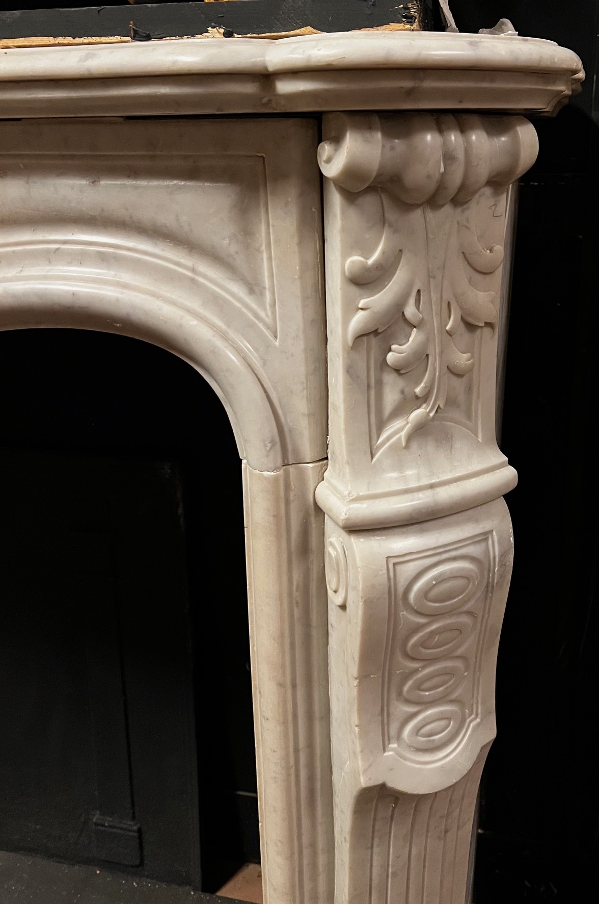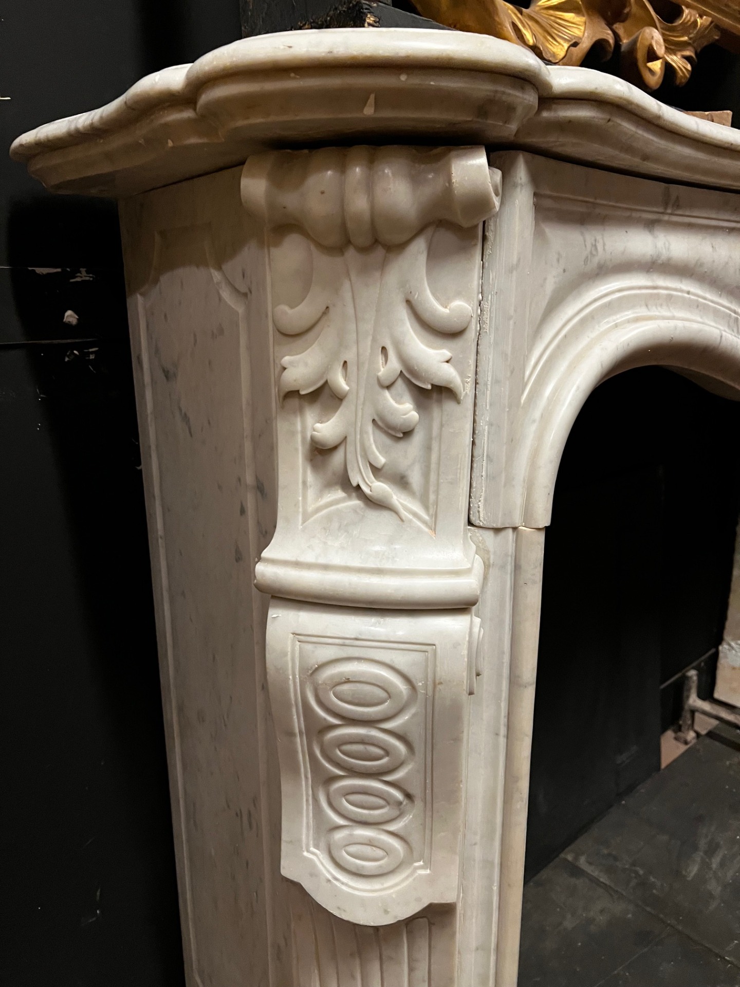 CHM902 - Camino in marmo bianco di Carrara, con ricca foglia d'Acanto scolpita.