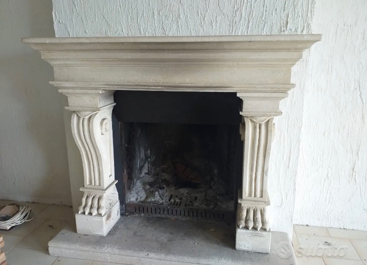 Camino a cornice, di inzio '900, in cemento. Presenta frontone modanato, gambe a ricciolo e piede a zampa di leone. Completo della sua soglia, Misura massima L 130 x H 115 cm