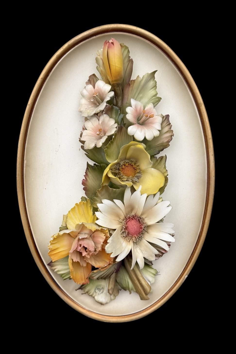 Bassorilievo ovale in porcellana con decoro floreale in rilievo.Capodimonte.