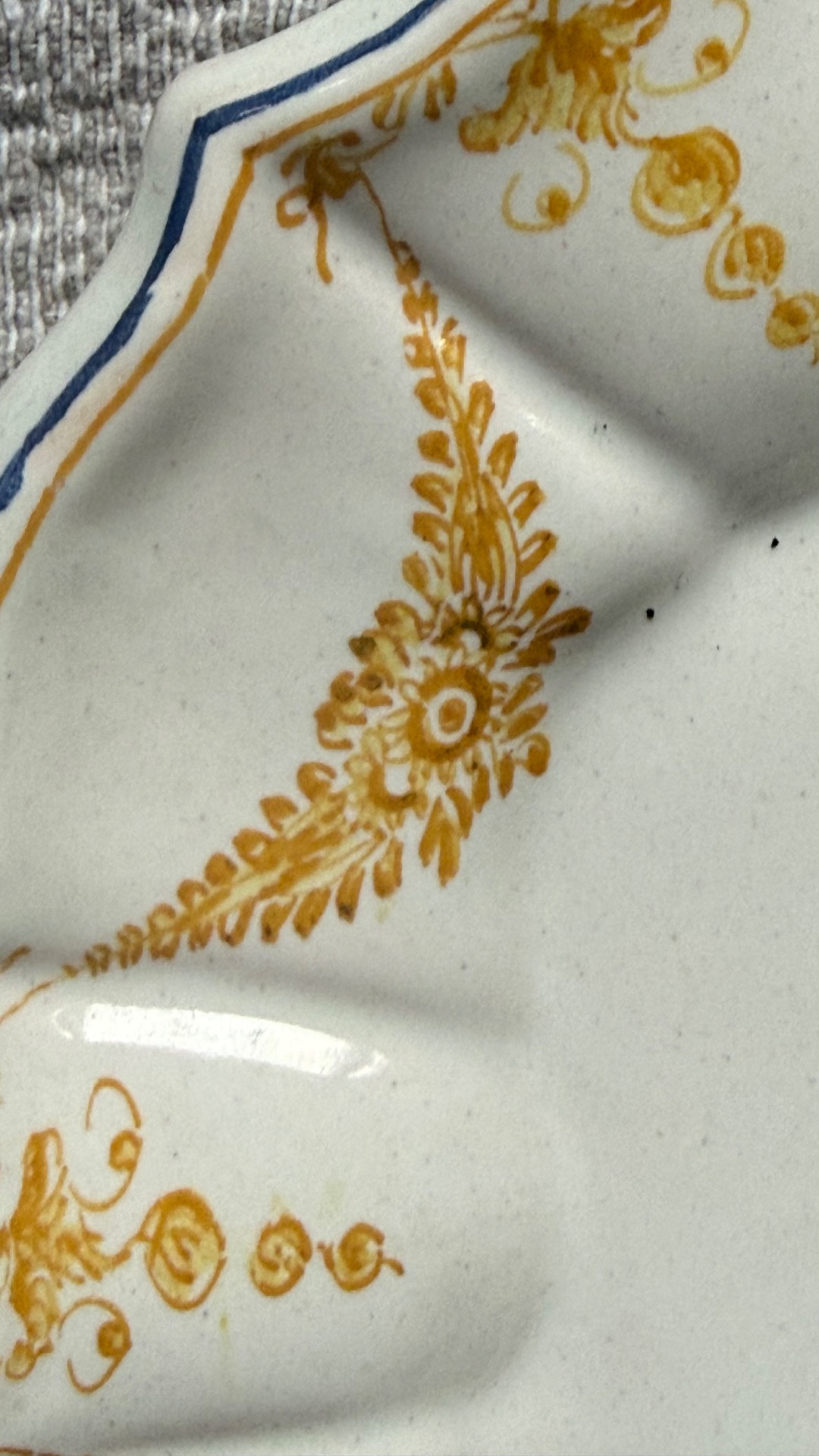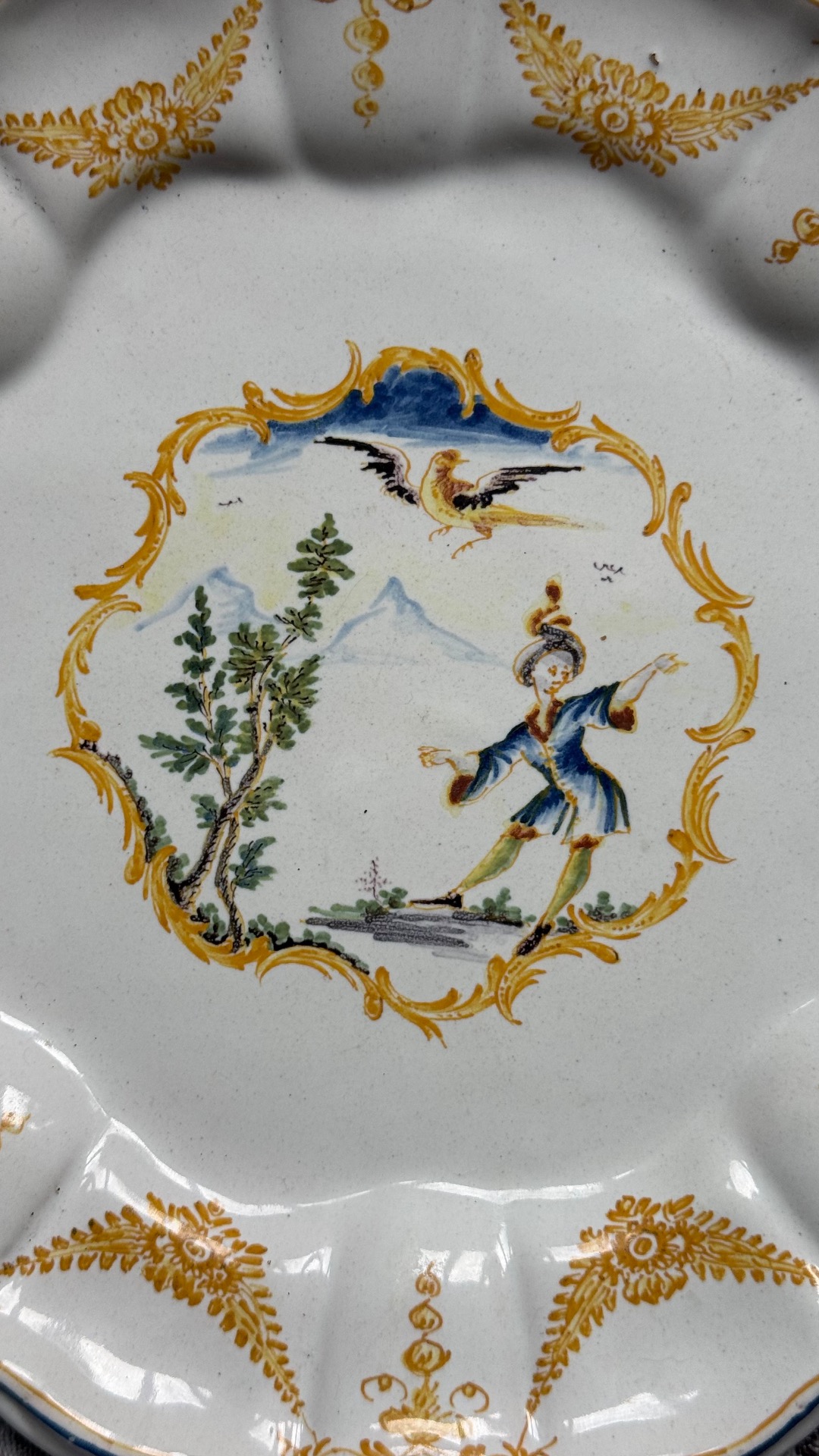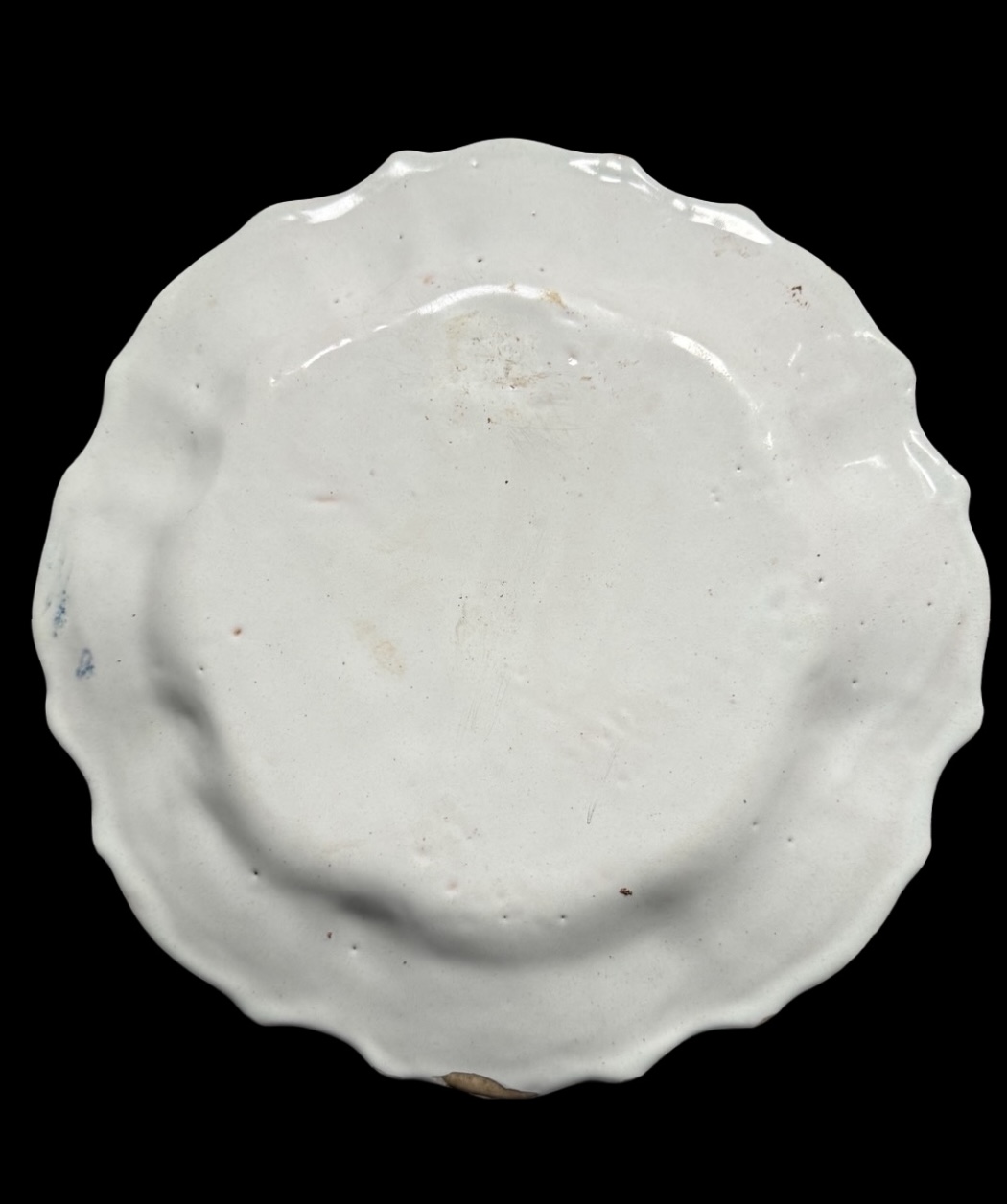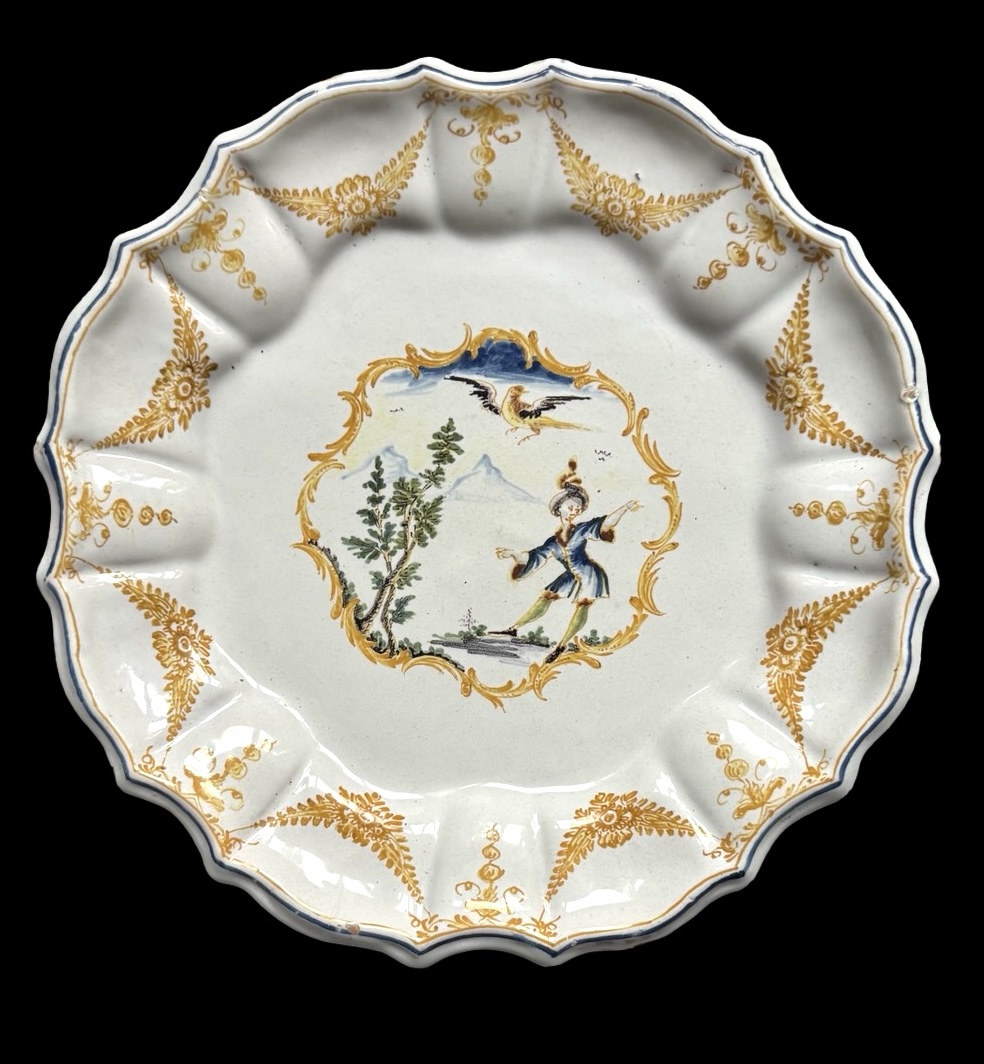 Piatto in maiolica a bordo lobato decorato con personaggio in ambiente agreste al centro e festoni floreali sulla tesa .Manifattura Coppellotti.Lodi.Cm 24,5.
