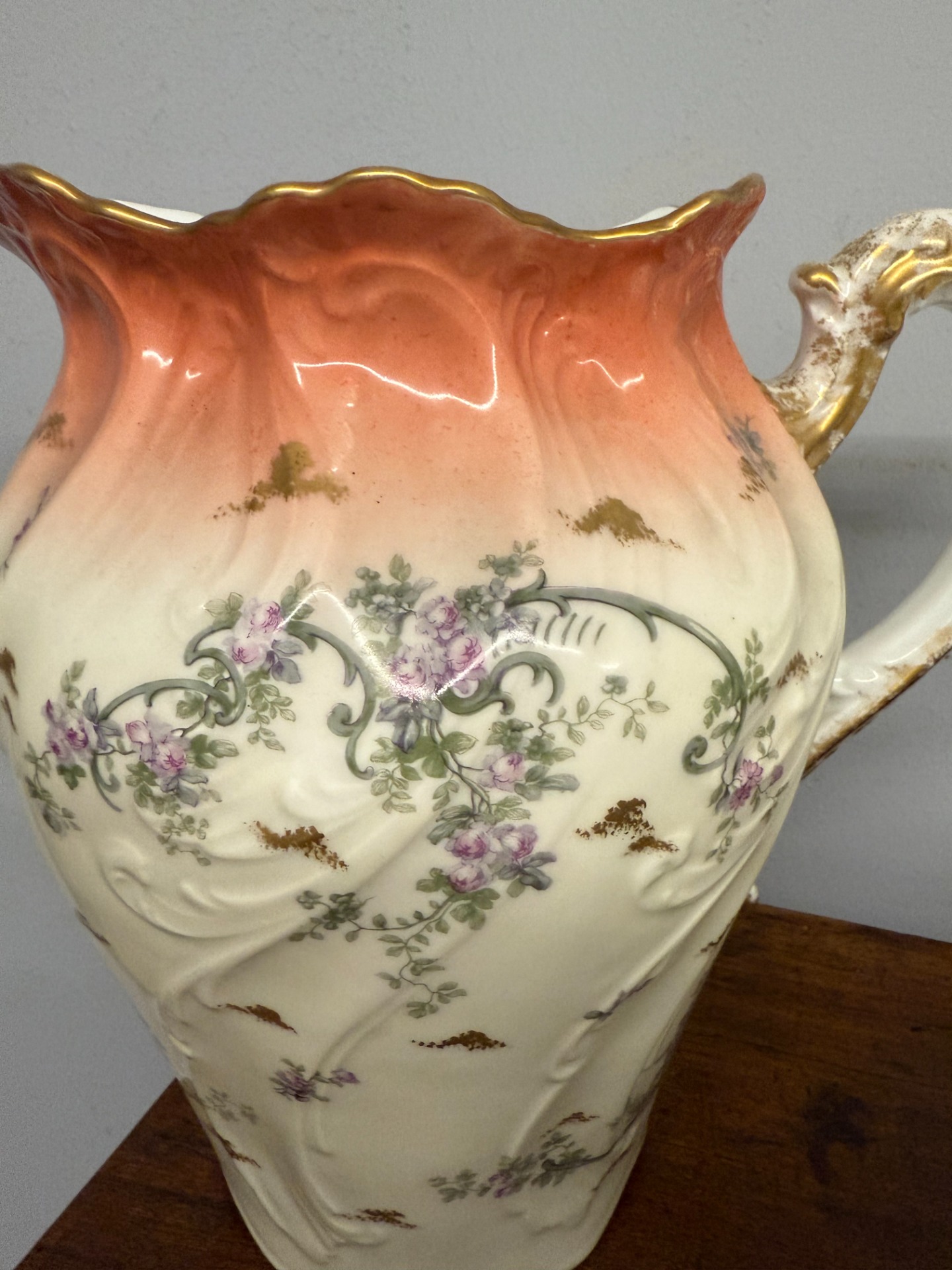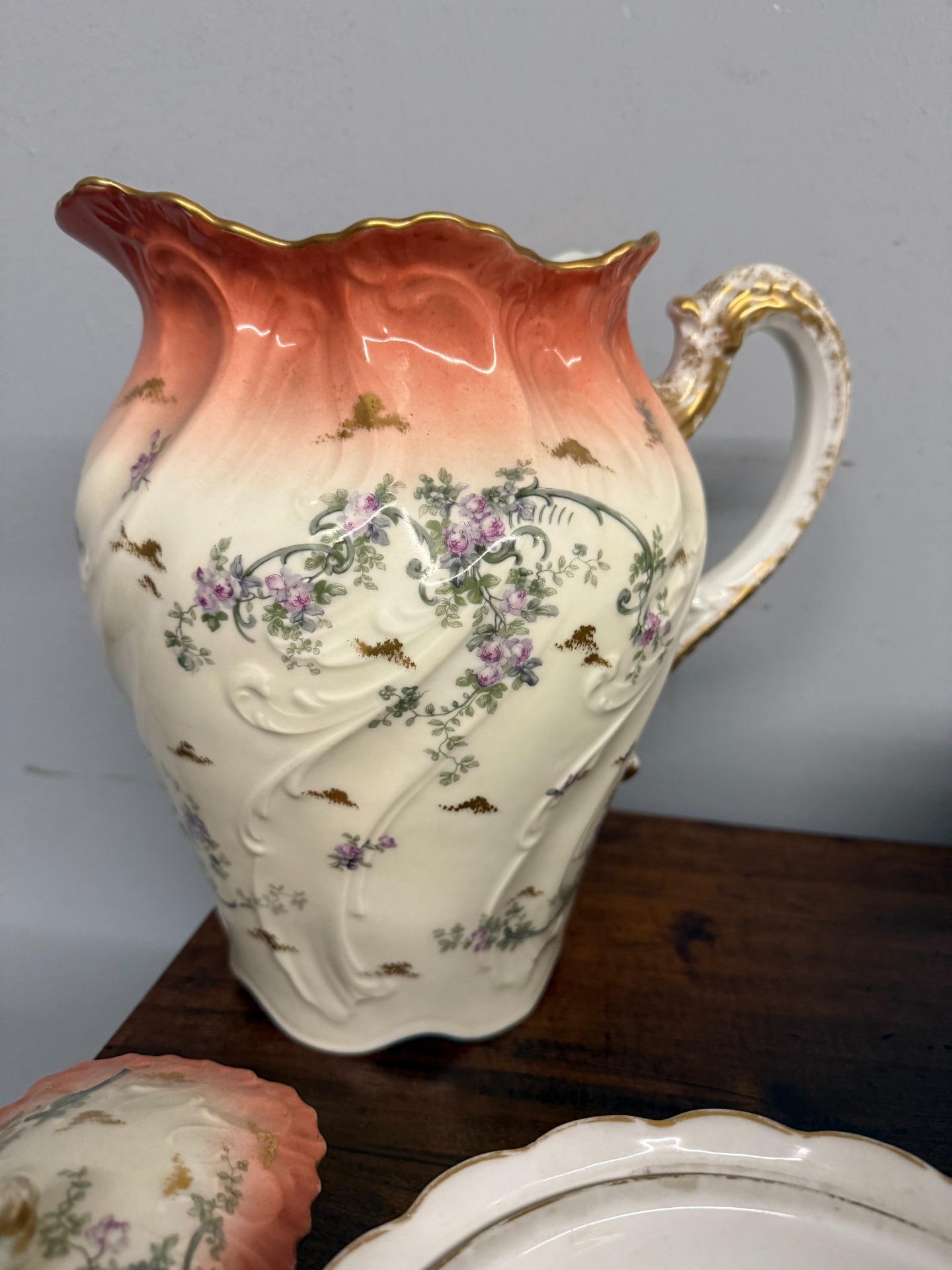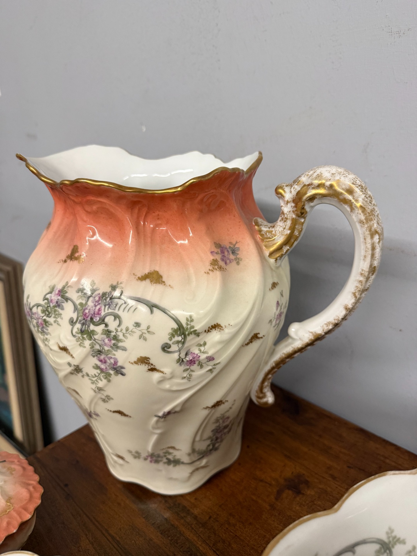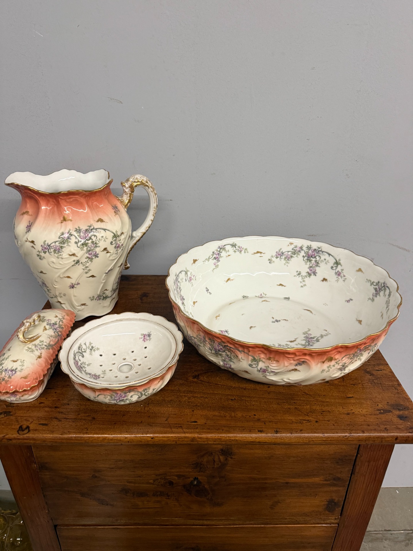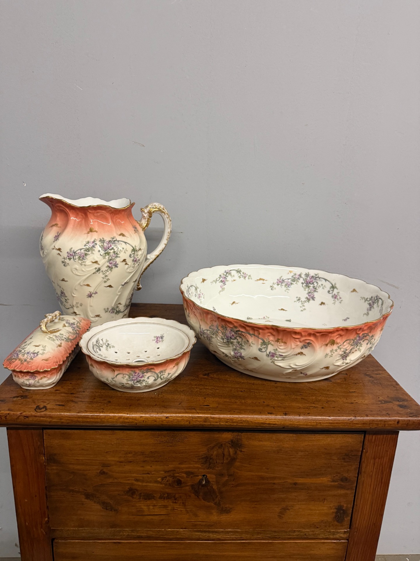 Antico set da toilet in porcellana Limoges per Bourgeois Paris, fine'800, 30x40cm. Composto da grande bacile (cm 40 diametro) grande versatoio (h30cm), bacile portasapone e contenitore per pettini. Marchiato alla base Limoges per Bourgeois Paris. Dipinto con motivi floreali su bianco e salmone con rifiniture in oro. Buono stato di conservazione.