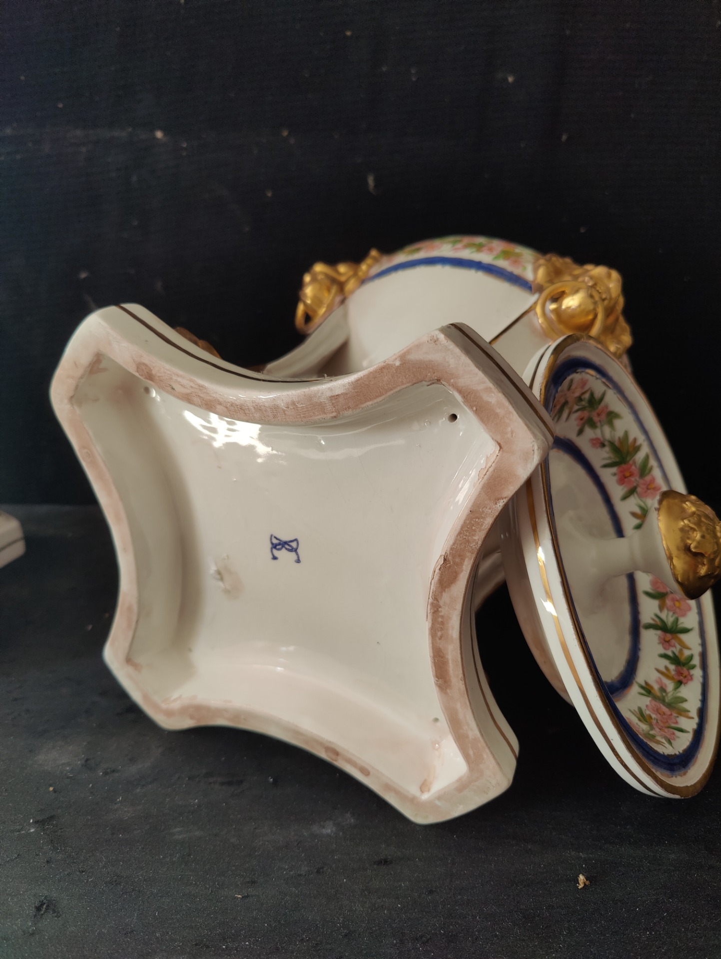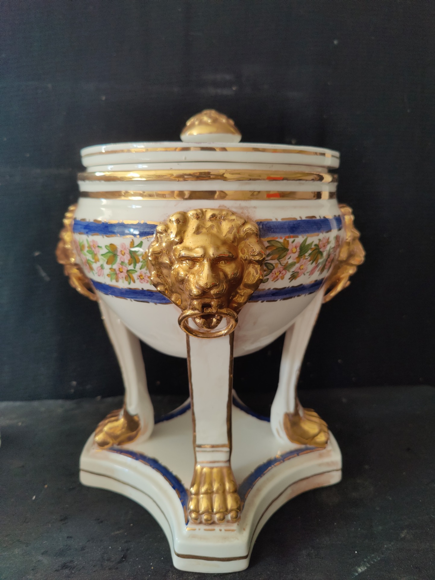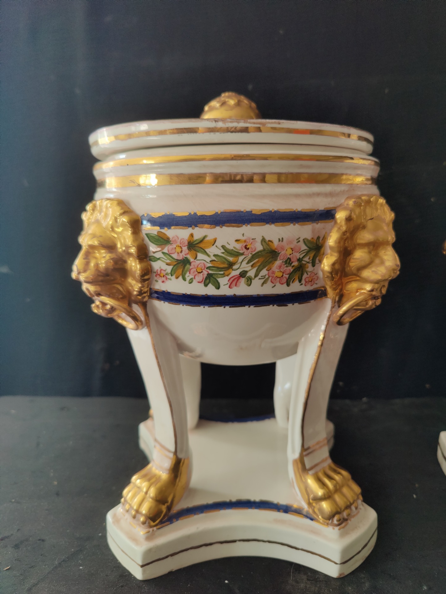 All'esterno presenta dei volti di leone, simbolo della città di Venezia e alla base ci sono le zampe, fenomenale l'idea di creare tale continuità dell'animale. Il coperchio, così come il contenitore, esibisce una ghirlanda floreale che decora tutta la ceramica, la doratura, che è ancora molto abbagliante e luminosa, completa l'opera.