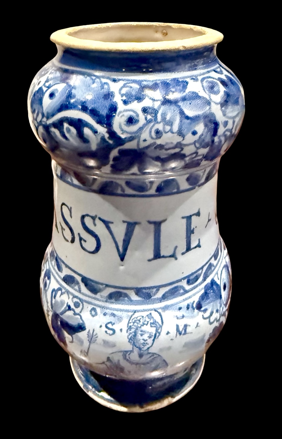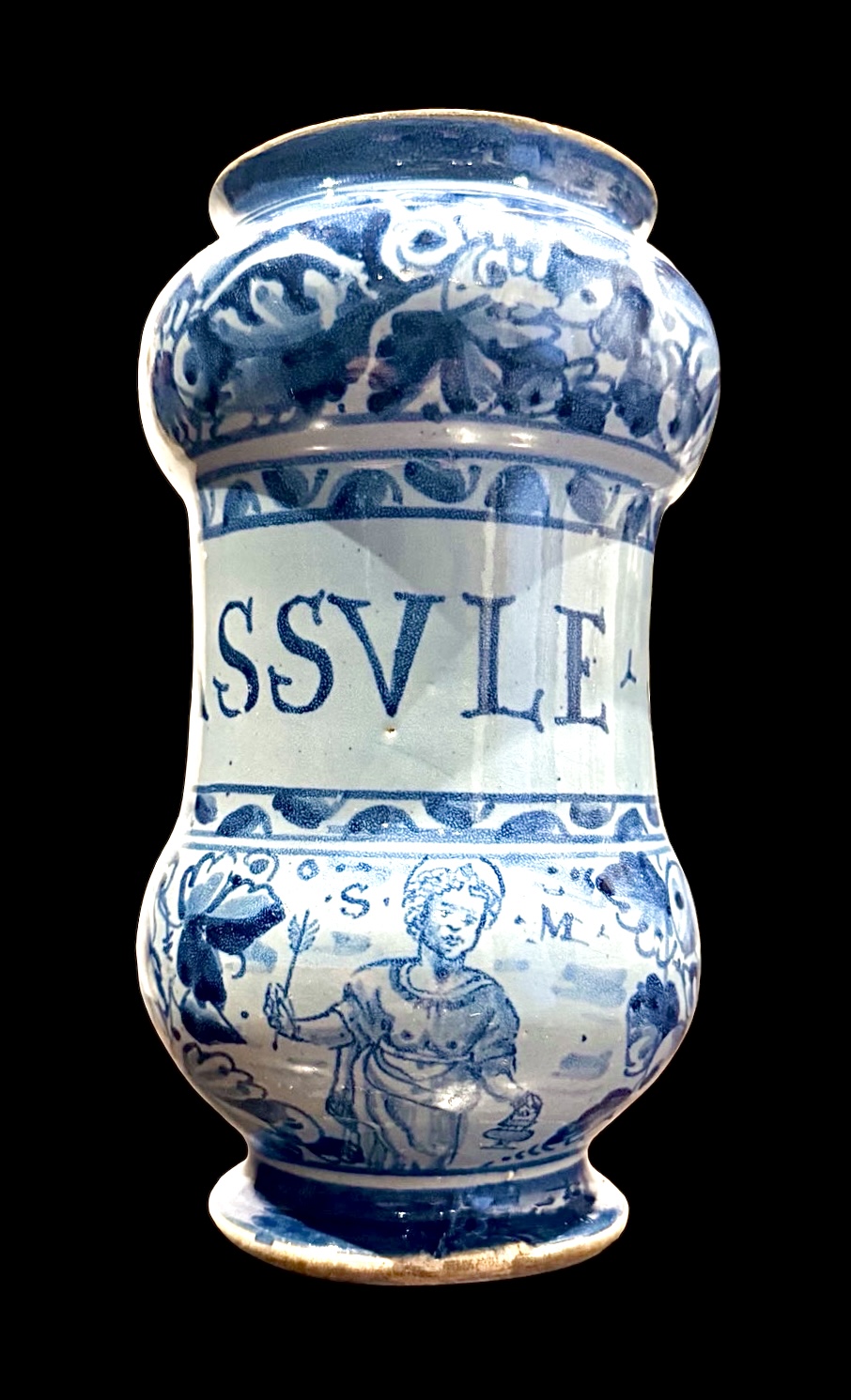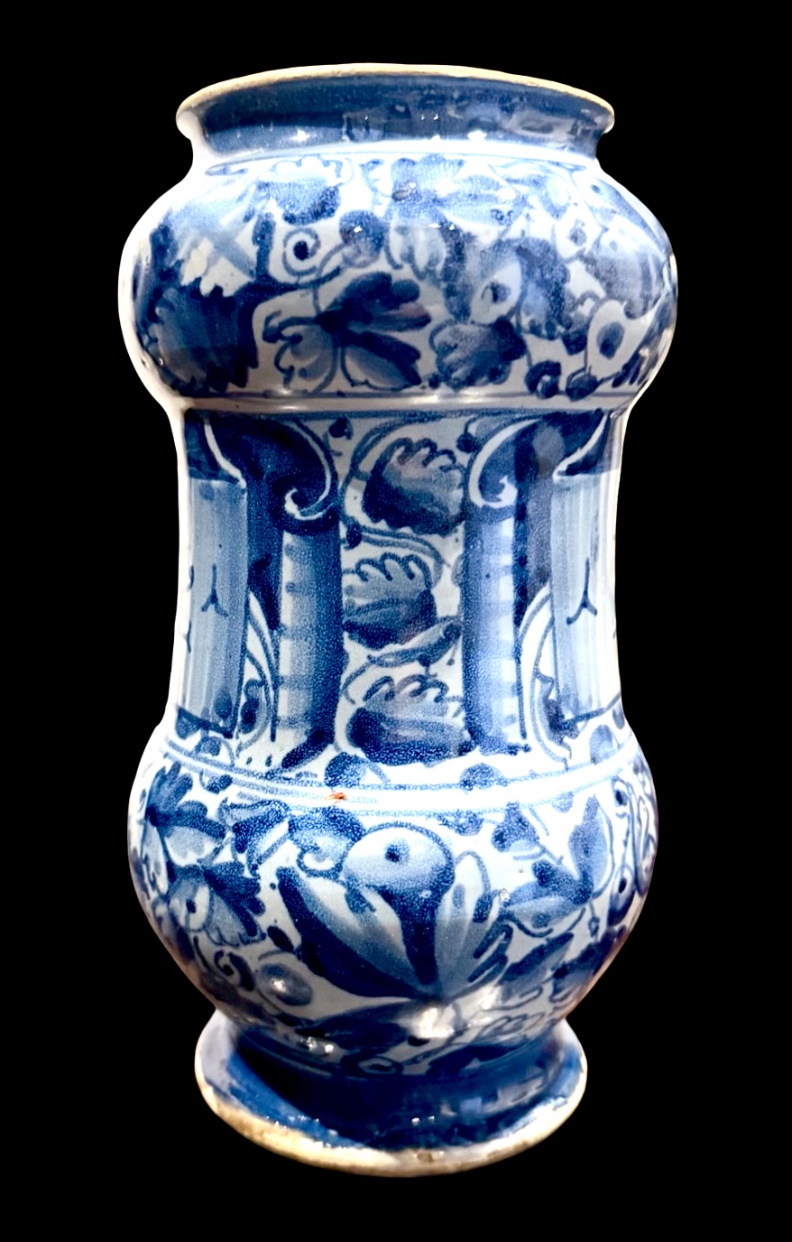 Albarello in maiolica a ‘rocchetto’ a sfondo berettino con decoro a foglie di quercia e con figura di santo.Roma.Cm 20x11.Base:cm 8.