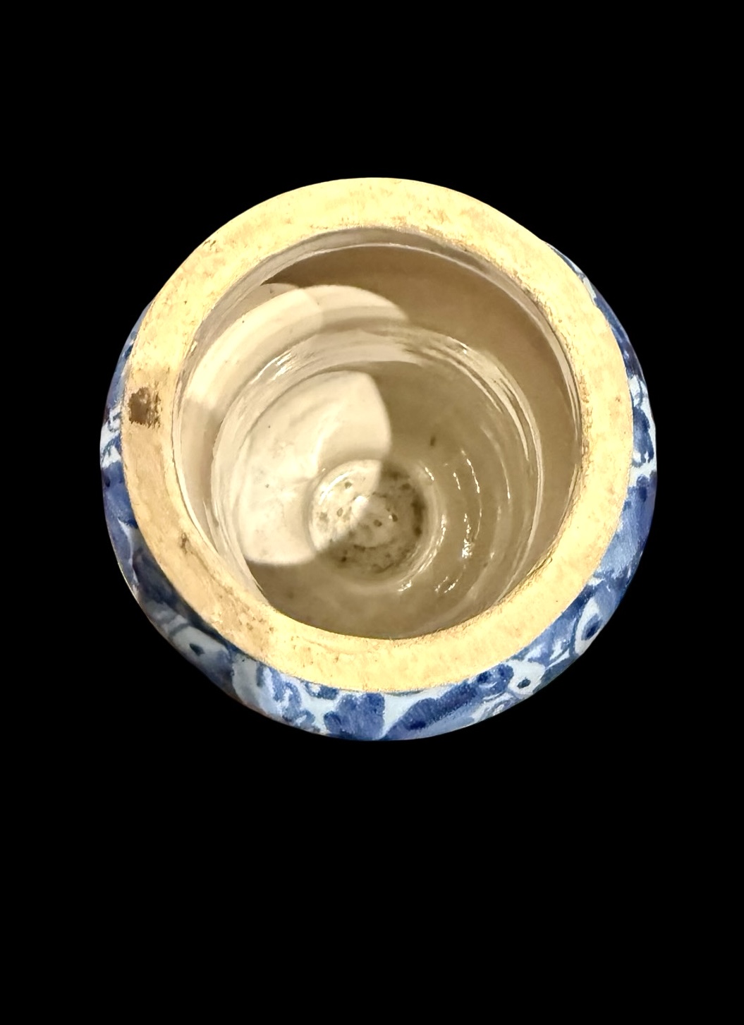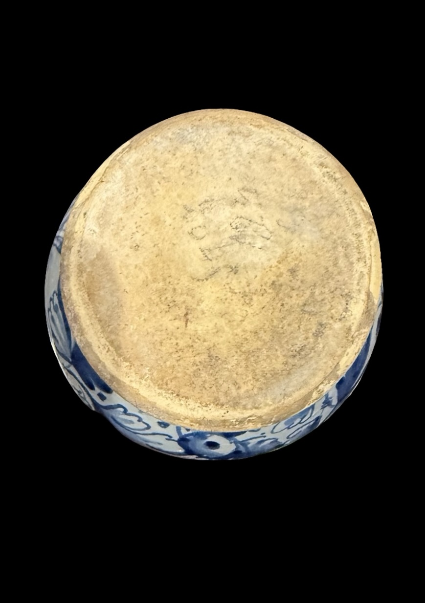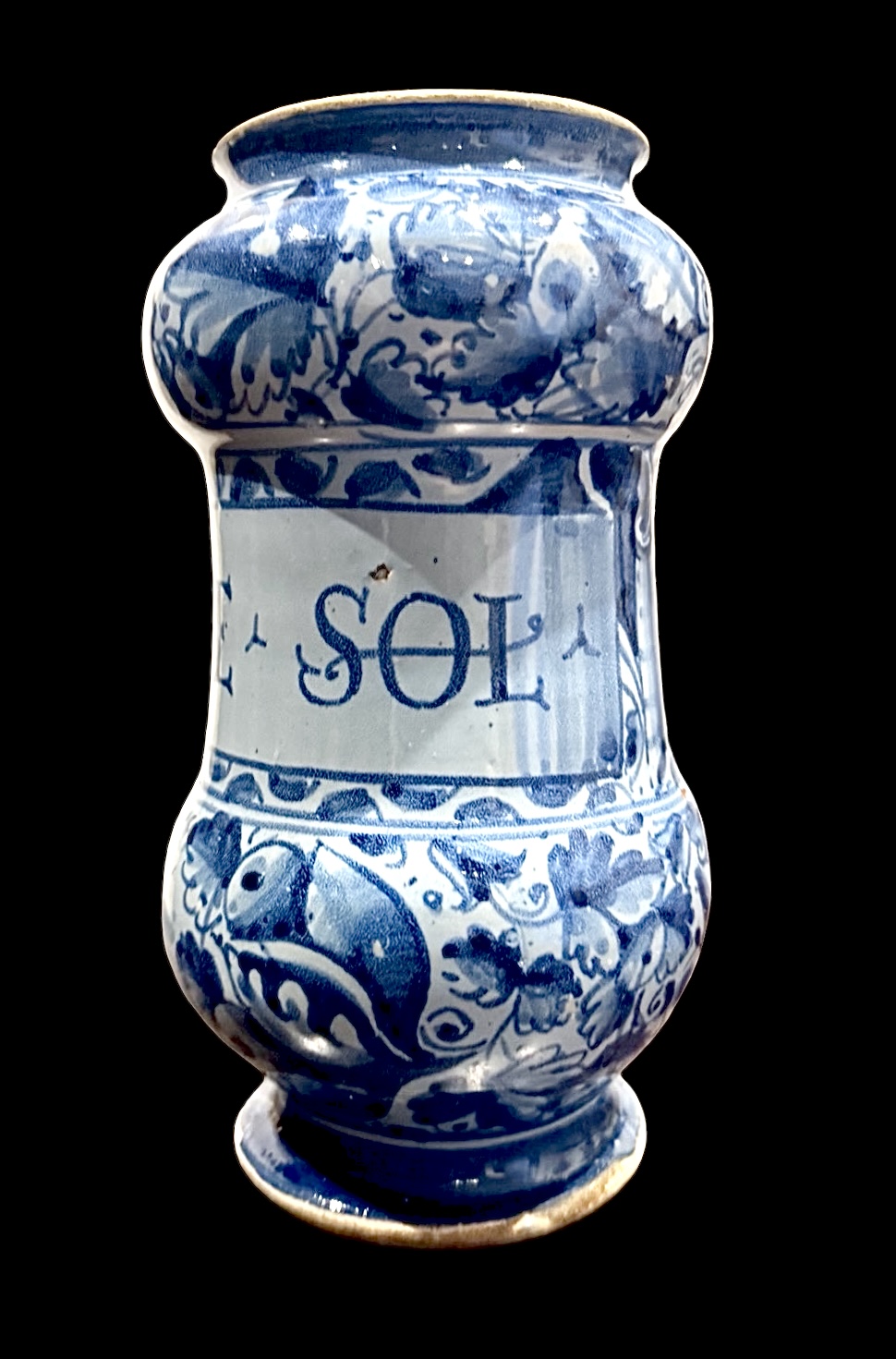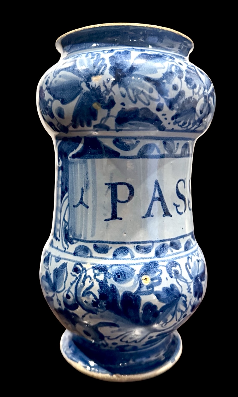 Albarello in maiolica a ‘rocchetto’ a sfondo berettino con decoro a foglie di quercia e con figura di santo.Roma.Cm 20x11.Base:cm 8.