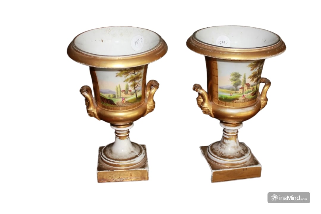 Coppia di bellissimi vasi francesi a cratere della seconda metà del 1800 in porcellana decorata Vecchia Parigi. Raffigurati paesaggi e personaggi su entrambi i lati dei vasi e profili dorati.