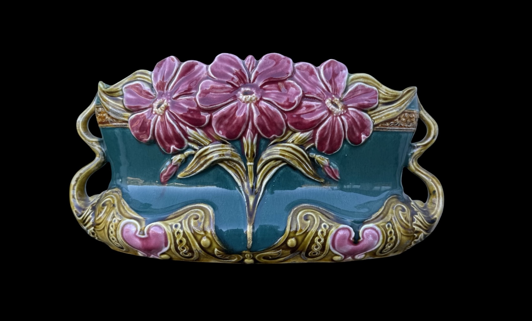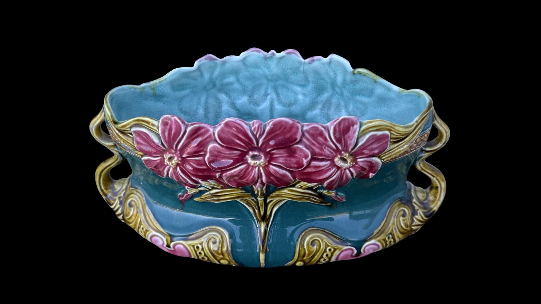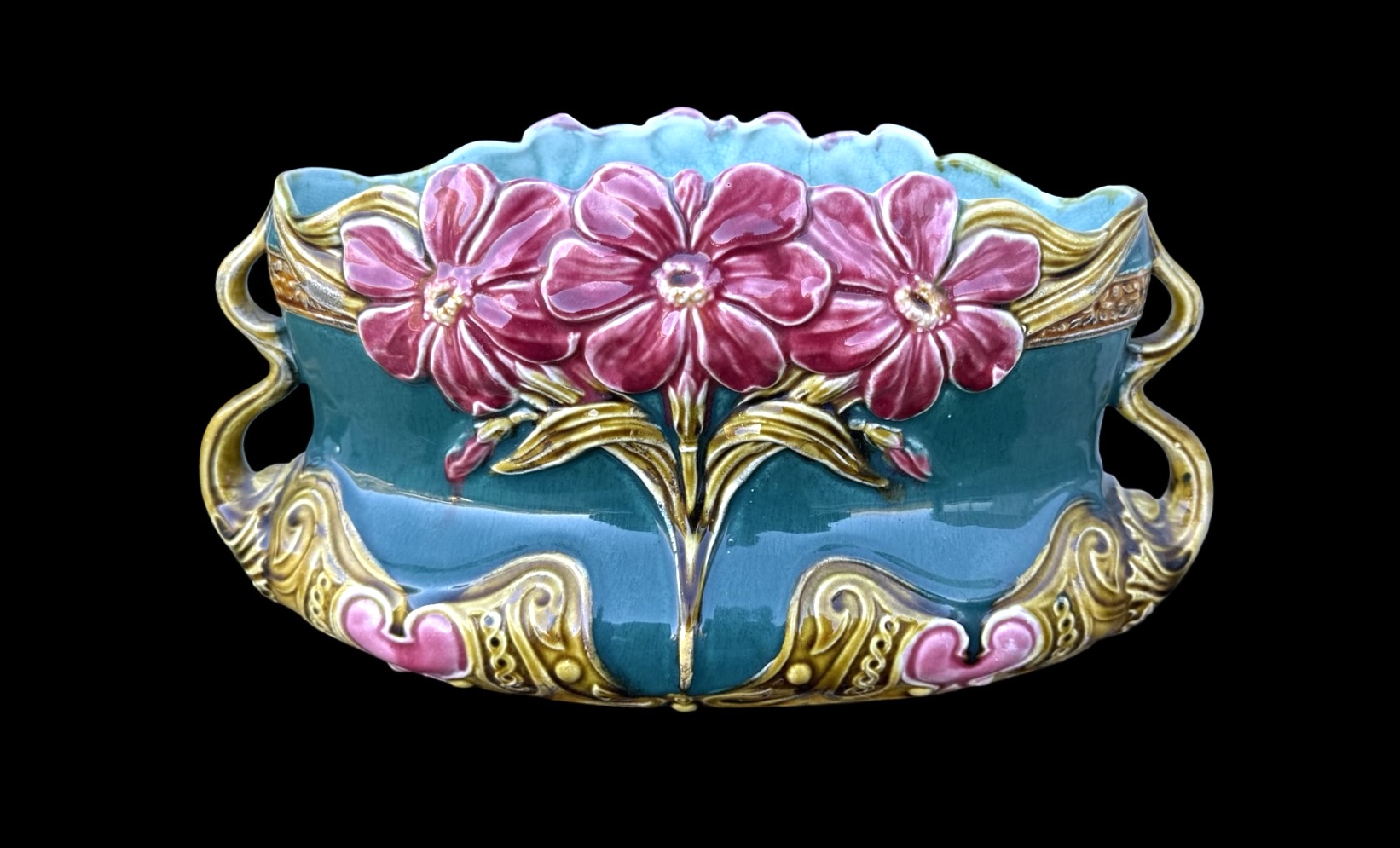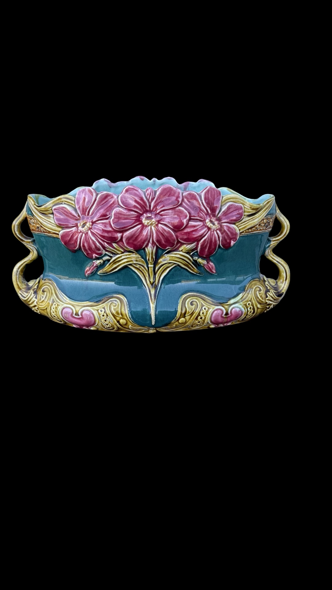 Vaso cache-pot barbottina in terraglia decorato a fiori narcisi.Periodo Liberty.Manifattura Onnaing.Francia.Cm 32x13.H:cm 16.