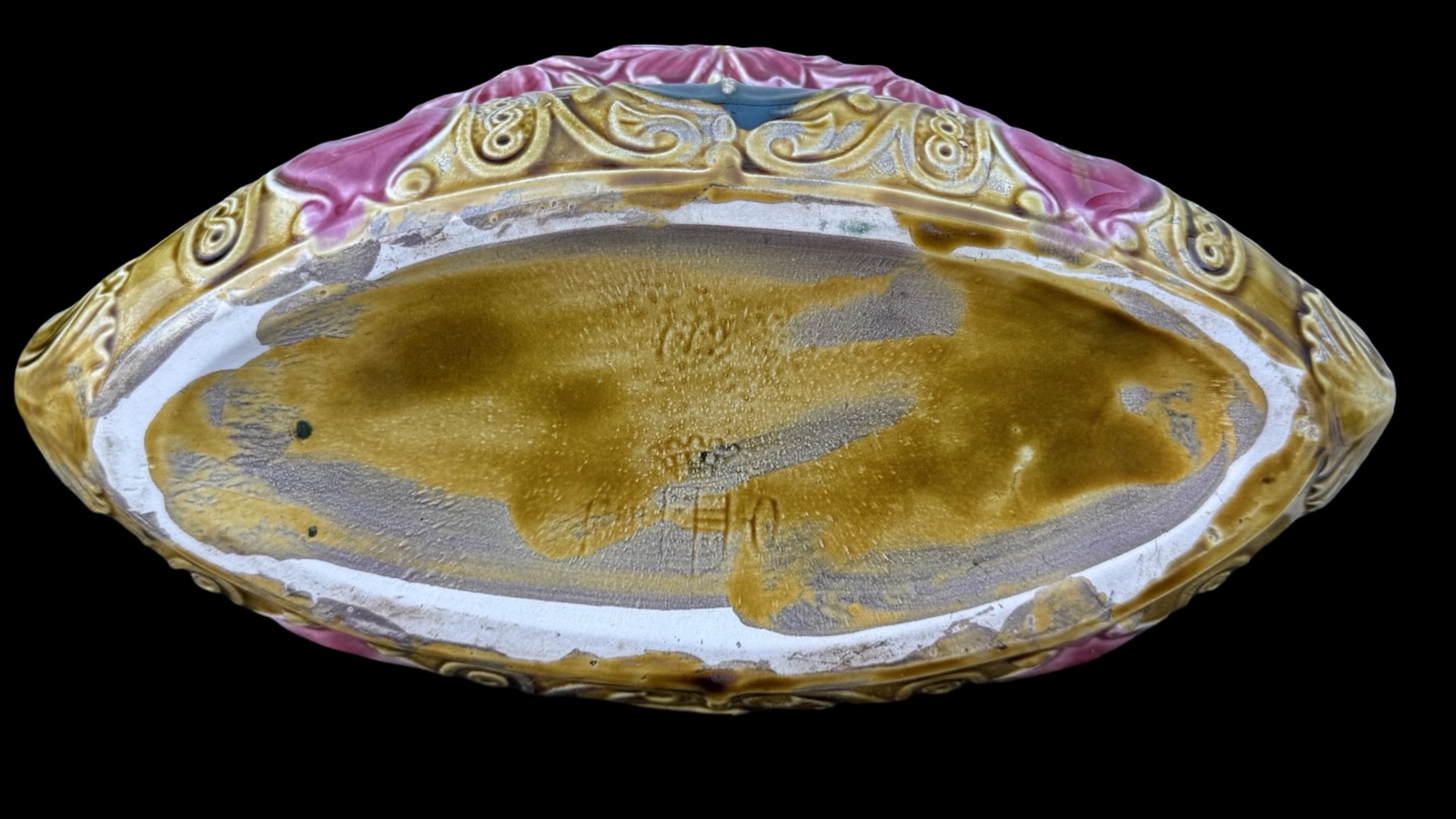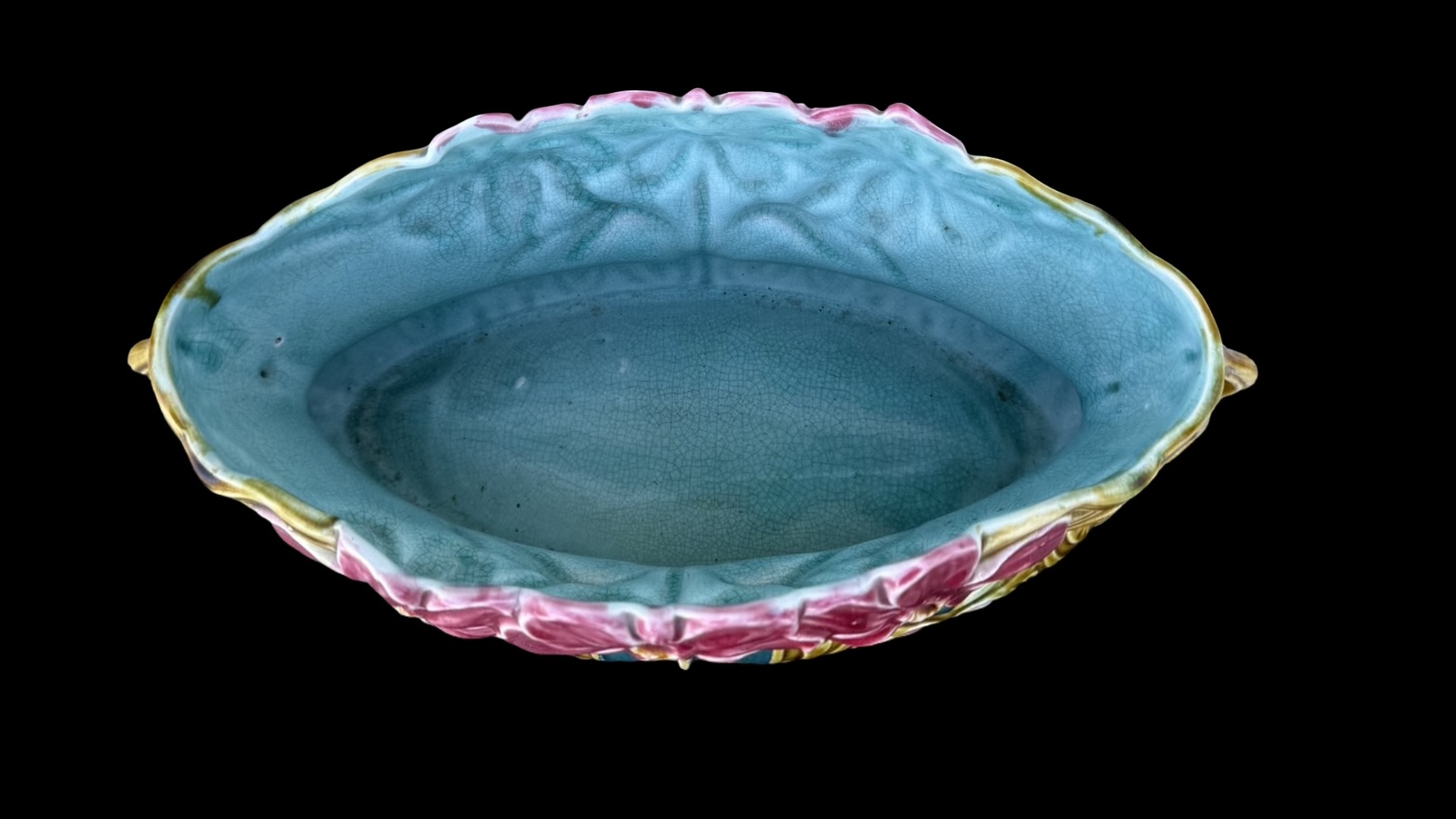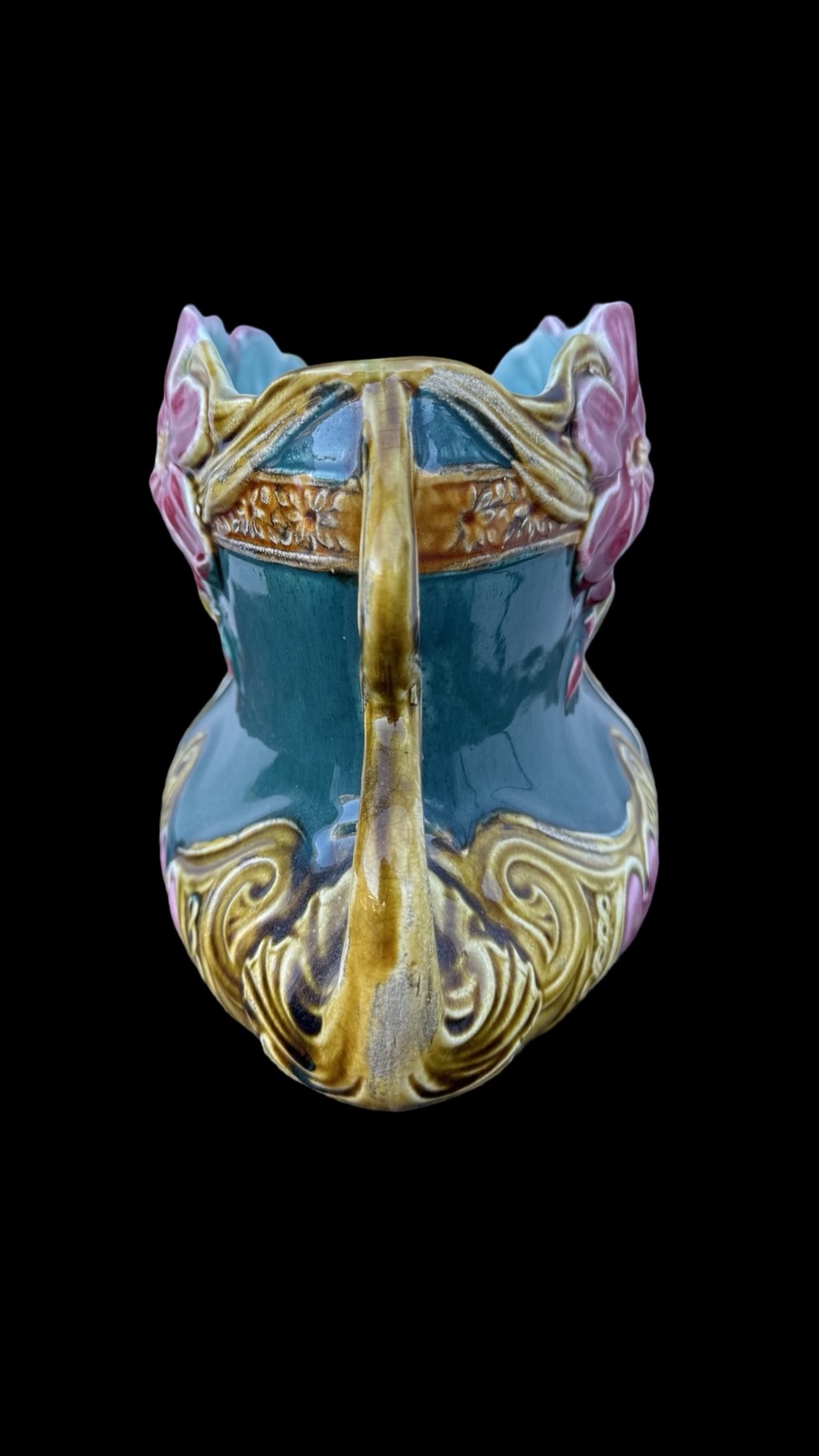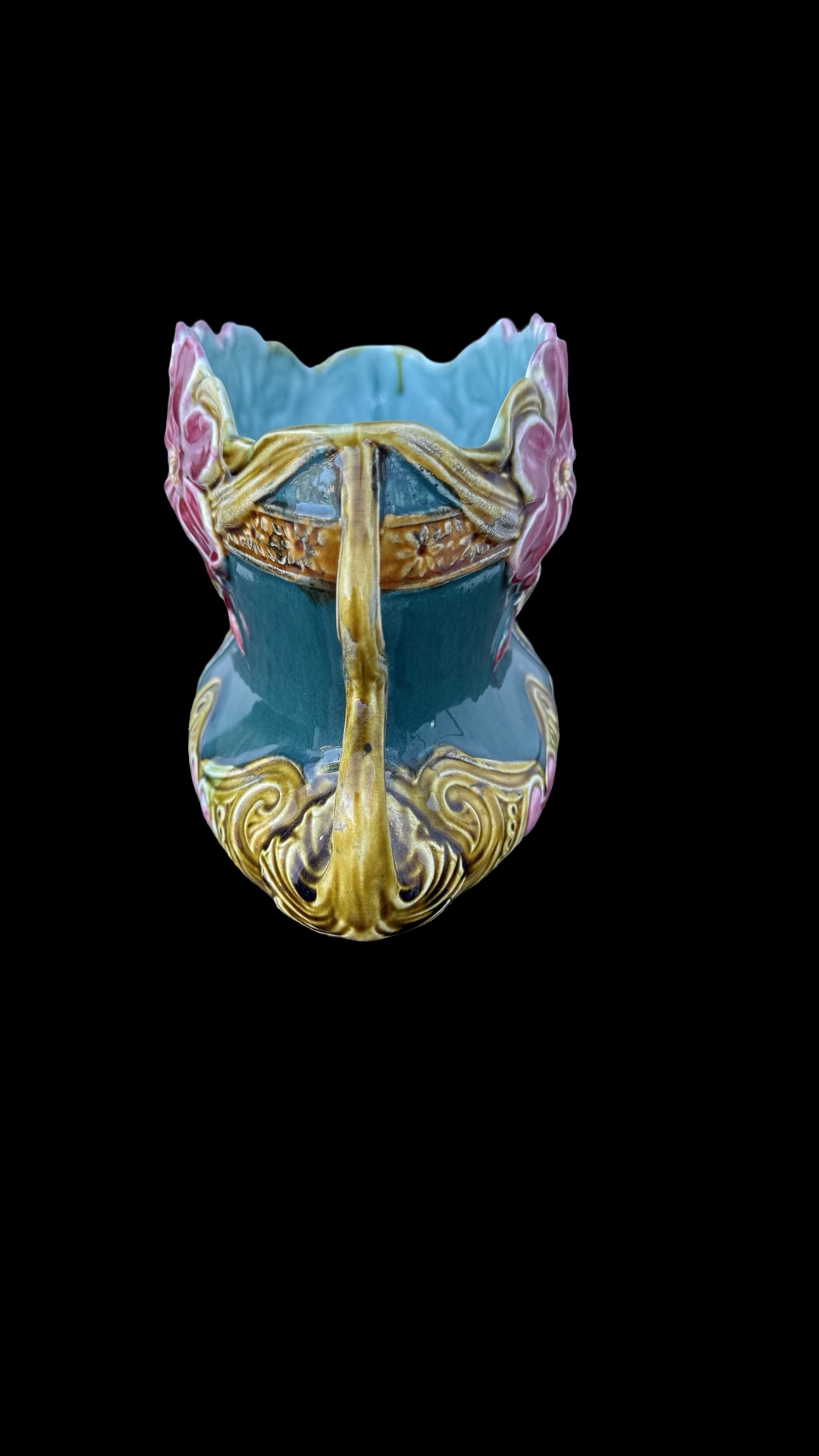 Vaso cache-pot barbottina in terraglia decorato a fiori narcisi.Periodo Liberty.Manifattura Onnaing.Francia.Cm 32x13.H:cm 16.