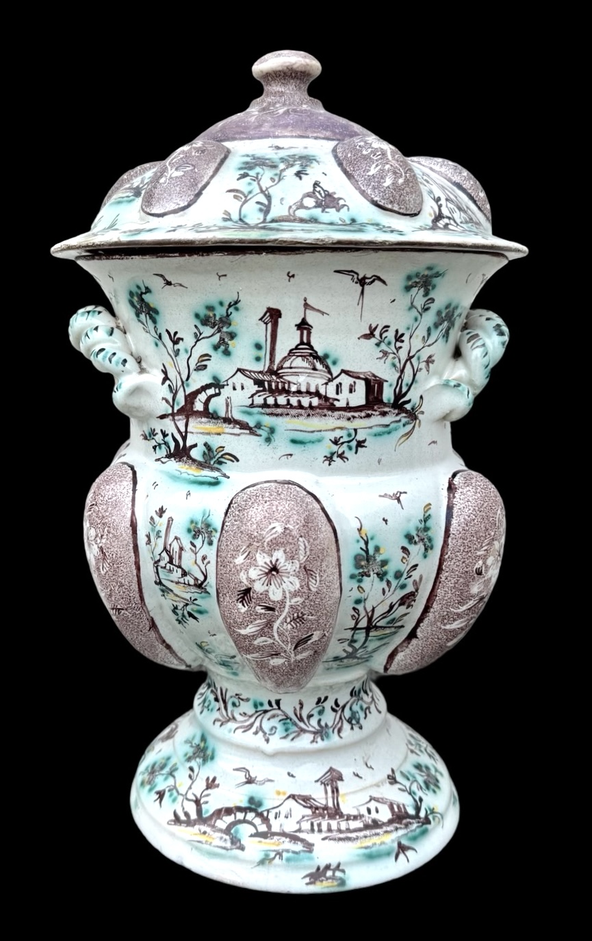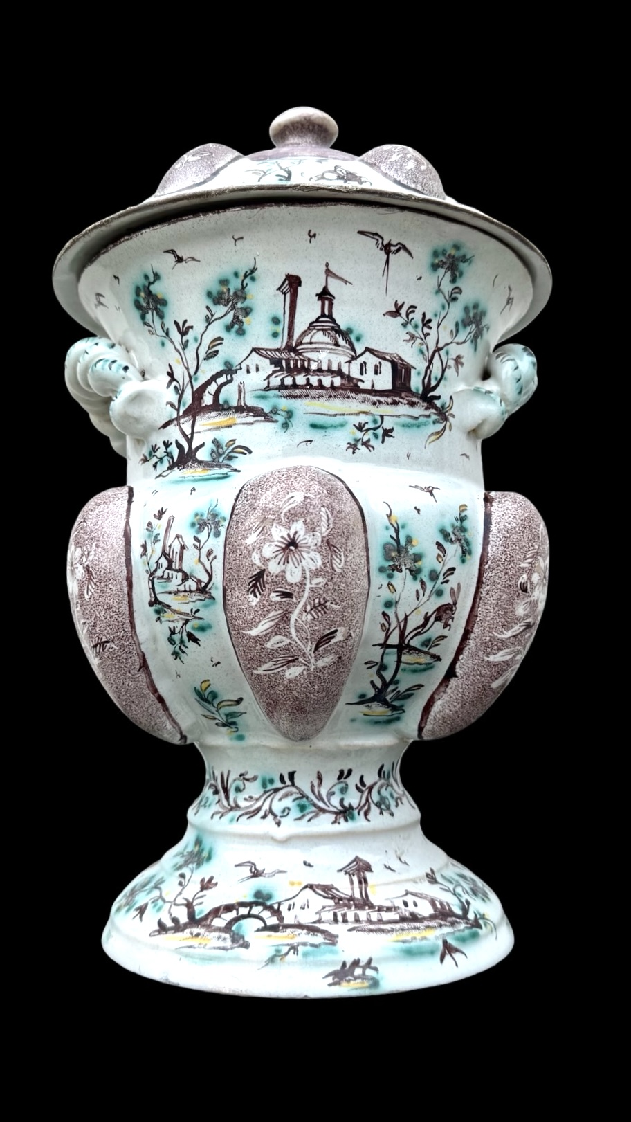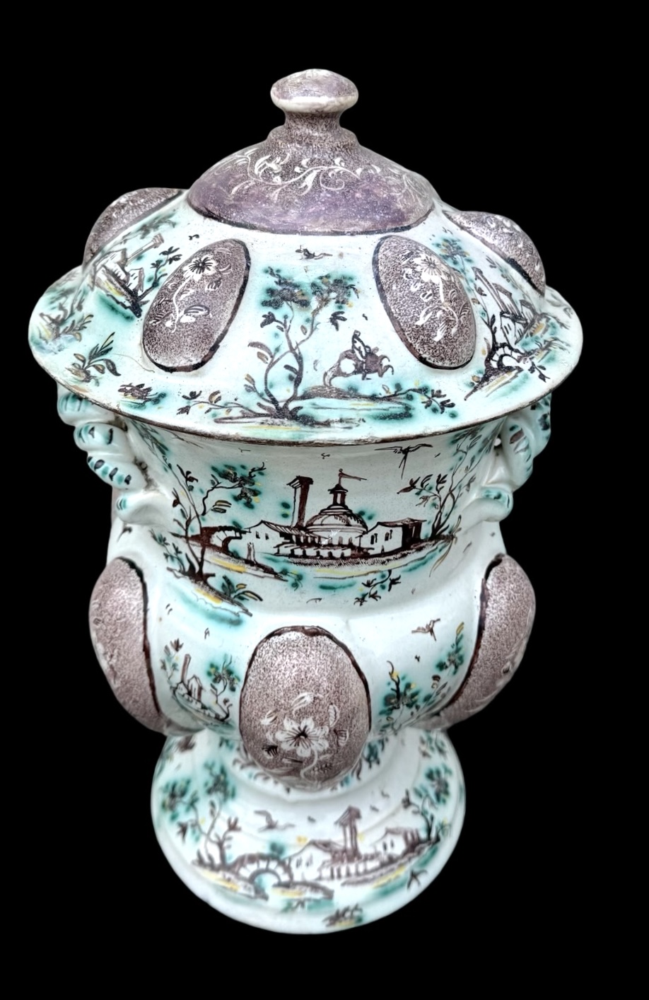 Vaso in maiolica con decoro a personaggi ed architetture.Firma Levantino.Savona.