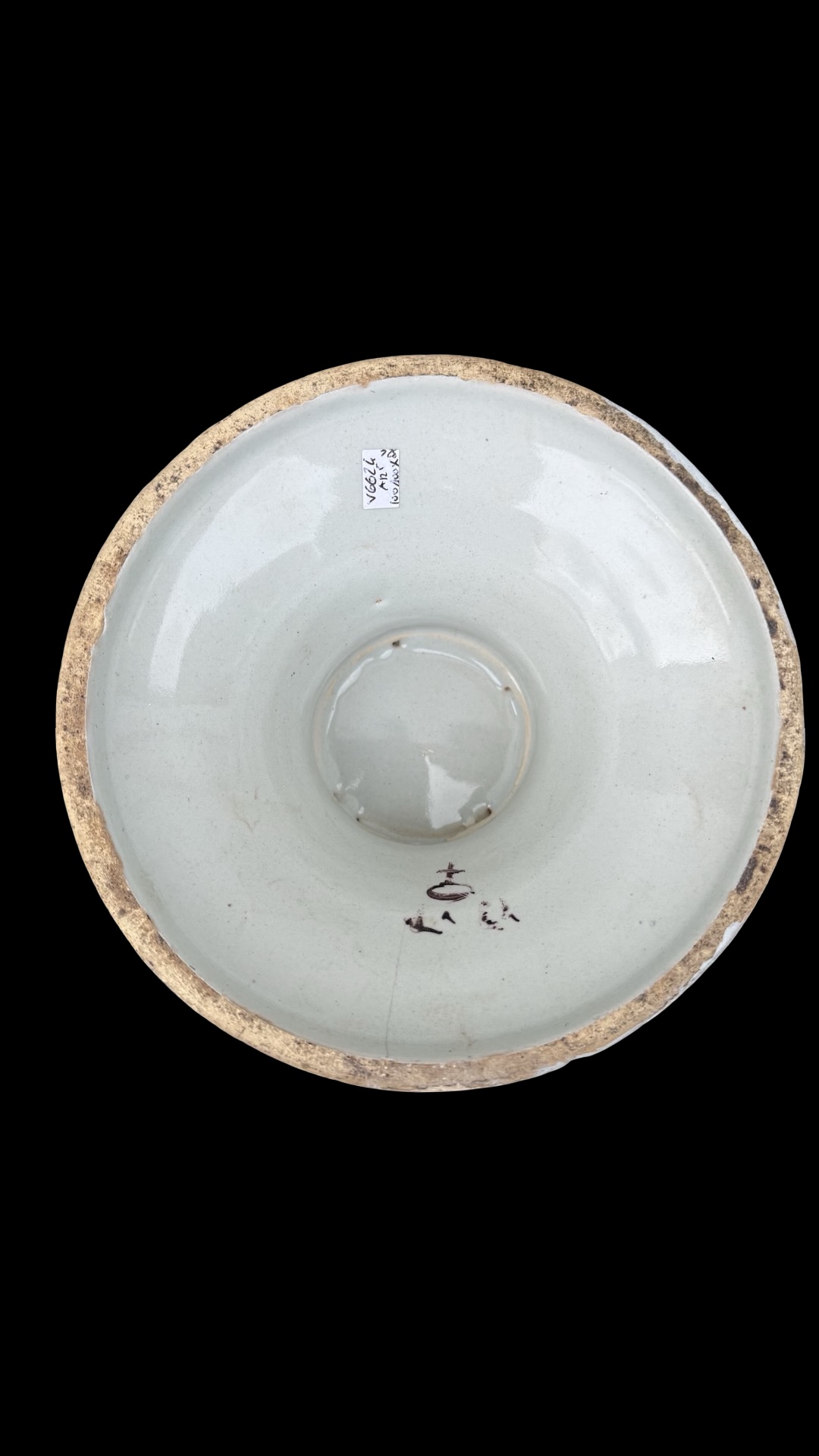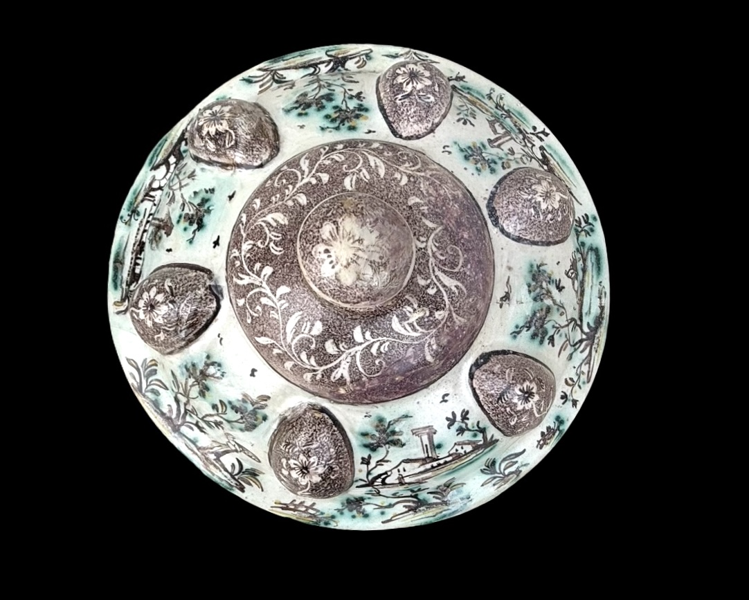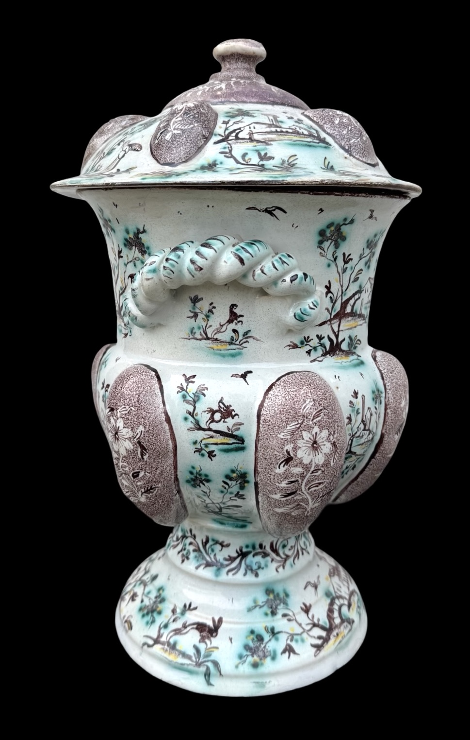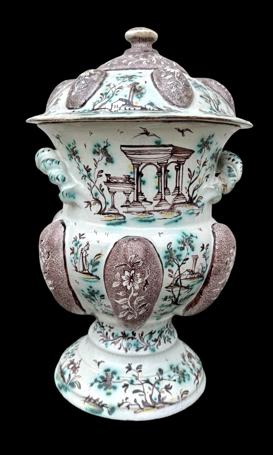 Vaso in maiolica con decoro a personaggi ed architetture.Firma Levantino.Savona.