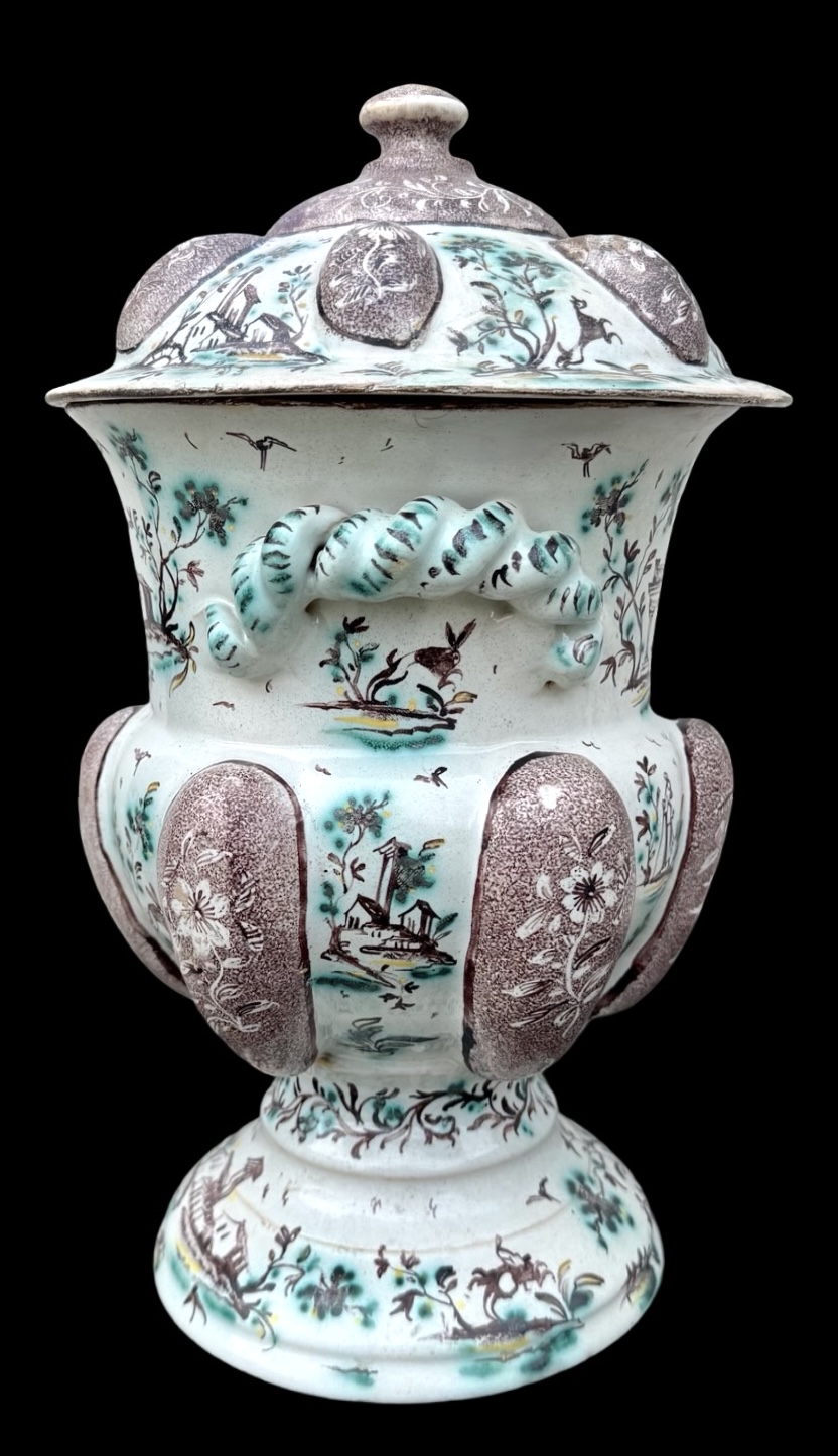 Vaso in maiolica con corpo bugnato e manici intrecciati.Decoro a personaggi,architetture e motivi vegetali.Firma globo crucigero della manifattura Levantino.Savona.Cm 35x21.Base:cm 15.