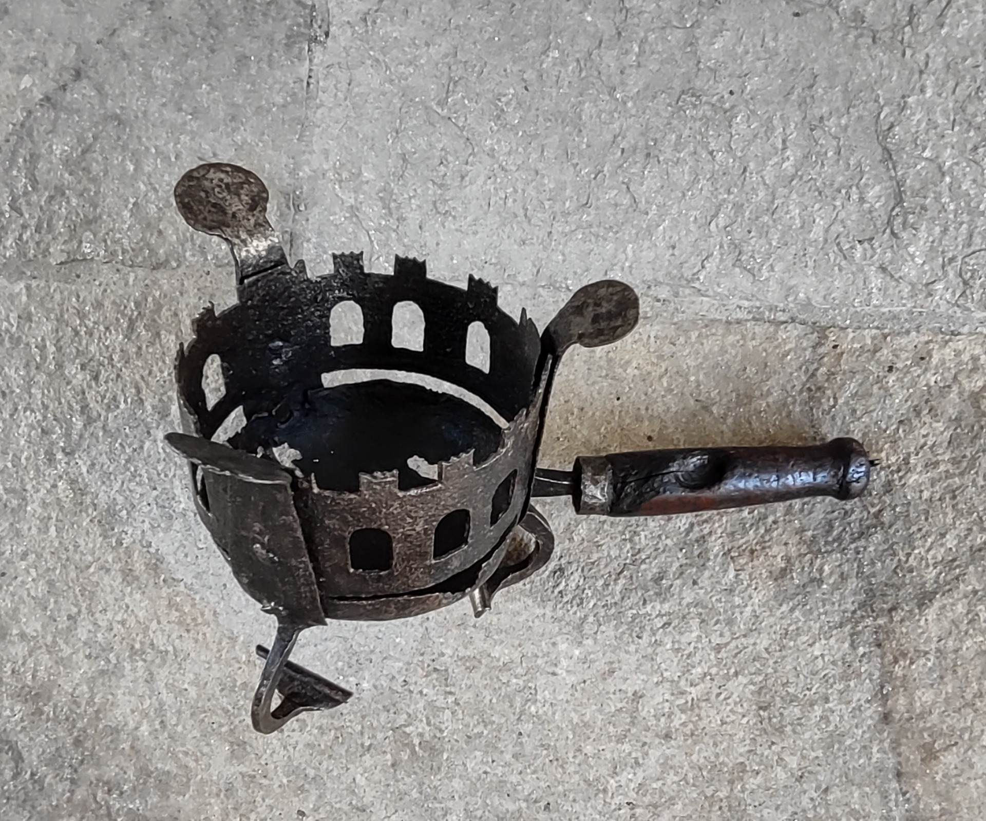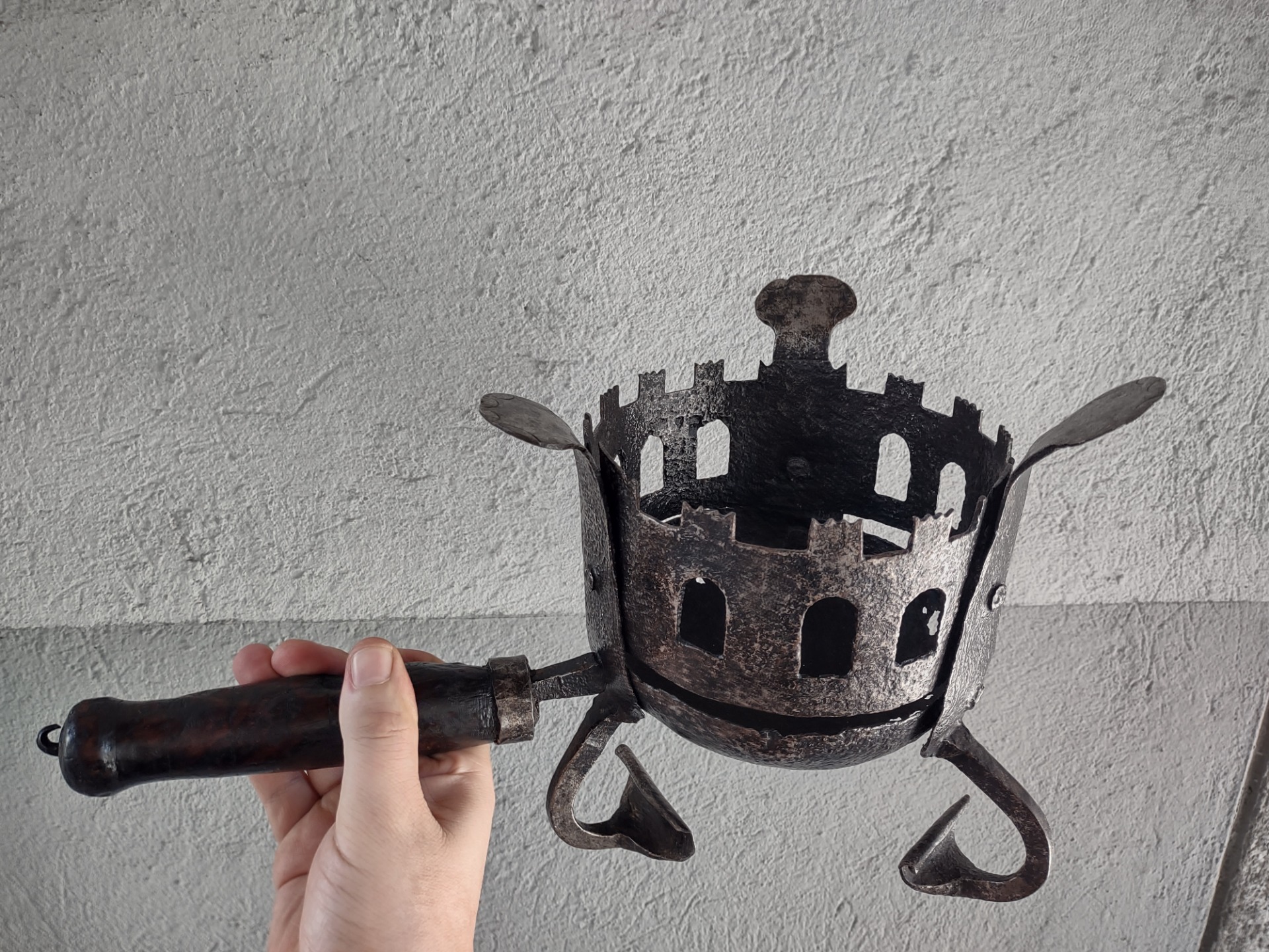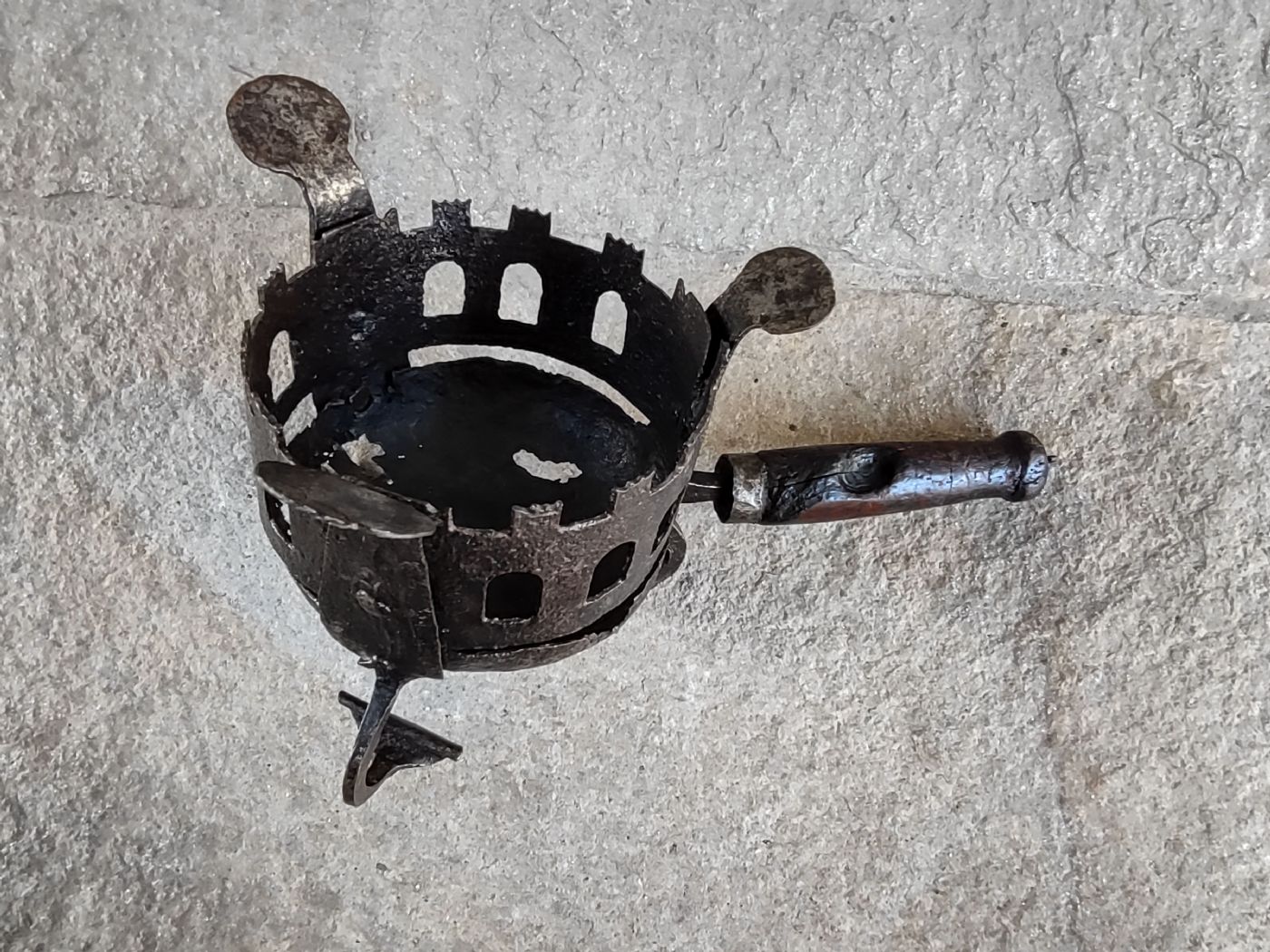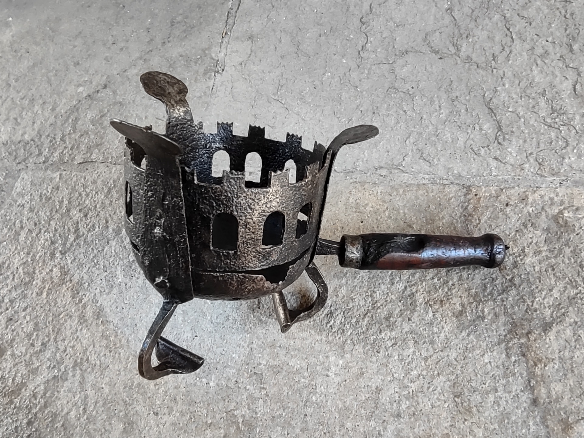 Splendido braciere a castello in ferro forgiato e traforato. Manico in noce originale.Il fondo presenta evidenti segni di usura a causa dell'epoca e del calore delle fiamme.