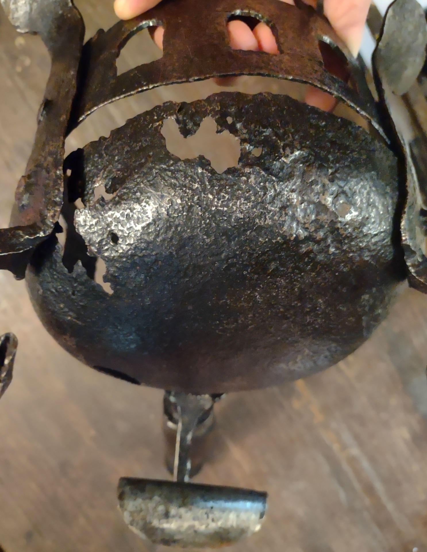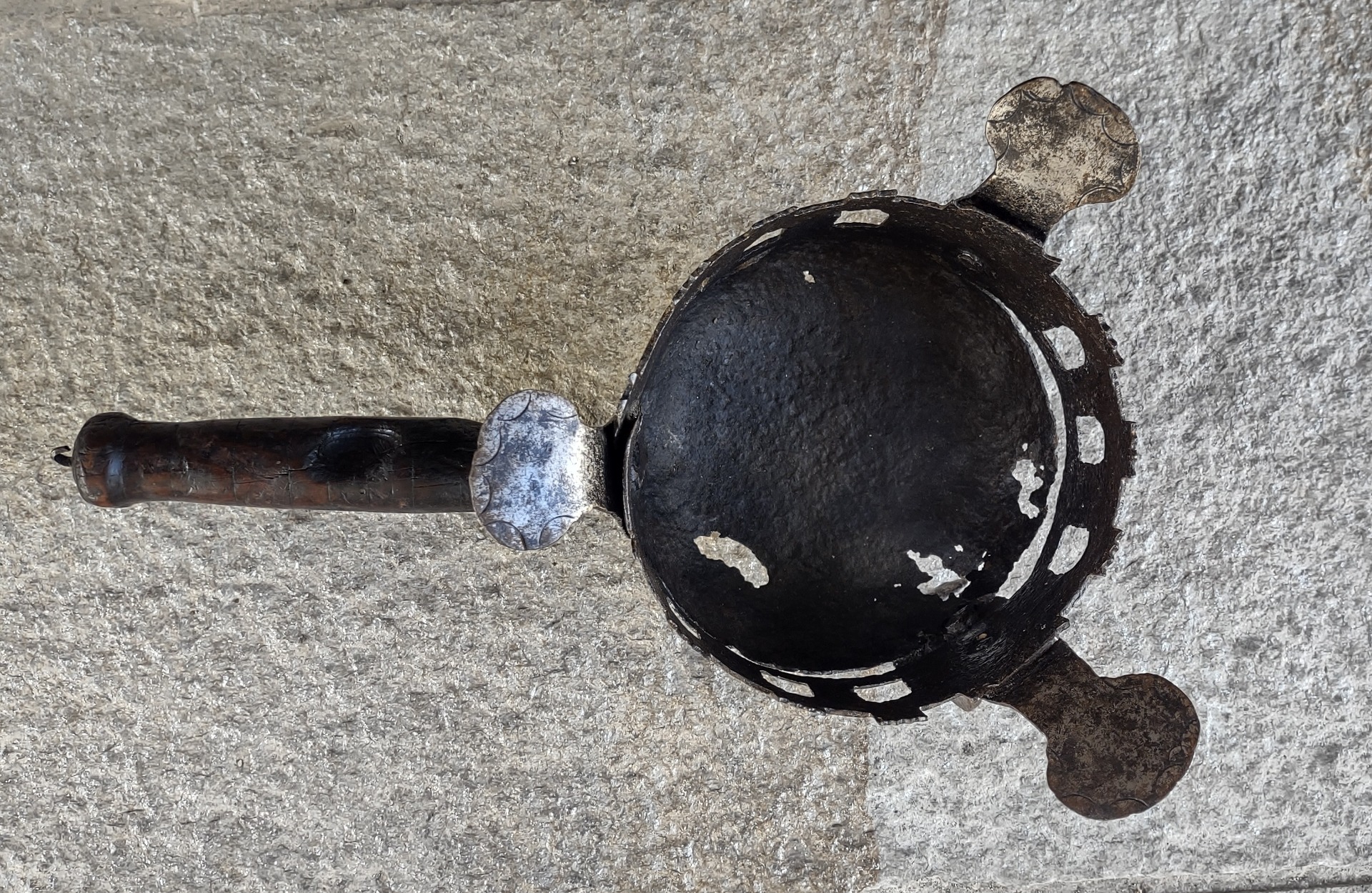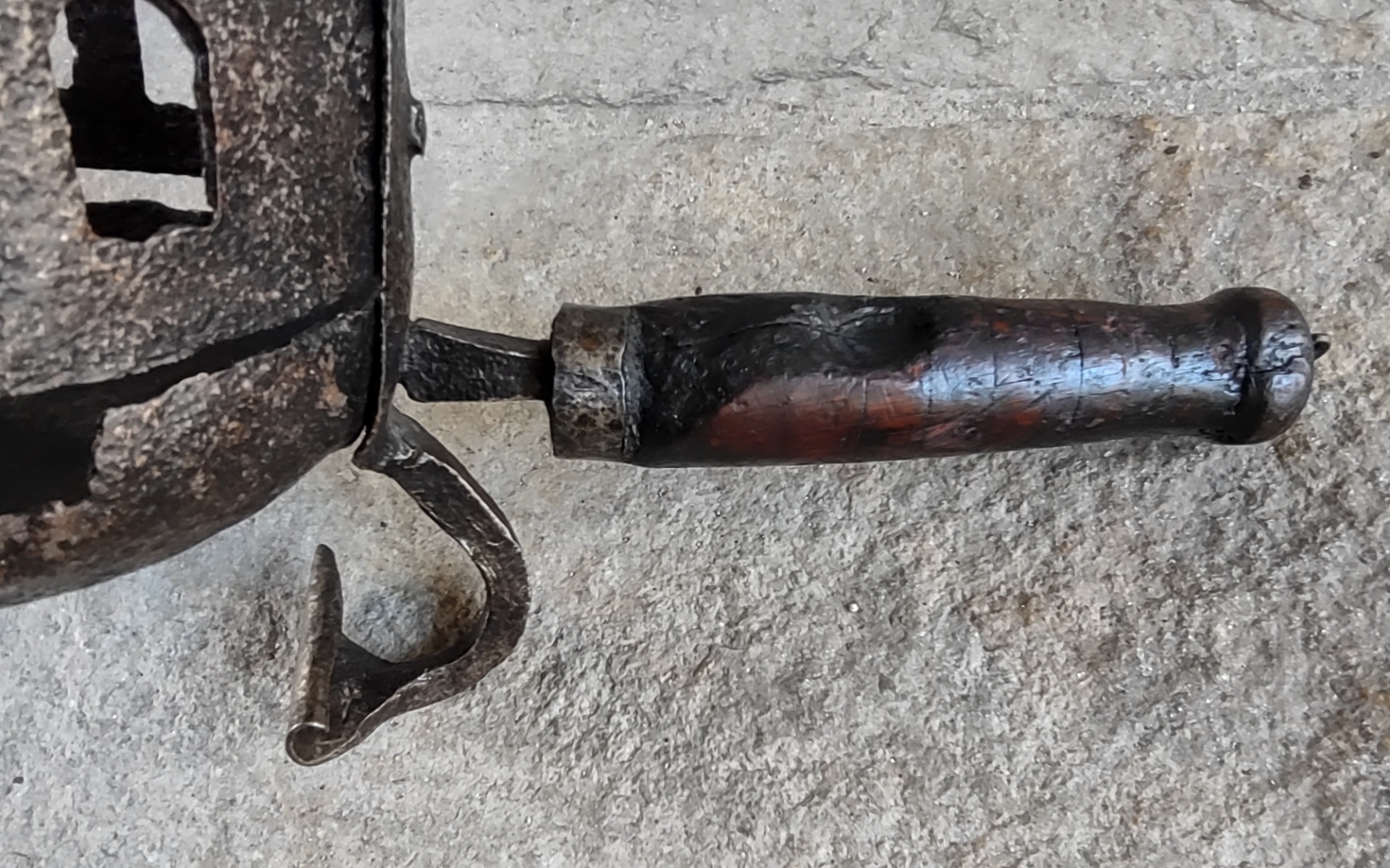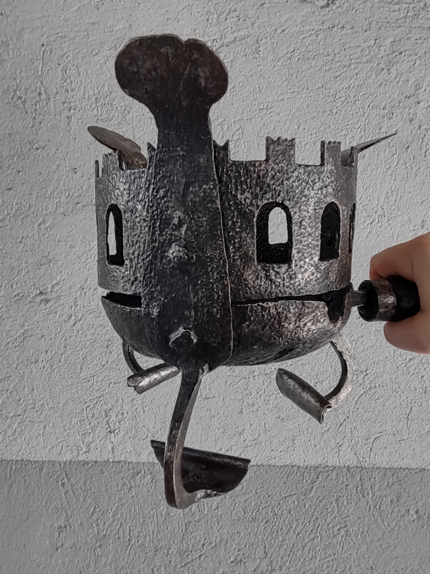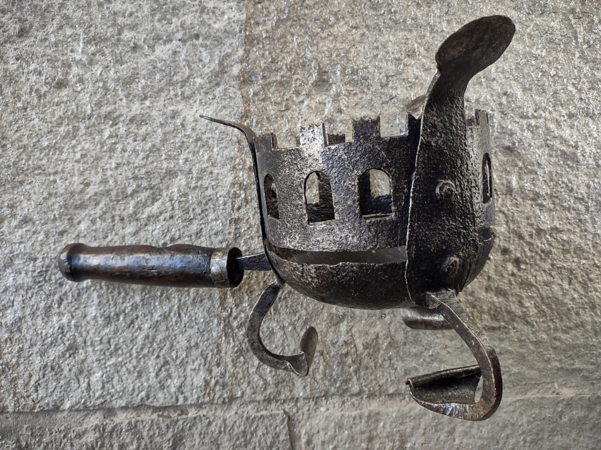 Splendido braciere a castello in ferro forgiato e traforato. Manico in noce originale.Il fondo presenta evidenti segni di usura a causa dell'epoca e del calore delle fiamme.