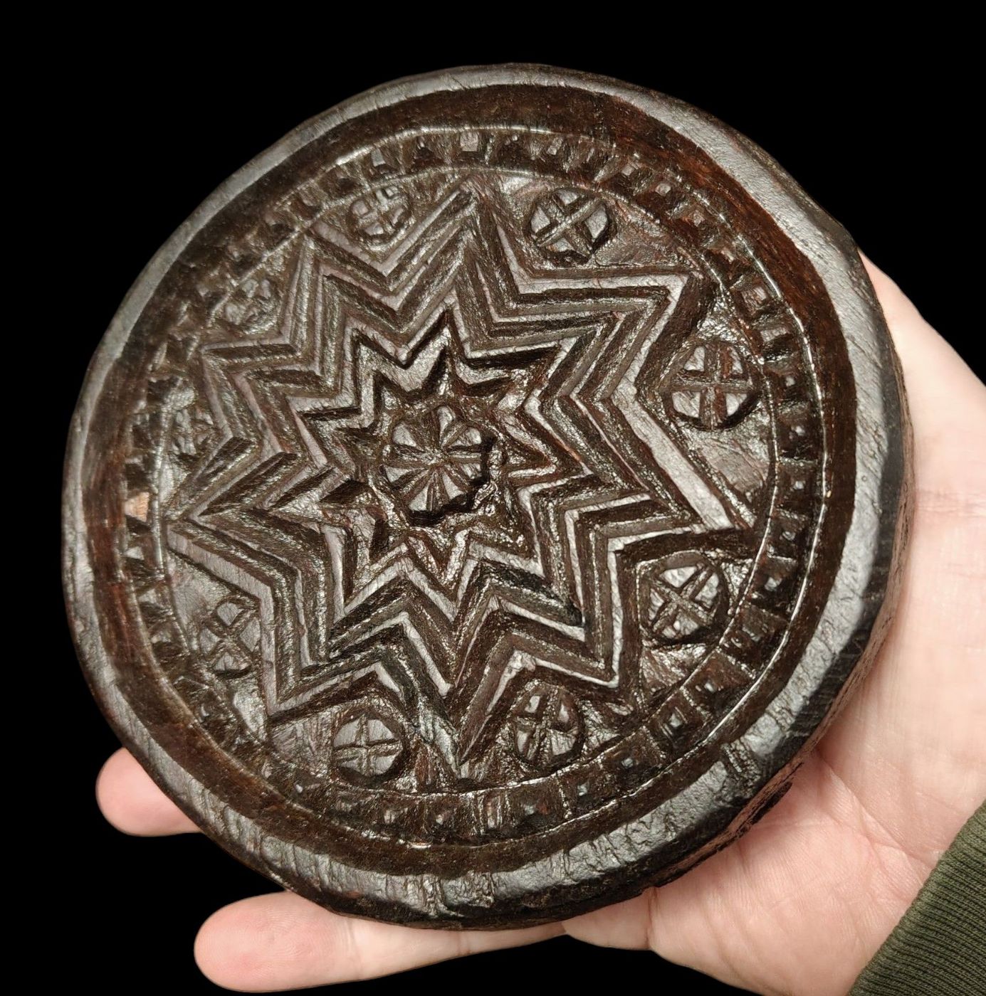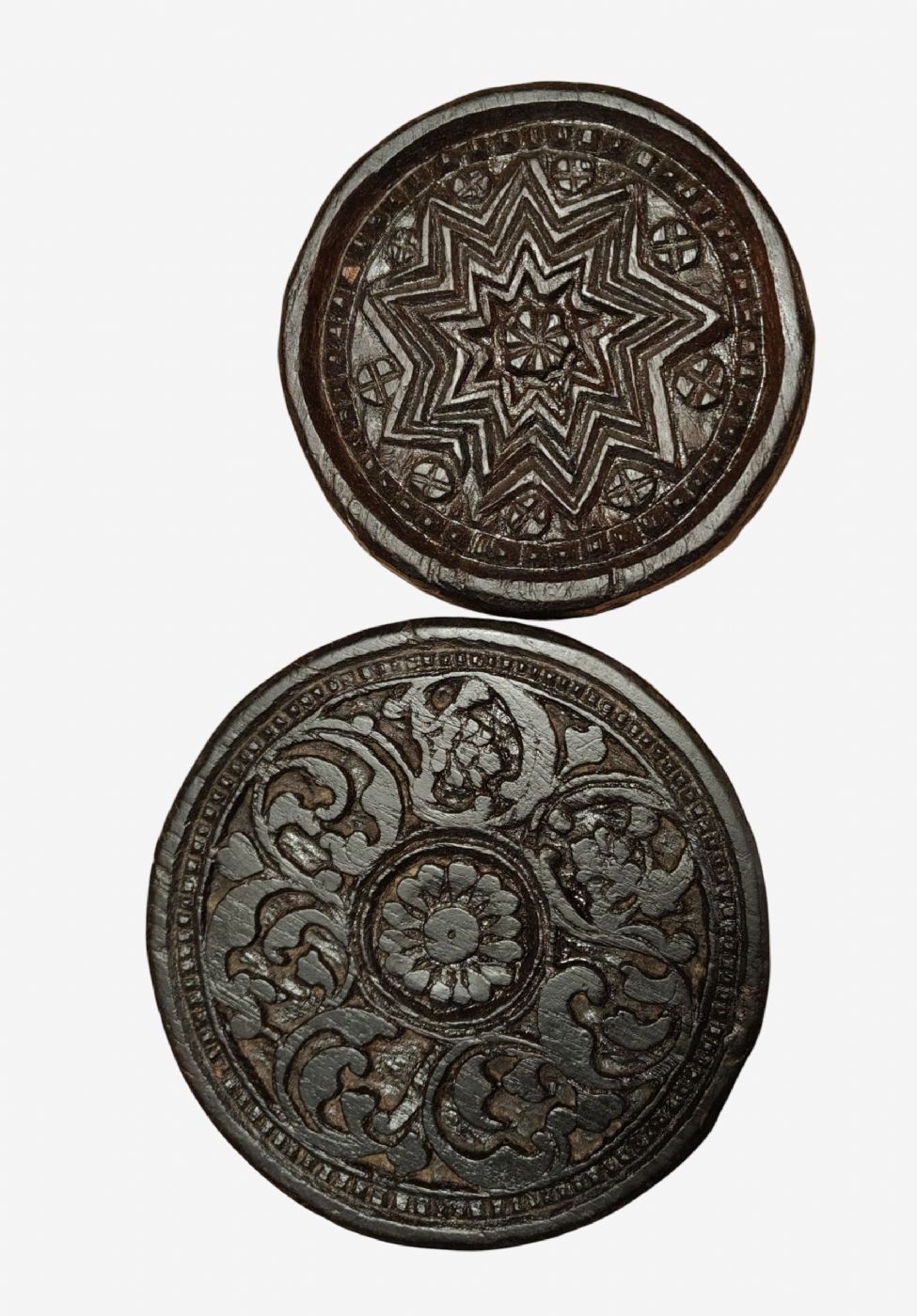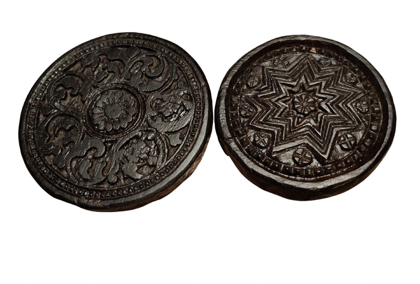 Due belle marche in legno rotonde.Una decorata con motivi geometrici, l'altra con motivi floreali (piccole mancanze). Provenienza collezione privata francese. DIametro 14,5-17. In vendita anche separatamente