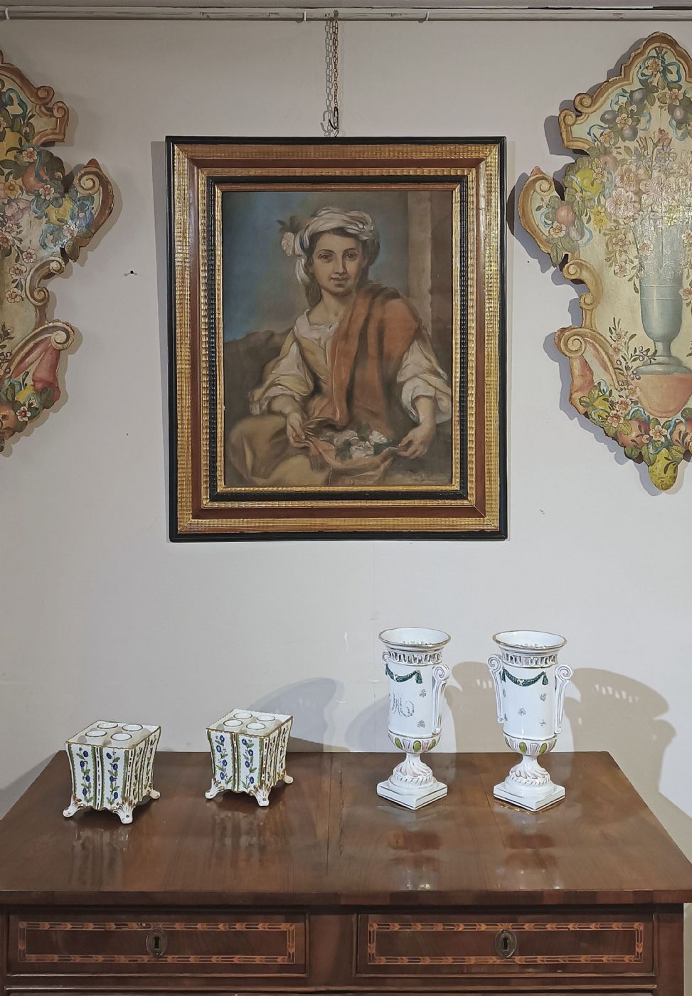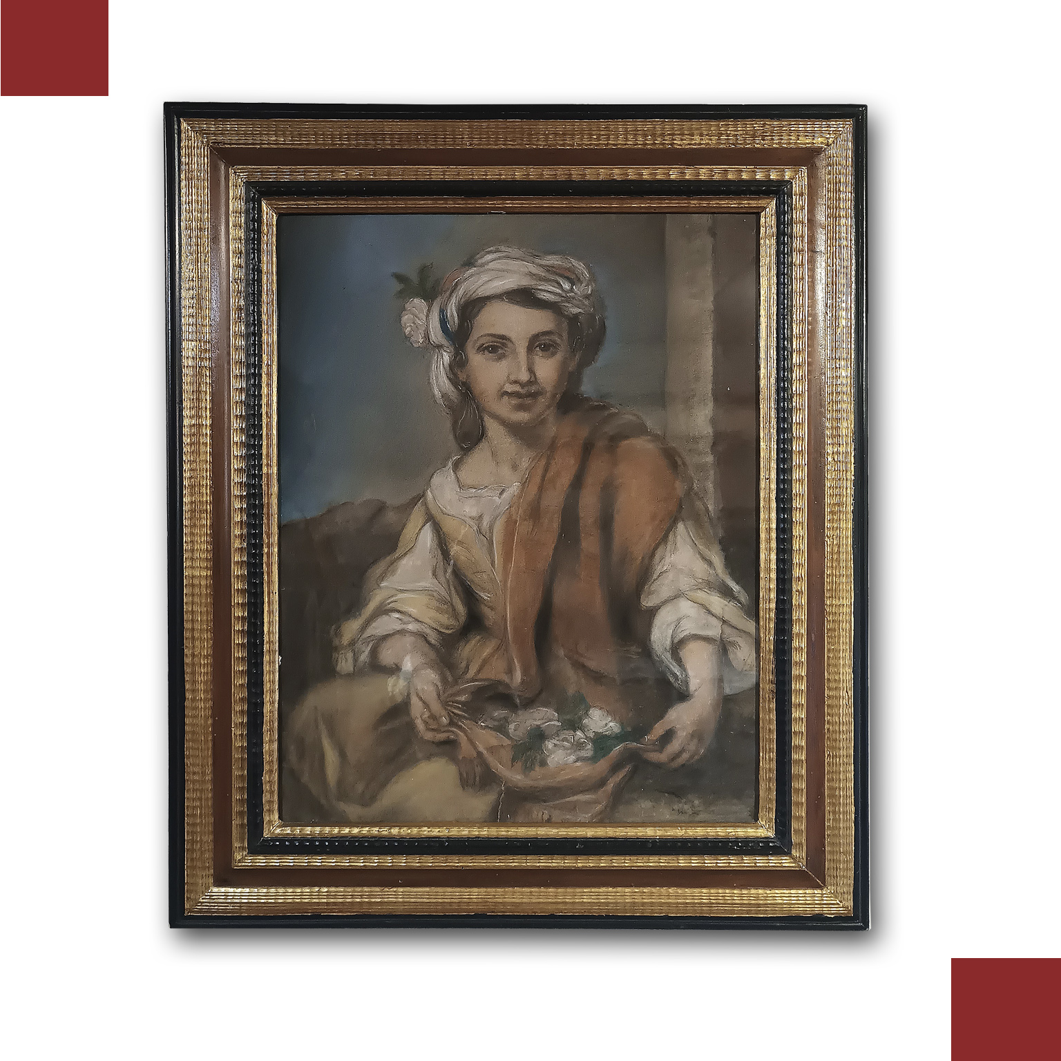 Elegante dipinto realizzato a pastello su carta, ed incorniciato in una cornice in legno laccato e dorato, protetta da vetro. Ispirato nella posa ad un celebre quadro del pittore spagnolo Murillo (1618-1682), raffigura una ragazza che mostra sullo scialle dei fiori, richiamando anche un’allegoria della primavera. La figura femminile è rappresentata in primo piano, frontale, seduta sul basamento di un edificio di cui si intravedono appena i dettagli nello sfondo. La ragazza ha uno sguardo giocoso e felice, rivolto direttamente verso lo spettatore. È vestita in stile orientale, con il capo coperto e adornato di fiori, e indossa un abito di raffinata fattura. Si tratta di un’opera apprezzabile per la sua tecnica e resa stilistica, nei dettagli e nei particolari, capace di conferire un tocco di eleganza e di antichità a qualsiasi ambiente. Manifattura italiana della metà del XIX secolo.