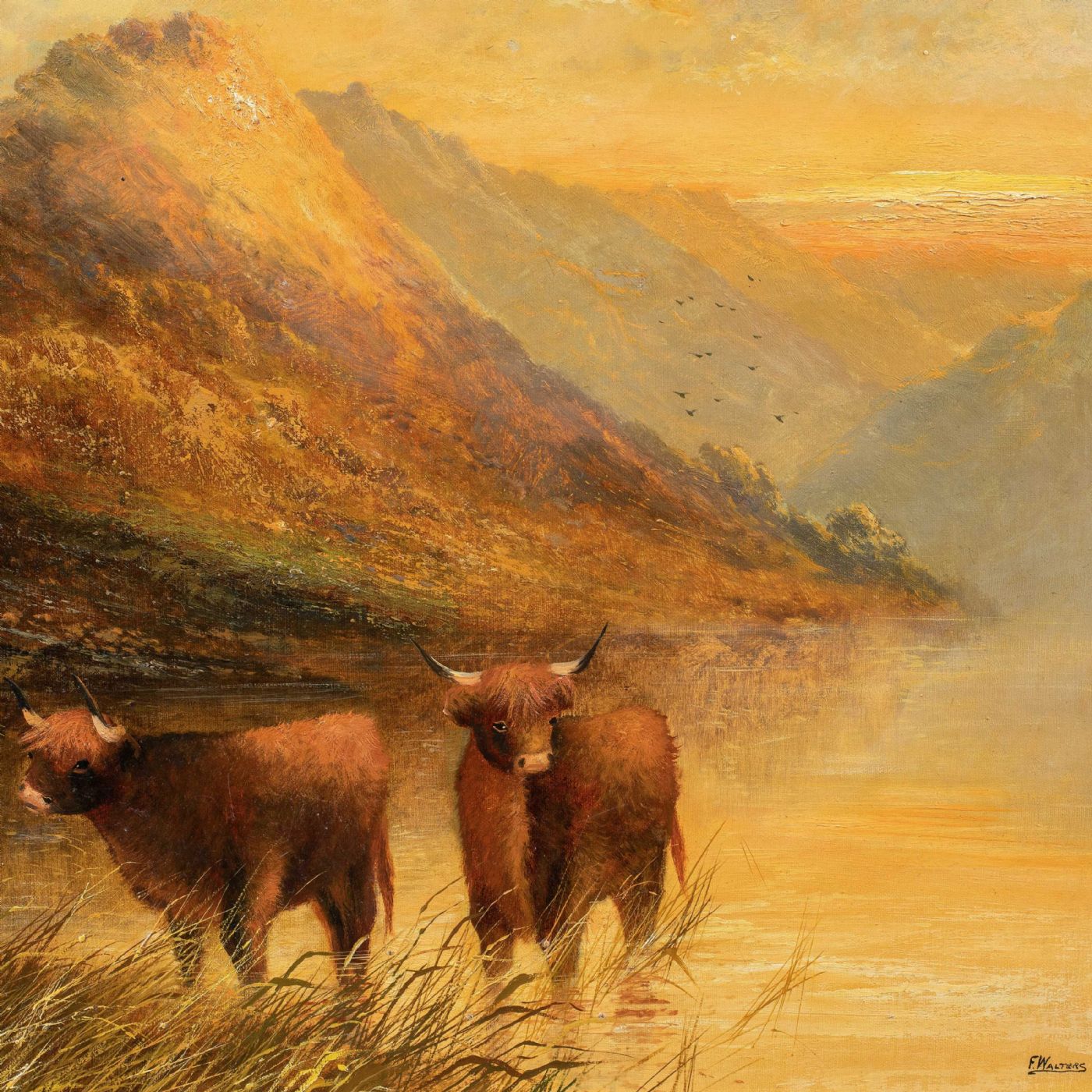 Frank Walters (British, fine XIX sec.) - Bestiame delle Highlands al lago.
