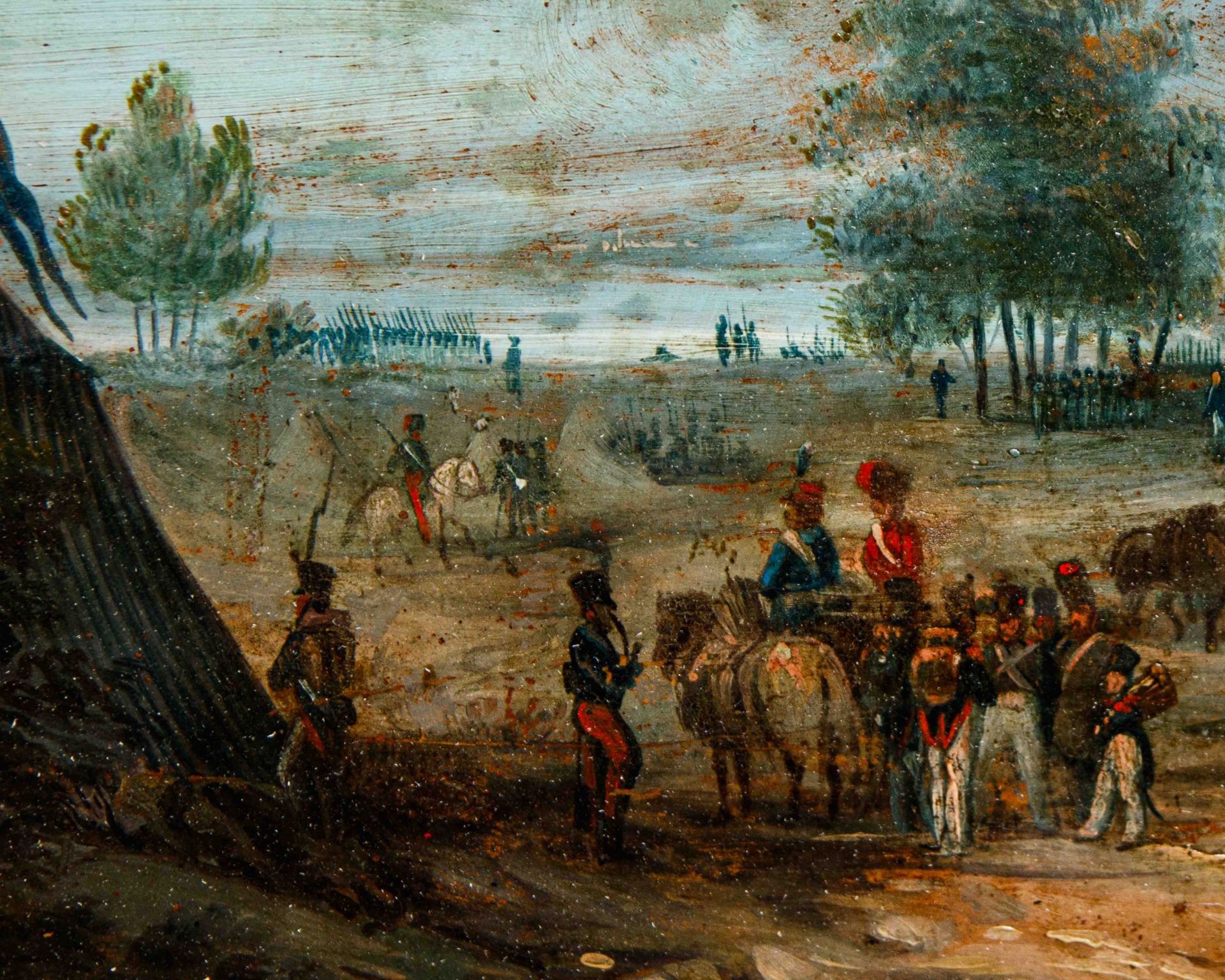 Queste due piccole tavole rappresentano scene di accampamento in cui i soldati si riposano o si preparano allo scontro nel corso di una campagna bellica. Le ambientazioni appaiono distinte da un punto di vista sia paesaggistico sia climatico: i cappotti lunghi indossati dalle truppe radunate attorno al fuoco per riscaldarsi fanno pensare alla stagione fredda mentre il cielo soleggiato, le divise leggere e la vegetazione verdeggiante dell’altra tavola portano a pensare ad un periodo più mite dell’anno. Le differenze tonali, più fredde da una parte e più chiare e tiepide dall’altra, sembrano sottolineare questa distinzione che si sviluppa anche nelle azioni dei personaggi: alla staticità delle reclute radunate attorno al falò riparato dai muri di un edificio in rovina si contrappone il movimento operoso degli uomini d’arme, dislocati sia in primo piano che in lontananza, intenti ad allestire e prepare i bivacchi. Si potrebbe pensare a due momenti separati ma facenti parte della stessa campagna, da collocare cronologicamente agli inizi dell’Ottocento e da identiificare con una delle campagne dell’esercito francese: le tende, il blu e il bianco delle divise, i cappelli e i berretti dei soldati e le baionette si configurano con quelli utilizzati dagli eserciti di napoleonico nelle guerre combattute in Europa fra il 1803 e il 1815. Austerliz (1805), Jena (1806), Wagram (1809), la campagna di Russia intera sono solo alcuni dei possibili scenari bellici in cui si potrebbero collocare le scene di accampamento qui raffigurate. Il paesaggio è l’indiscusso protagonista sebbene le figure umane, abbozzate con rapidi e densi colpi di colore, si ritagliano una parte che non è solo di comparsa: i due soldati sdraiati in primo paino raccontano di una effimera spensieratezza nonostante la tragicità e le fatiche delle guerre mentre l’uomo con baionetta voltato di spalle ci fa soffermare a riflettere sul futuro che attende lui e i suoi compagni. I colori sono stesi a pennellate più larghe, materiche e corpose nella resa del cielo e del paesaggio in generale, riuscendo a mescolare, fondere e uniformare il tono generale della composizione, in cui si possono comunque apprezzare i colori cangianti a seconda del grado di illuminazione, delle nuvole o dei fumi o del tipo di vegetazione.