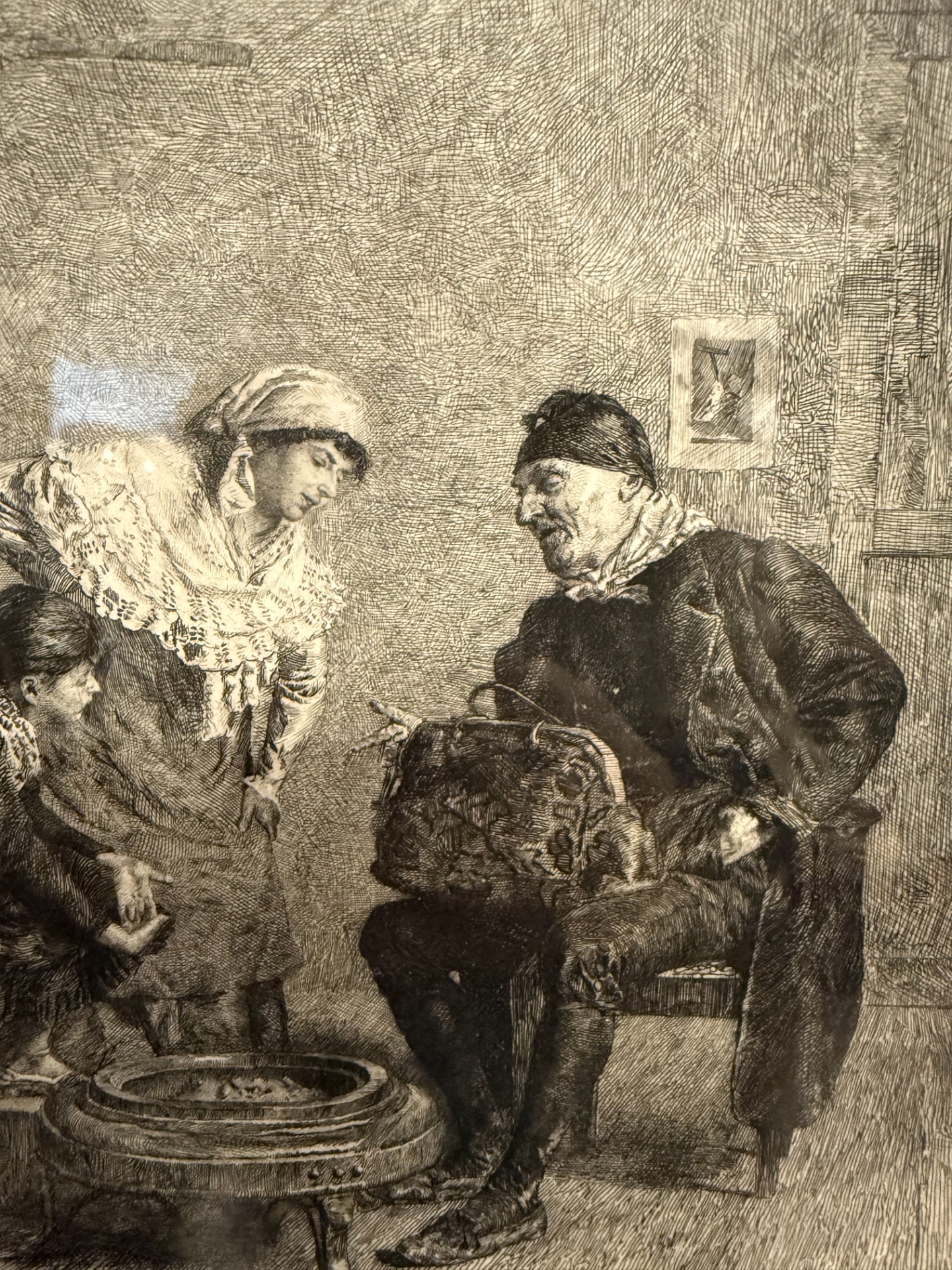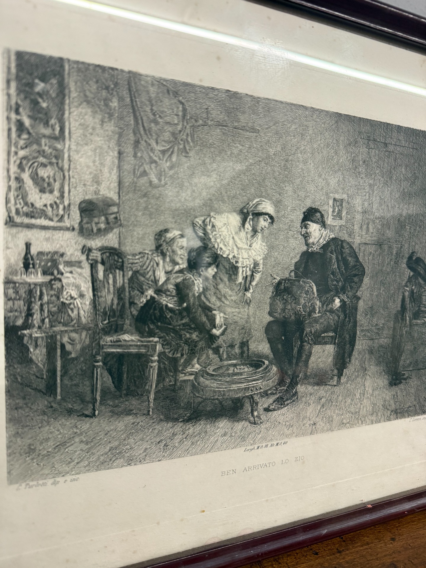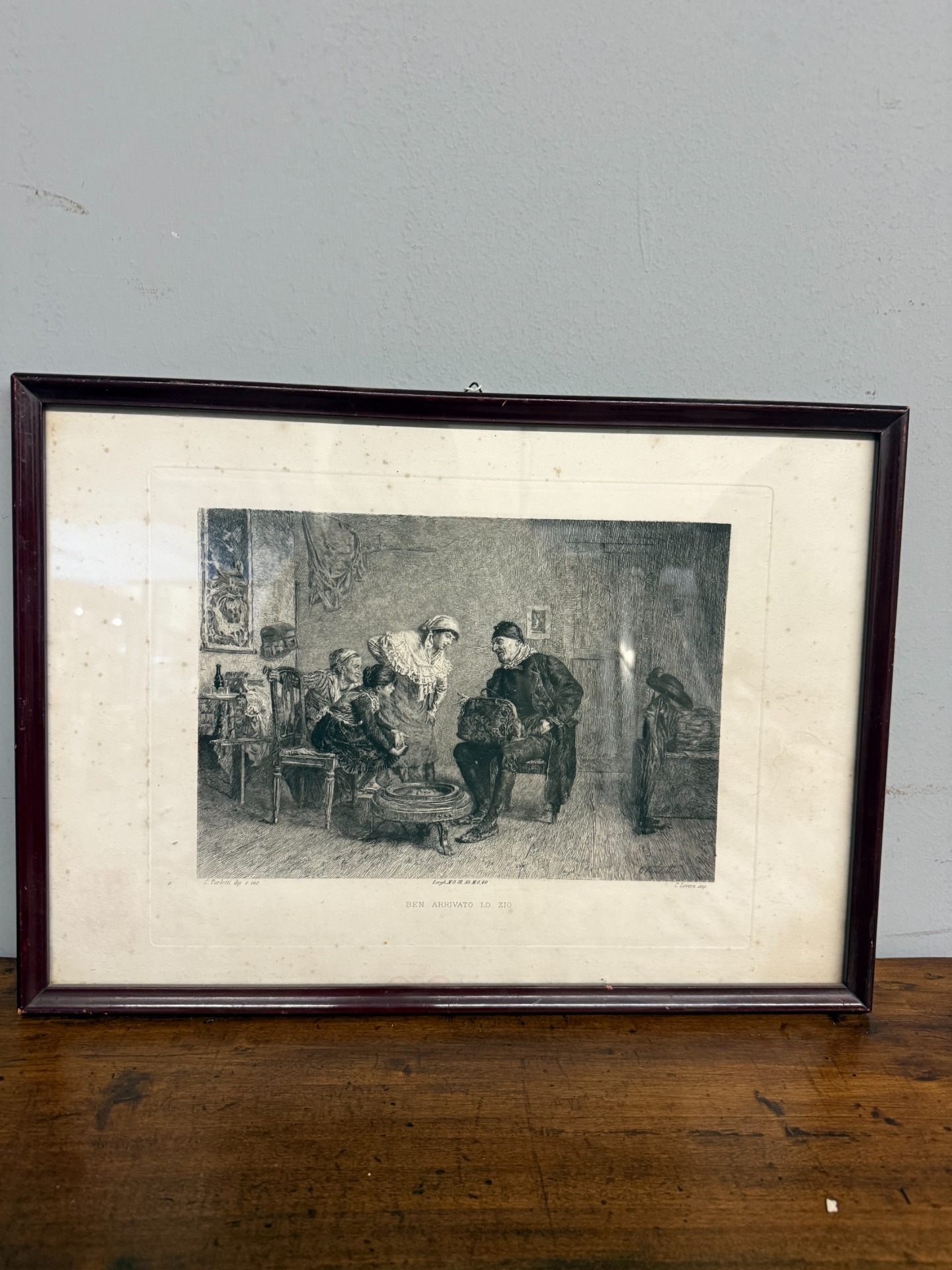 Antica incisione '800 Celestino Turletti. Ben arrivato Lo Zio, 44x32cm