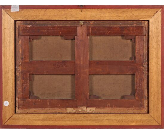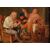 Olio su tela raffigurante una scena ambientata all'interno di una taverna, dove tre uomini fumano e bevono. La cornice risale ad epoca successiva.