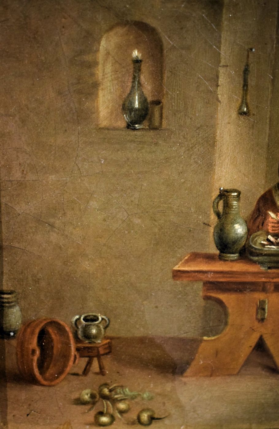 Eseguito ad olio su tavoletta da un valido artista del XIX° secolo, il dipinto segue i dettami dei grandi Maestri fiamminghi, tra i quali si distinsero i celebri Teniers Padre e Figlio.