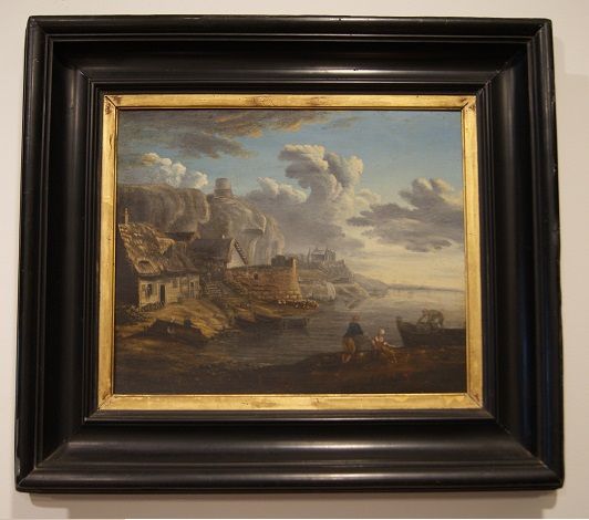 Olio su tavola francese di metà 1800 con cornice ebanizzata coeva. Raffigurato un villaggio di pescatori con personaggi, sullo sfondo posto su di un'altura un castello.