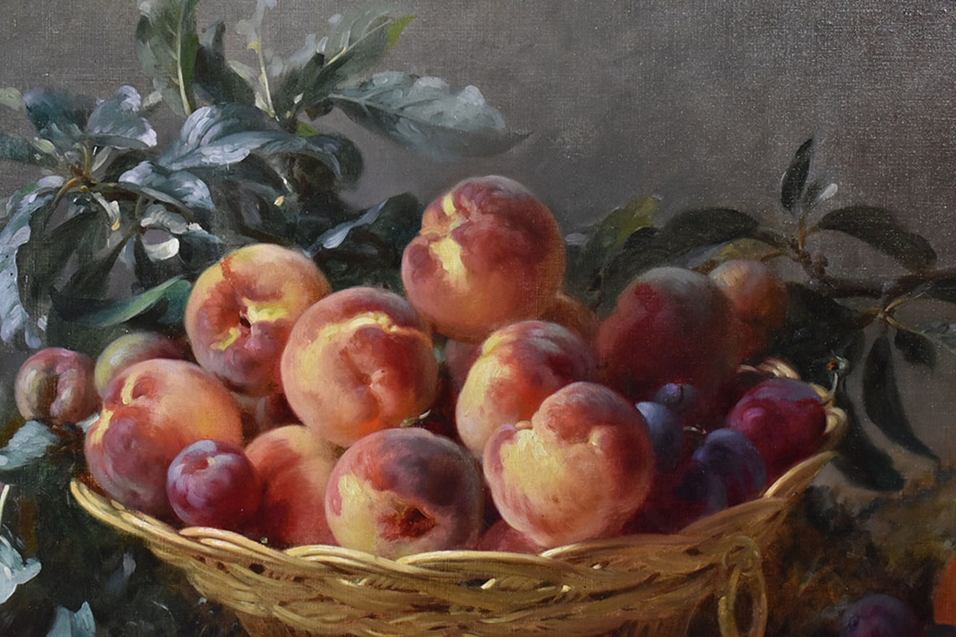 Si tratta di una piacevole e raffinata natura morta con un cesto di pesche e prugne, dipinta con grande maestria.