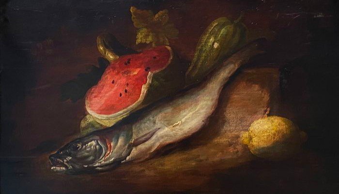 NATURA MORTA CON COCOMERO E MERLUZZO 800 OLIO SU TAVOLA