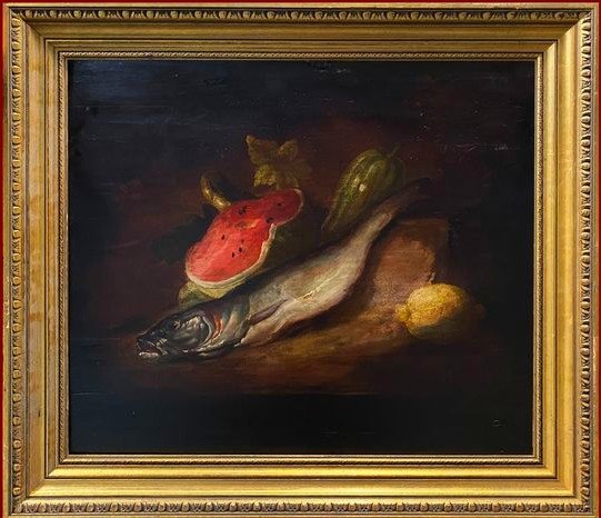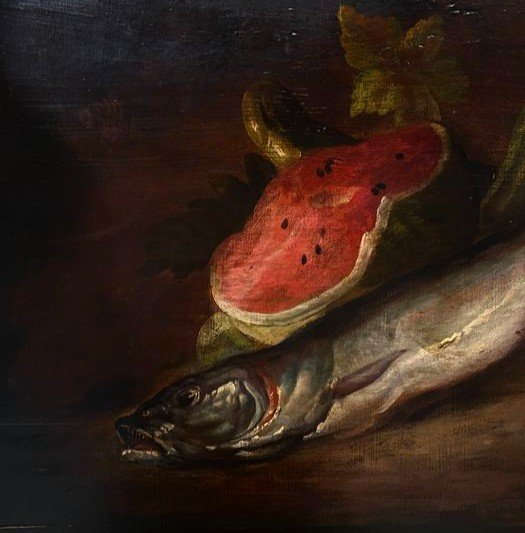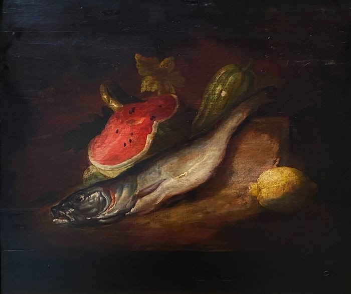 NATURA MORTA CON COCOMERO E MERLUZZO 800 OLIO SU TAVOLA
